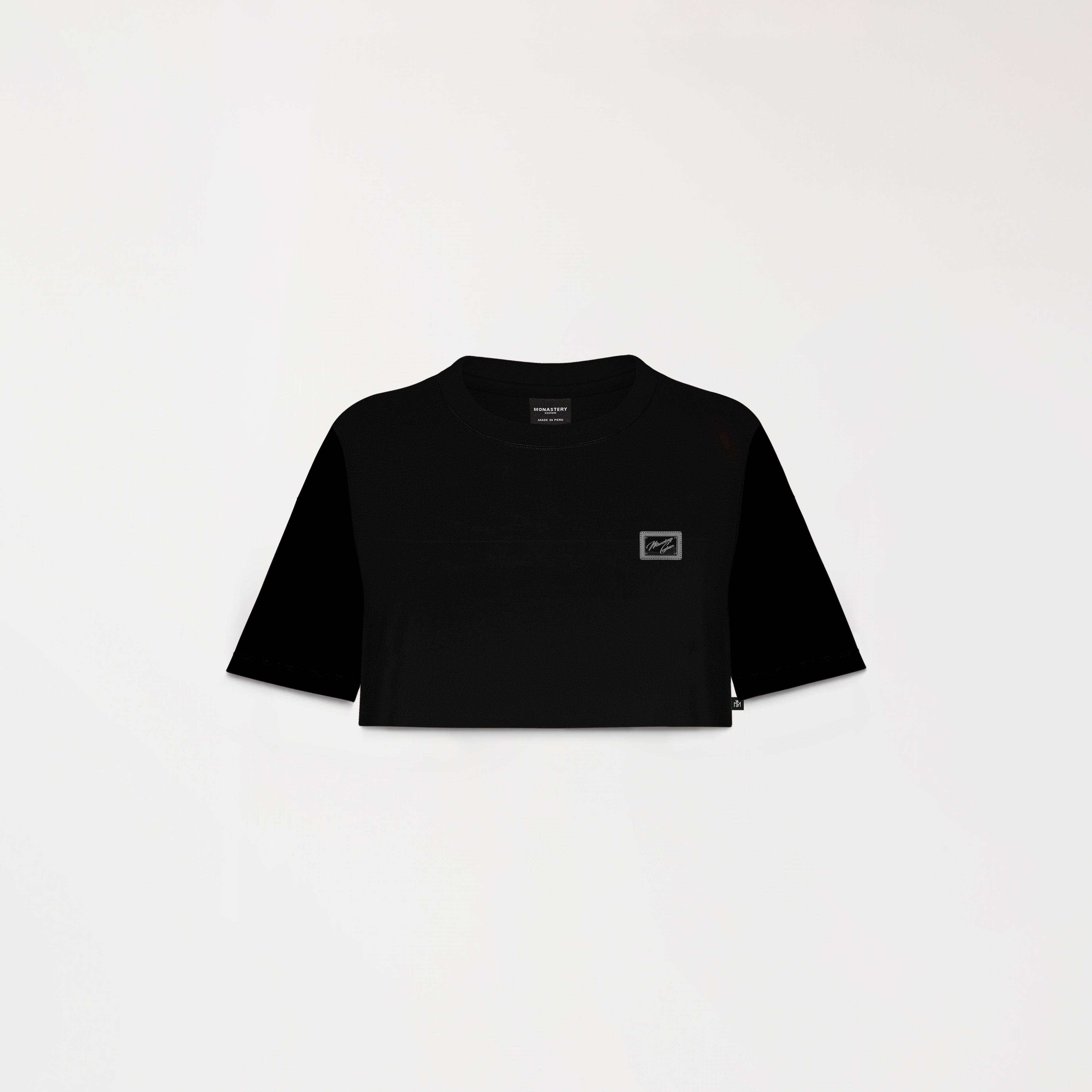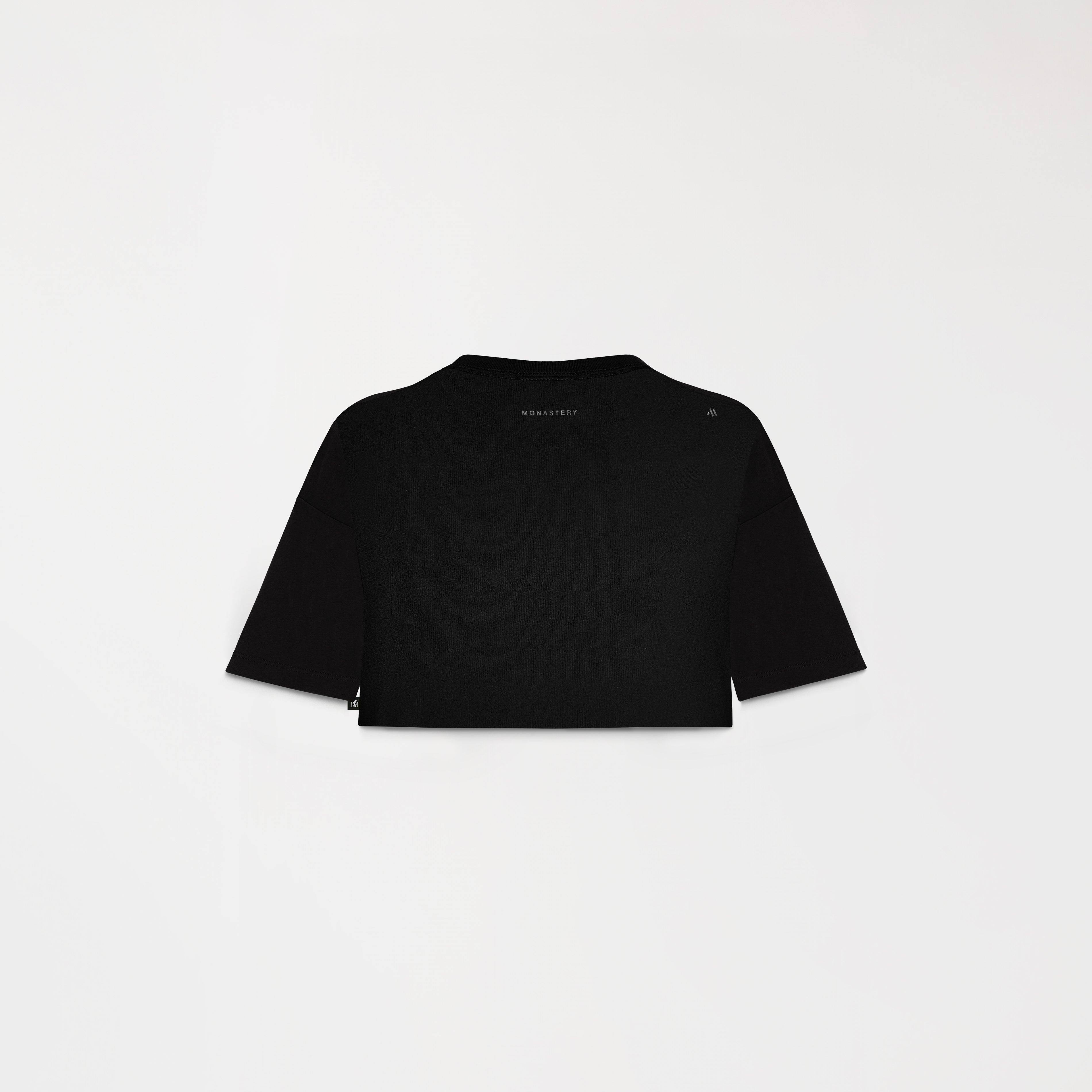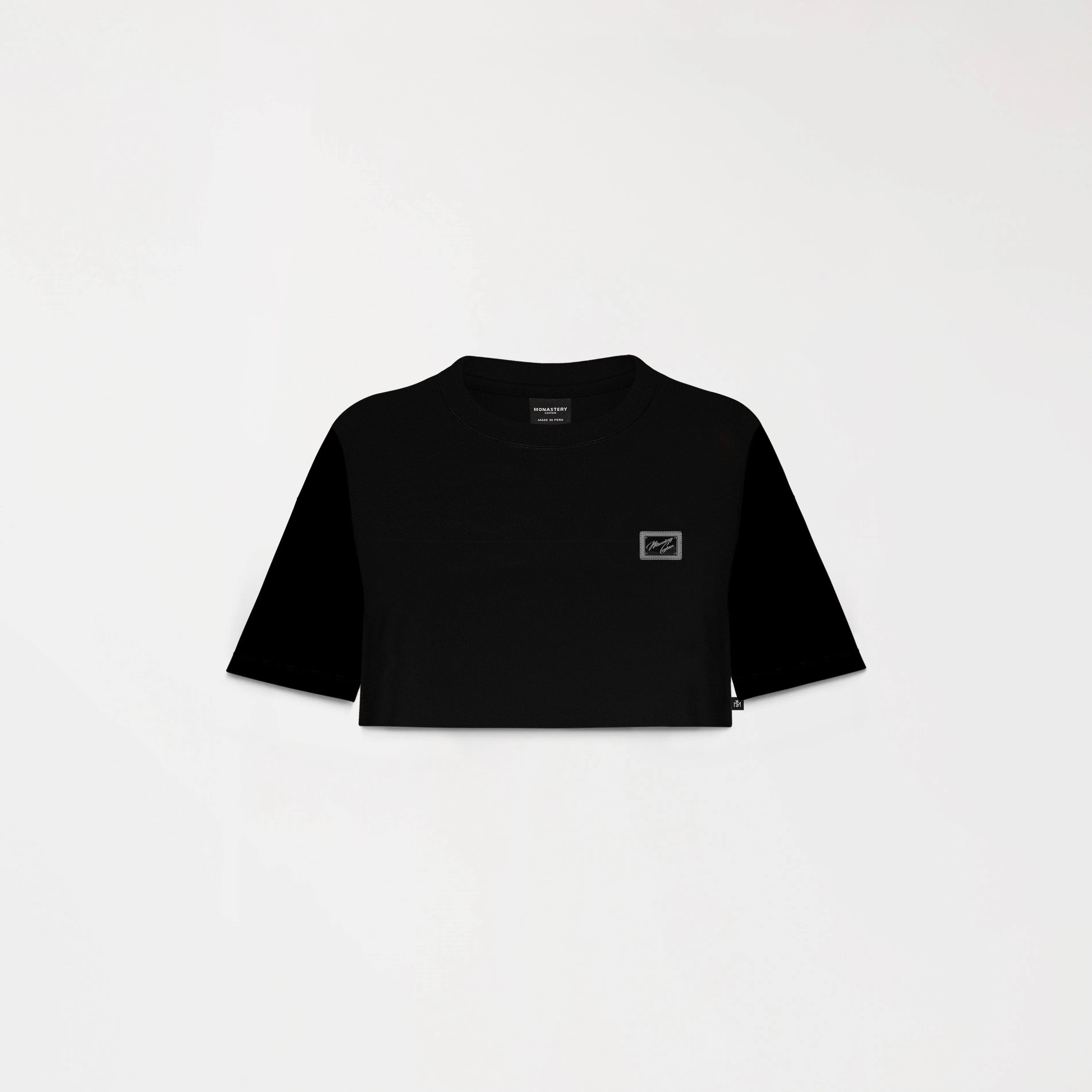 Crop top femenino en algodón 100% exclusivo para Monastery, elaborado en silueta pequeña. Gaterlen negra cuenta con placa metálica tono a tono contramarcada Monastery Couture, Este crop top es ideal para atuendos casuales de alto nivel, combinando con elementos que resaltan la identidad de la marca, estampado en posterior con Monastery y logo insignia tono a tono en alta densidad.
