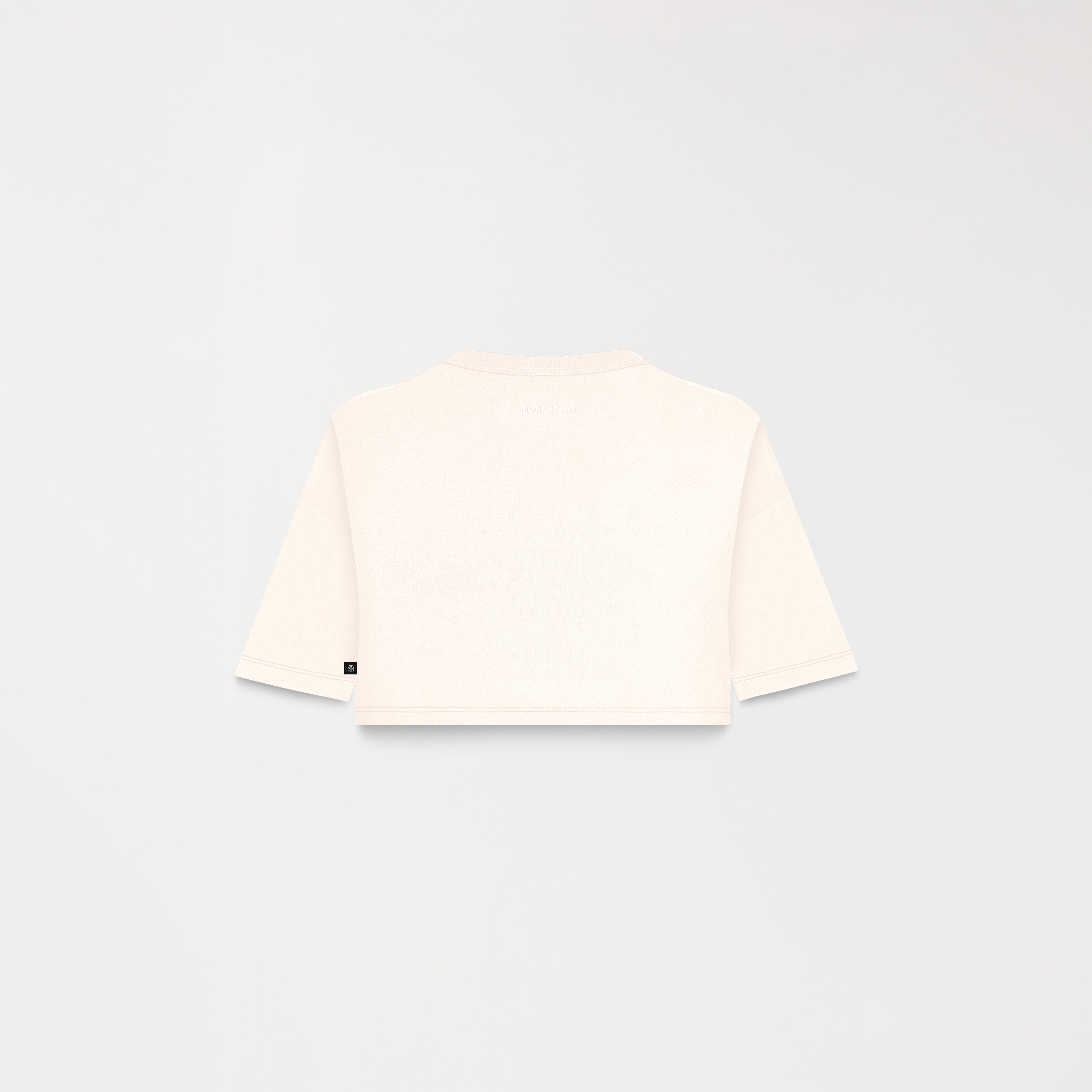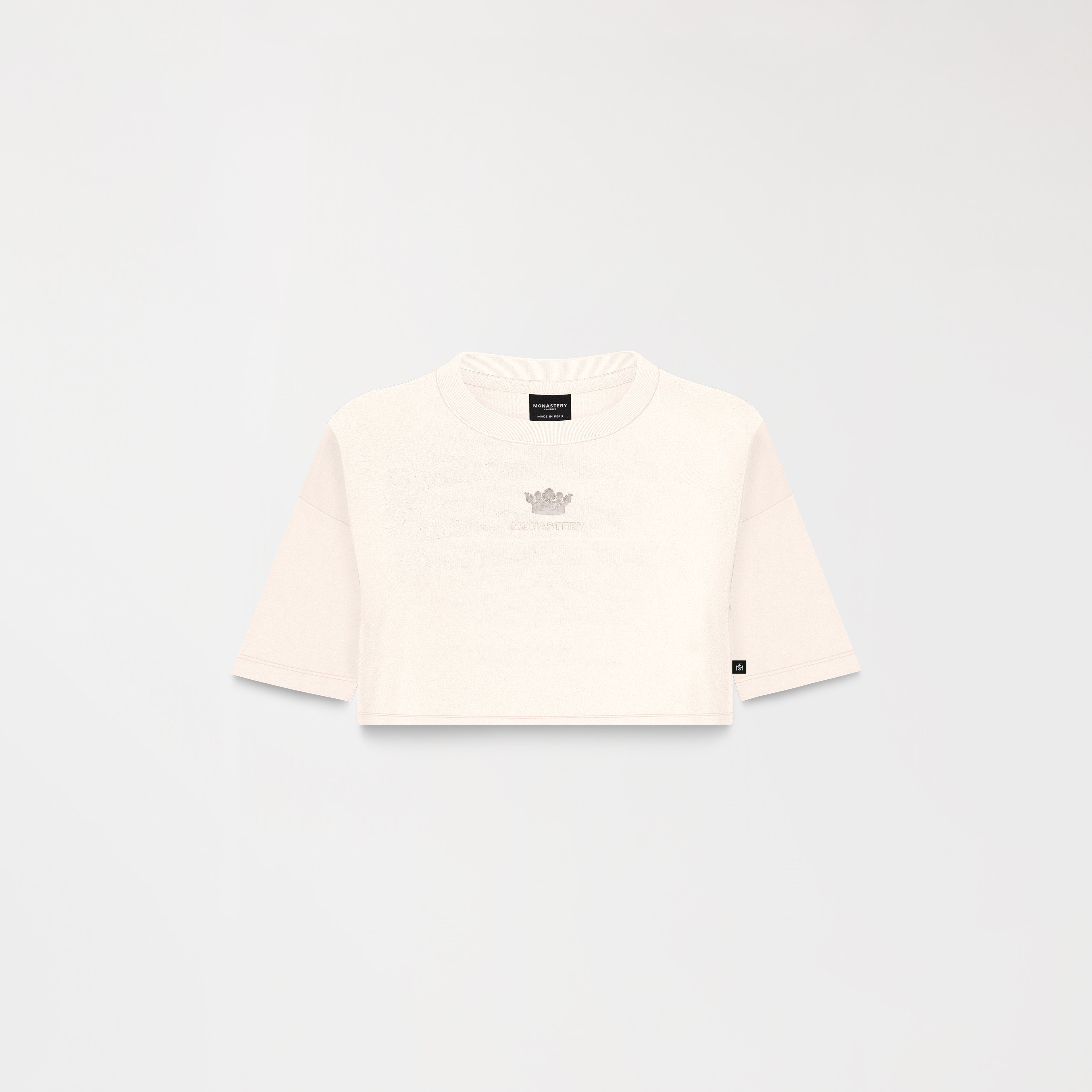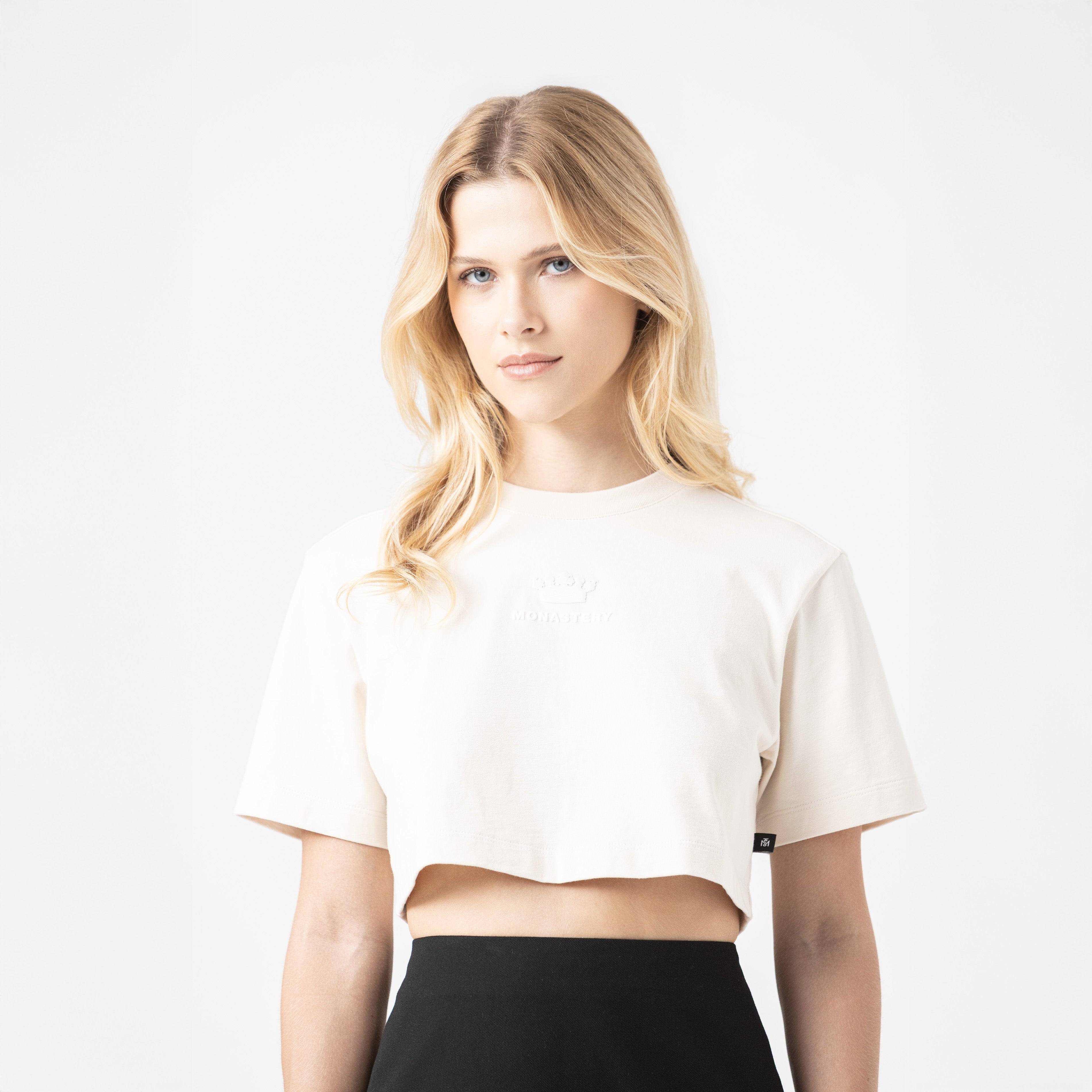 Crop top para mujer en algodón peruano exclusivo para Monastery, elaborada en silueta pequeña, Su corte holgado y corto lo hace ideal para un look fresco y casual. Con un color beige neutro y detalles en contraste, es una prenda versátil que se adapta a diversas ocasiones, Esta prenda presenta en frente un arte exclusivo para la colección The King y nuestro icónico logo Monastery en técnica flock, este crop top es ideal para quienes buscan un look cómodo y sofisticado gracias a su gran base textil y diseño.