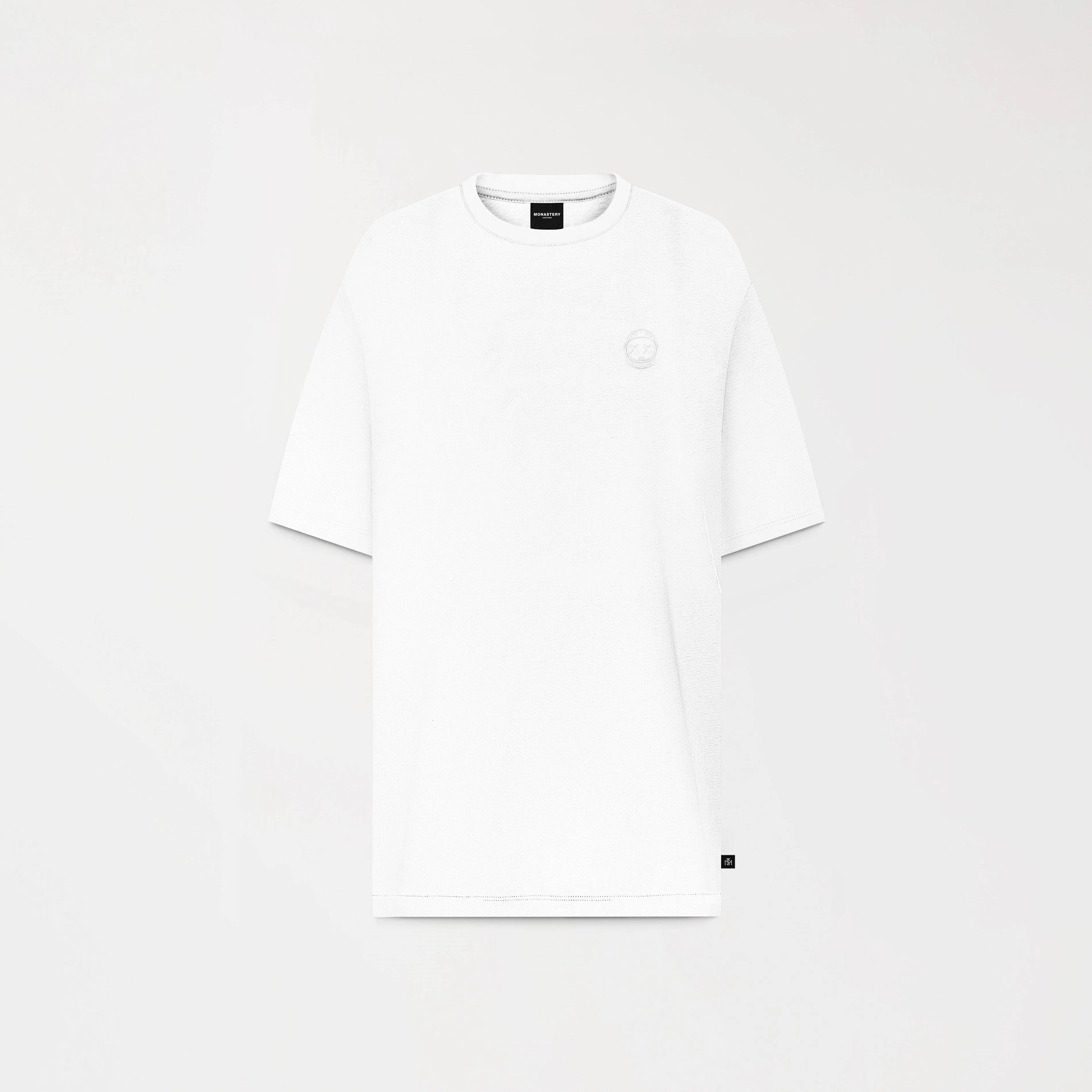Camiseta Oversized blanca para hombre, confeccionada en una base textil exclusiva para Monastery, esta camiseta destaca por su arte de nuestro logo "Phillip" bordado en 3D ubicado en punto corazón, aportando un toque distintivo y moderno. En la parte posterior, el logo "Phillip" también se presenta estampado en tramas, complementado con el logo insignia en alta densidad. Ideal para un look cómodo y estilizado, perfecto para el uso diario.