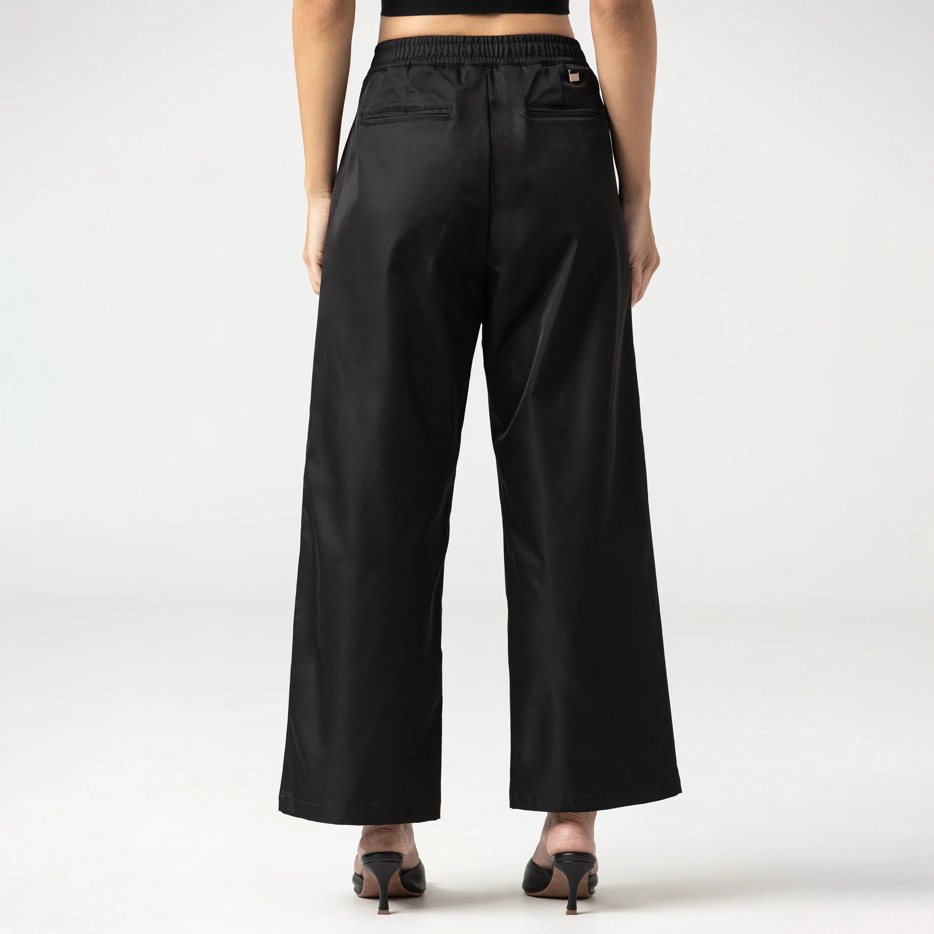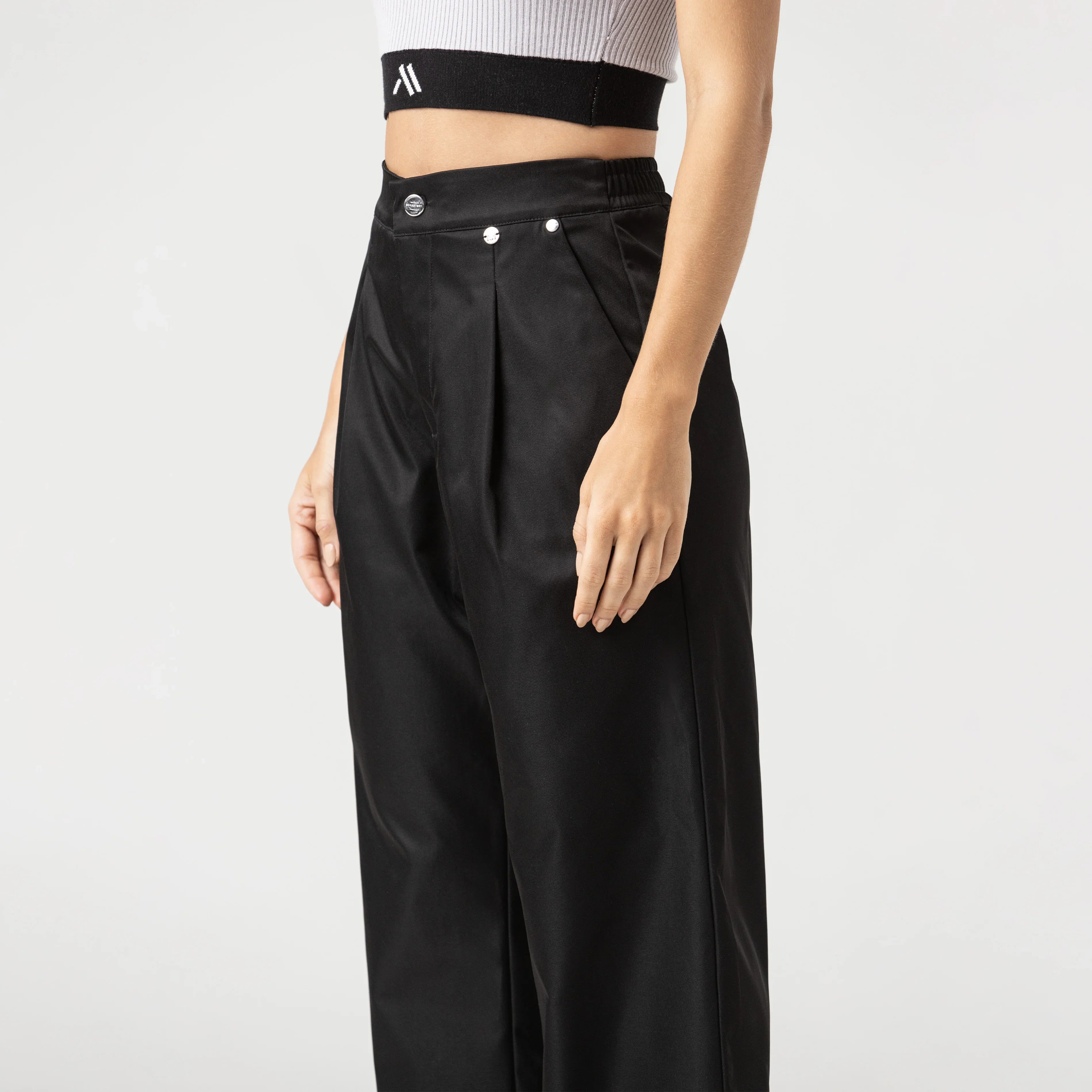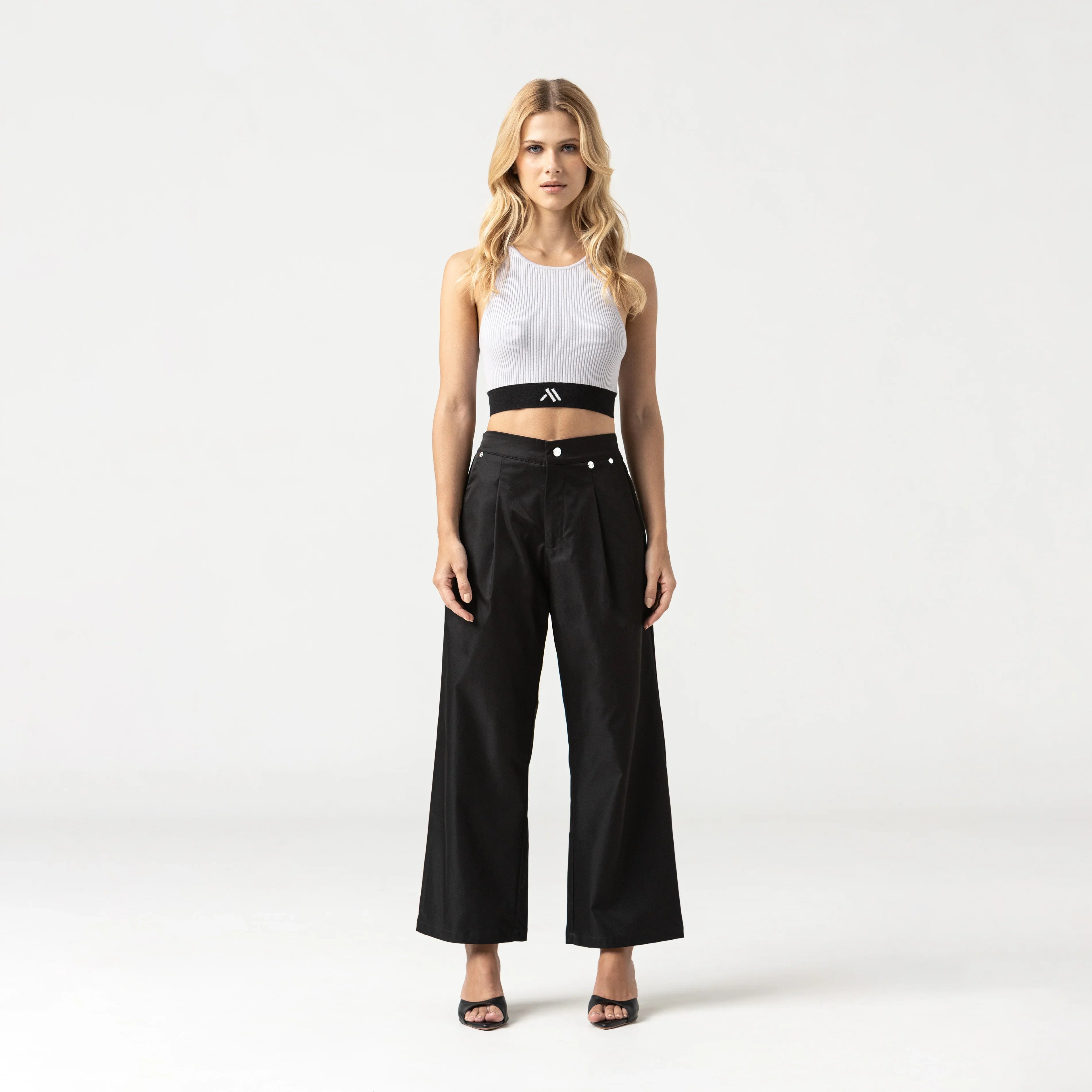 Pantalón para mujer silueta amplia elaborado con la base textil Moretti que ofrece un ajuste cómodo y fluido. Está diseñado con un estilo moderno y versátil, ideal para quienes buscan comodidad sin sacrificar el diseño. En la parte frontal, destaca una placa metálica con baño de plata que aporta un toque distintivo de la marca. Los bolsillos agregan un toque práctico, mientras que el ribete en la parte posterior del pantalón le da un detalle elegante y sofisticado.