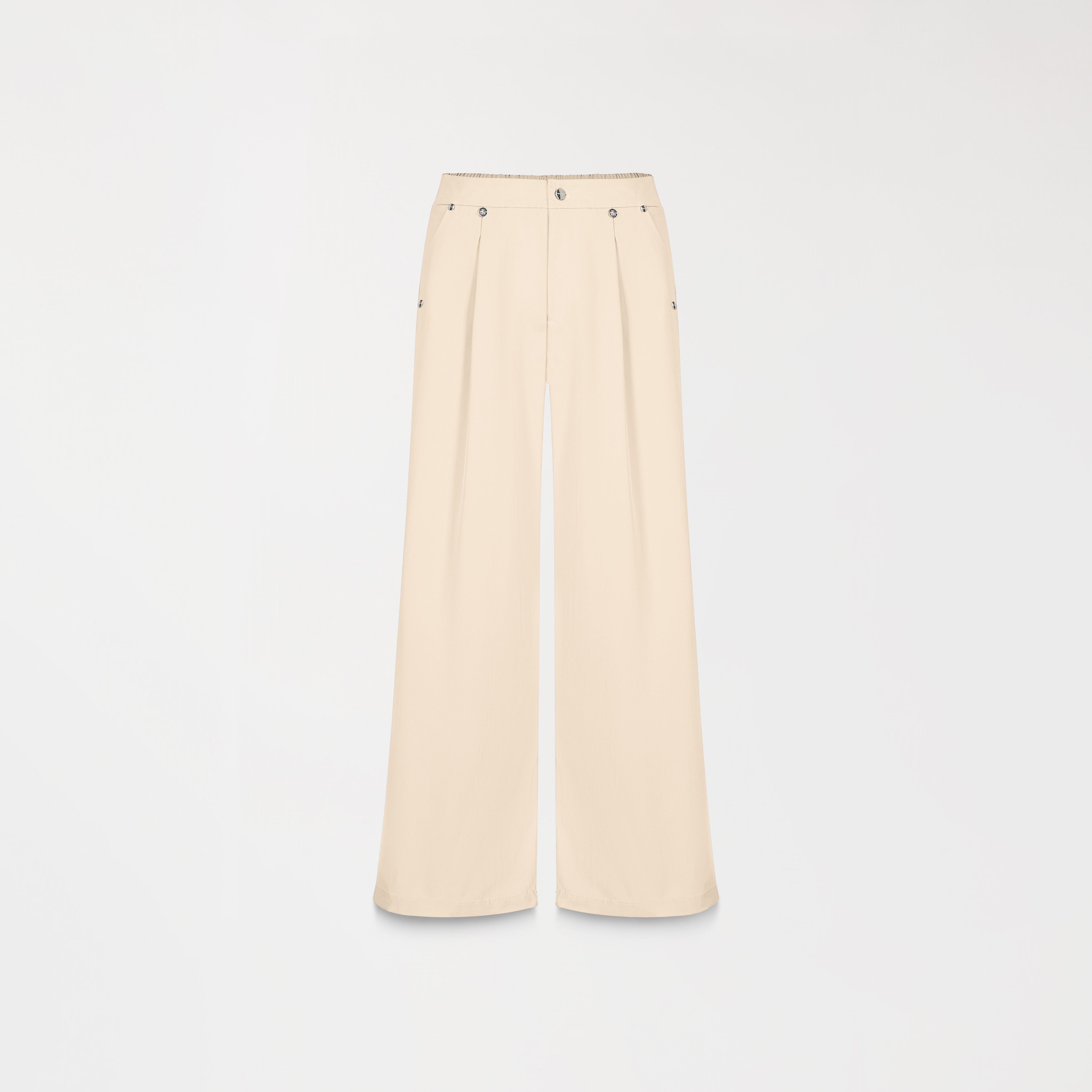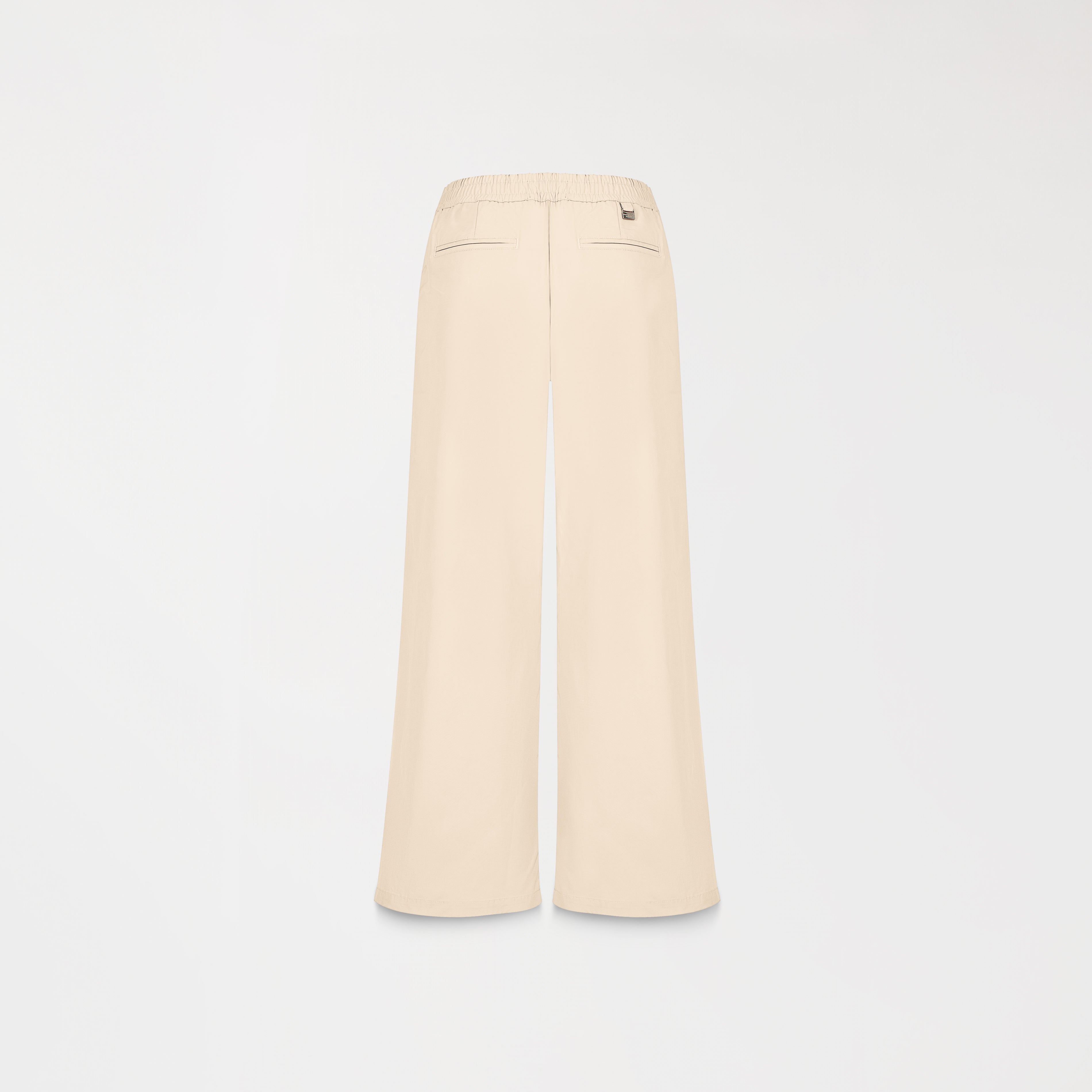 Pantalón para mujer silueta amplia elaborado con la base textil Moretti que ofrece un ajuste cómodo y fluido. Está diseñado con un estilo moderno y versátil, ideal para quienes buscan comodidad sin sacrificar el diseño. En la parte frontal, destaca una placa metálica con baño de plata que aporta un toque distintivo de la marca. Los bolsillos agregan un toque práctico, mientras que el ribete en la parte posterior del pantalón le da un detalle elegante y sofisticado.