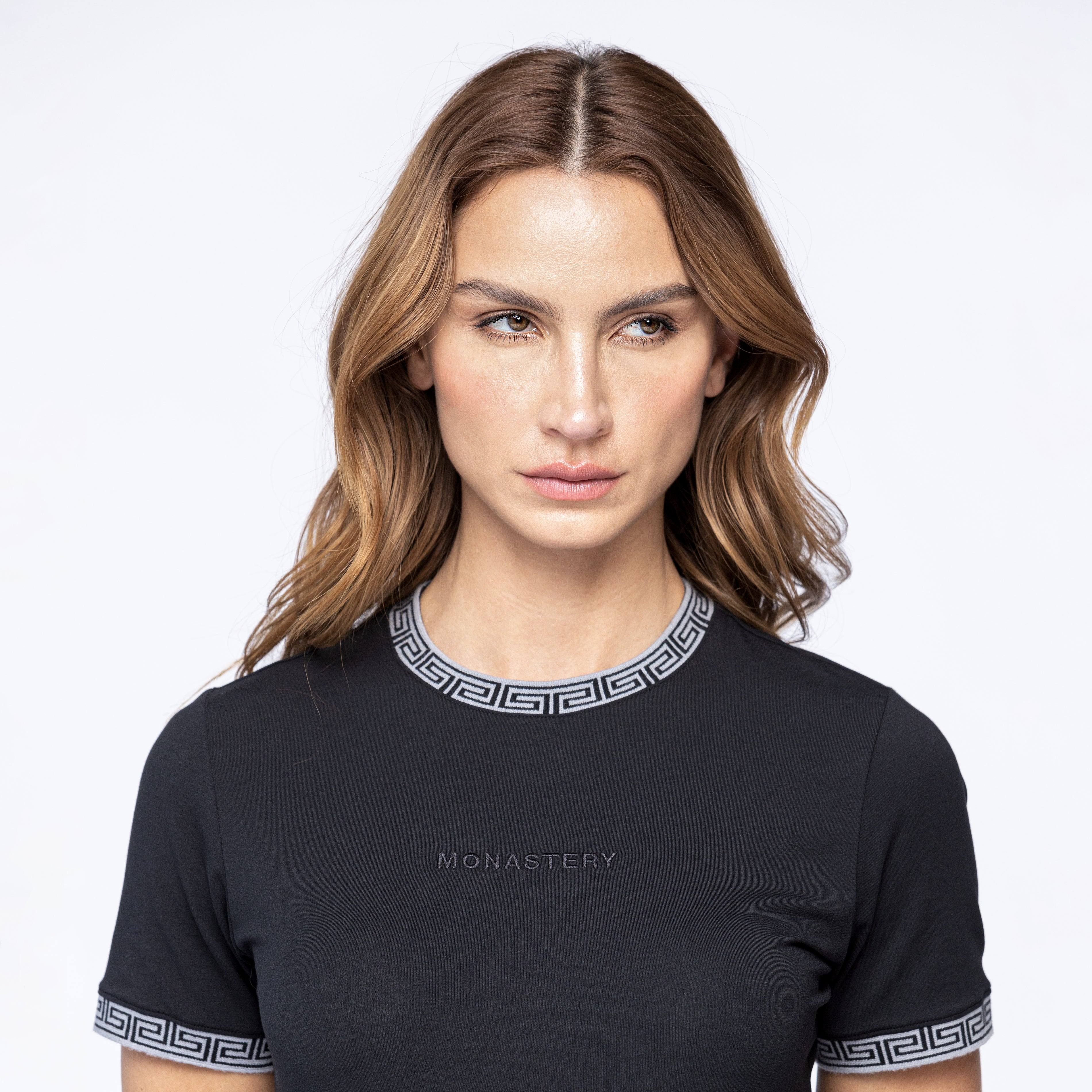 T-shirt femenina silueta ajustada elaborada en nuestra base textil premium cotton y elastano la cual brindan comodidad y moldean la silueta femenina, con cuellos y puños en tejido rectilíneo, acompañado de franjas con un destacado estilo dórico. Acompañado de un llamativo bordado tono a tono en el frente con espalda estampada tono a tono en alta densidad con los logos clásicos de la marca.