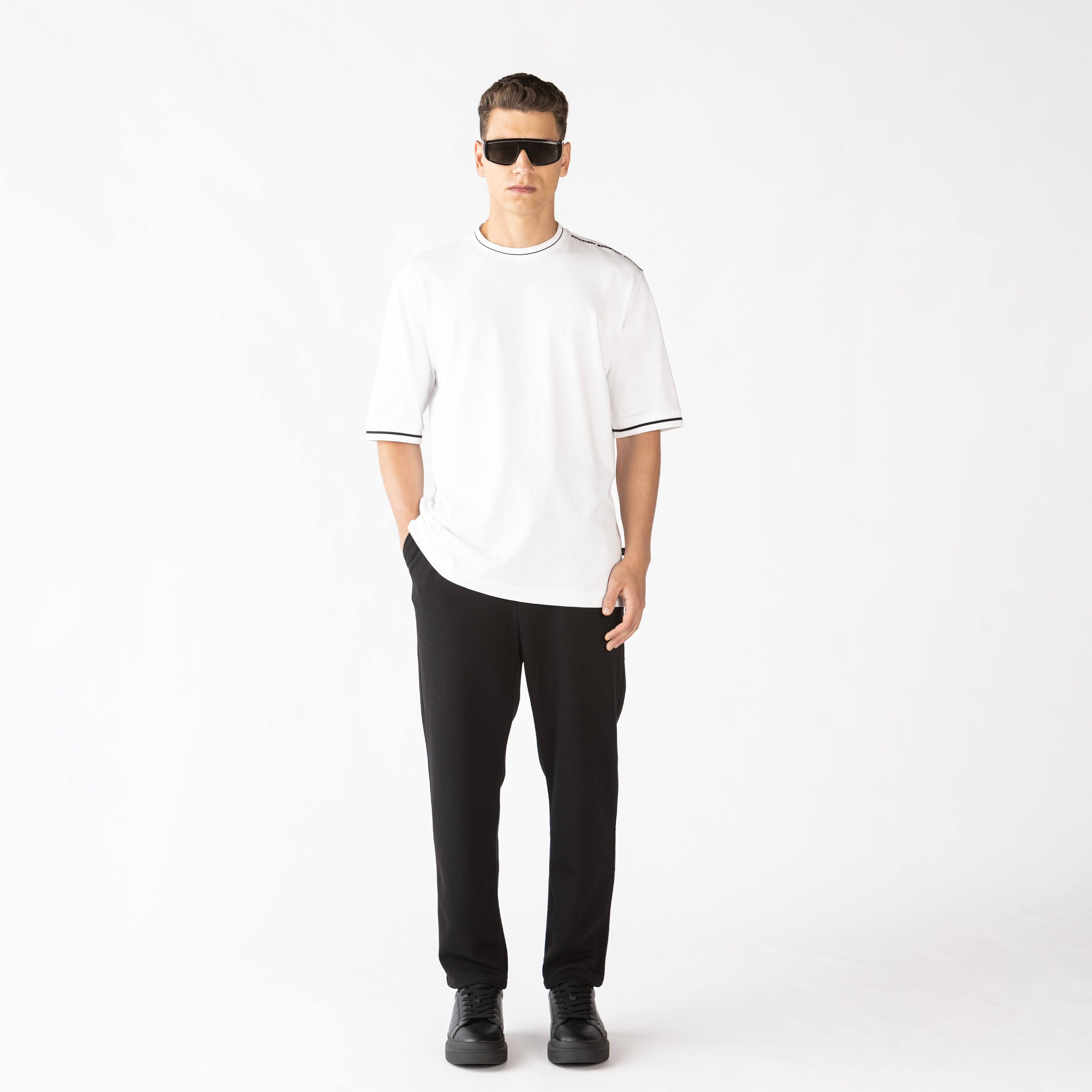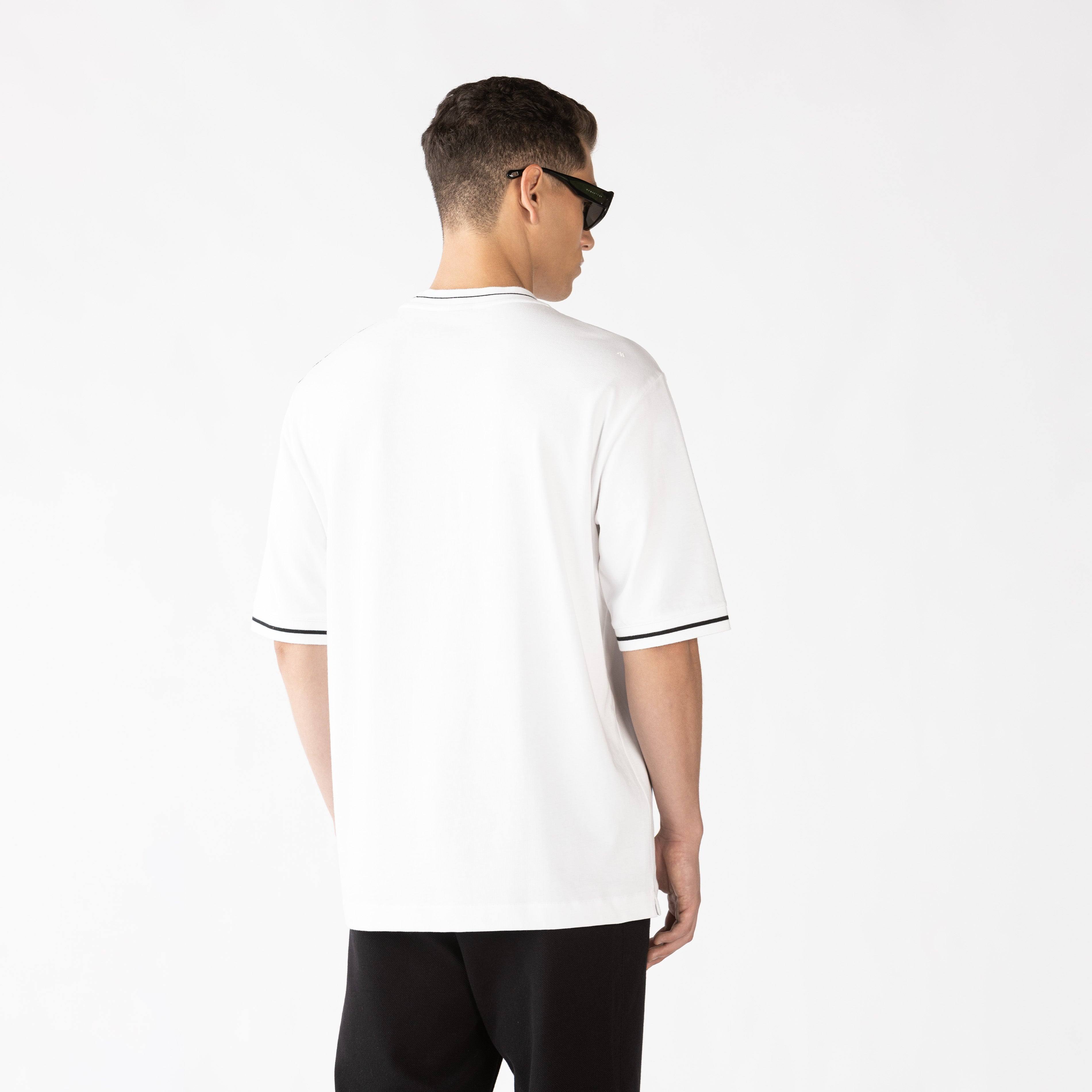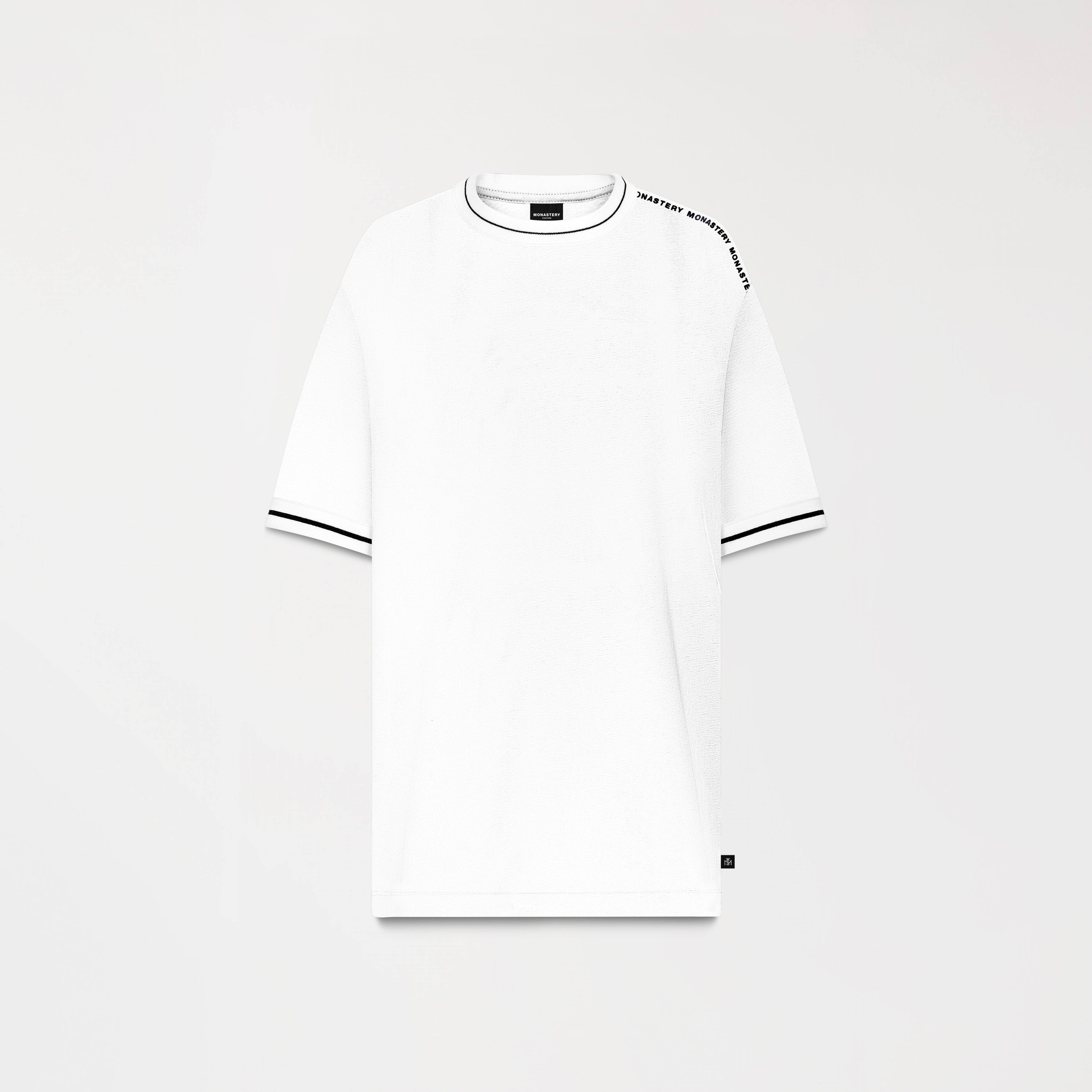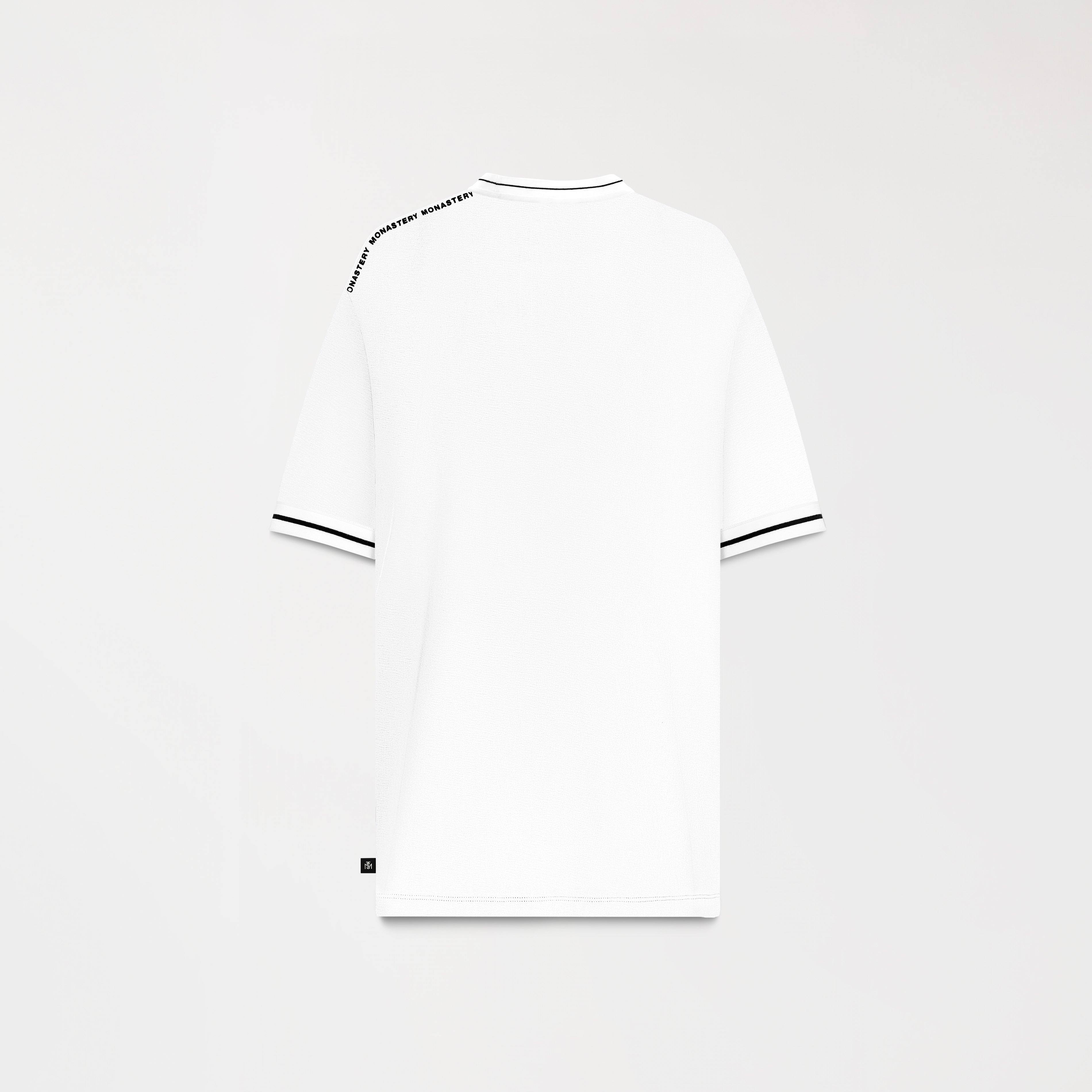 Camiseta Oversized blanca para hombre, confeccionada en algodón exclusivo para Monastery, esta camiseta presenta un cuello tejido de 2.5 cm de alto y puños tejidos, que añaden comodidad y estilo. En el hombro izquierdo del frente, destaca un estampado en flock que aporta un toque distintivo. La parte posterior cuenta con artes insignia en alta densidad, ofreciendo un acabado elegante y moderno. Ideal para quienes buscan un look relajado y sofisticado.