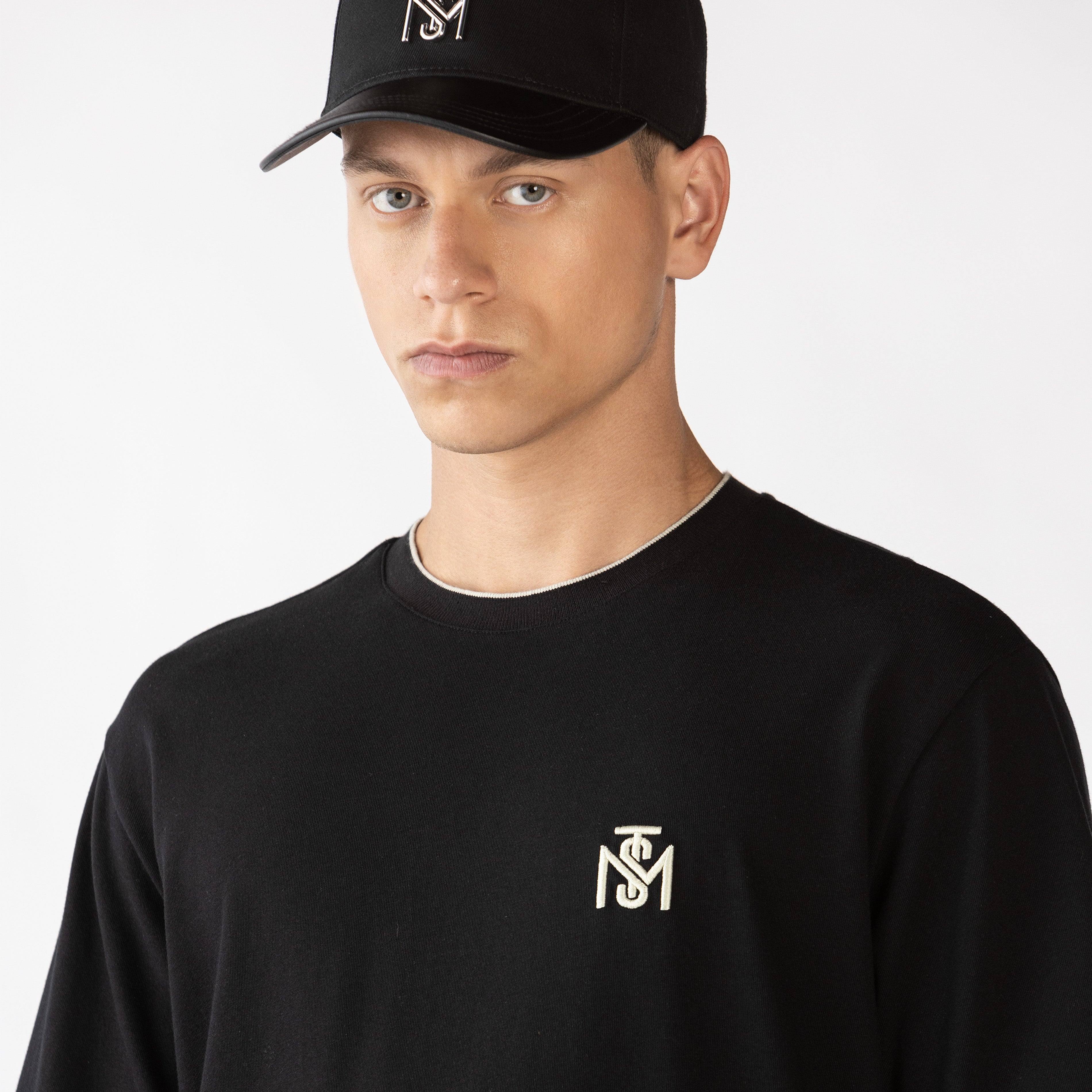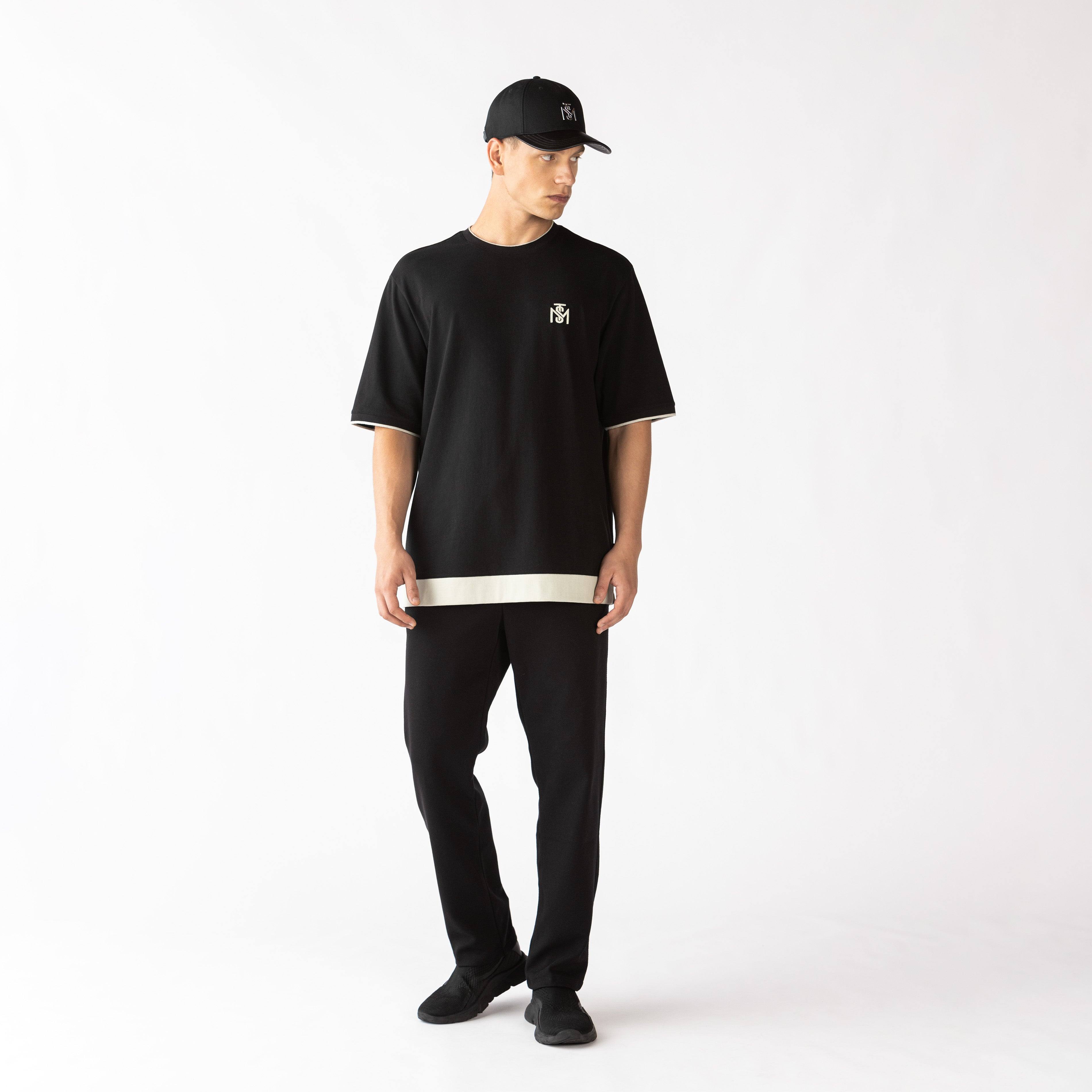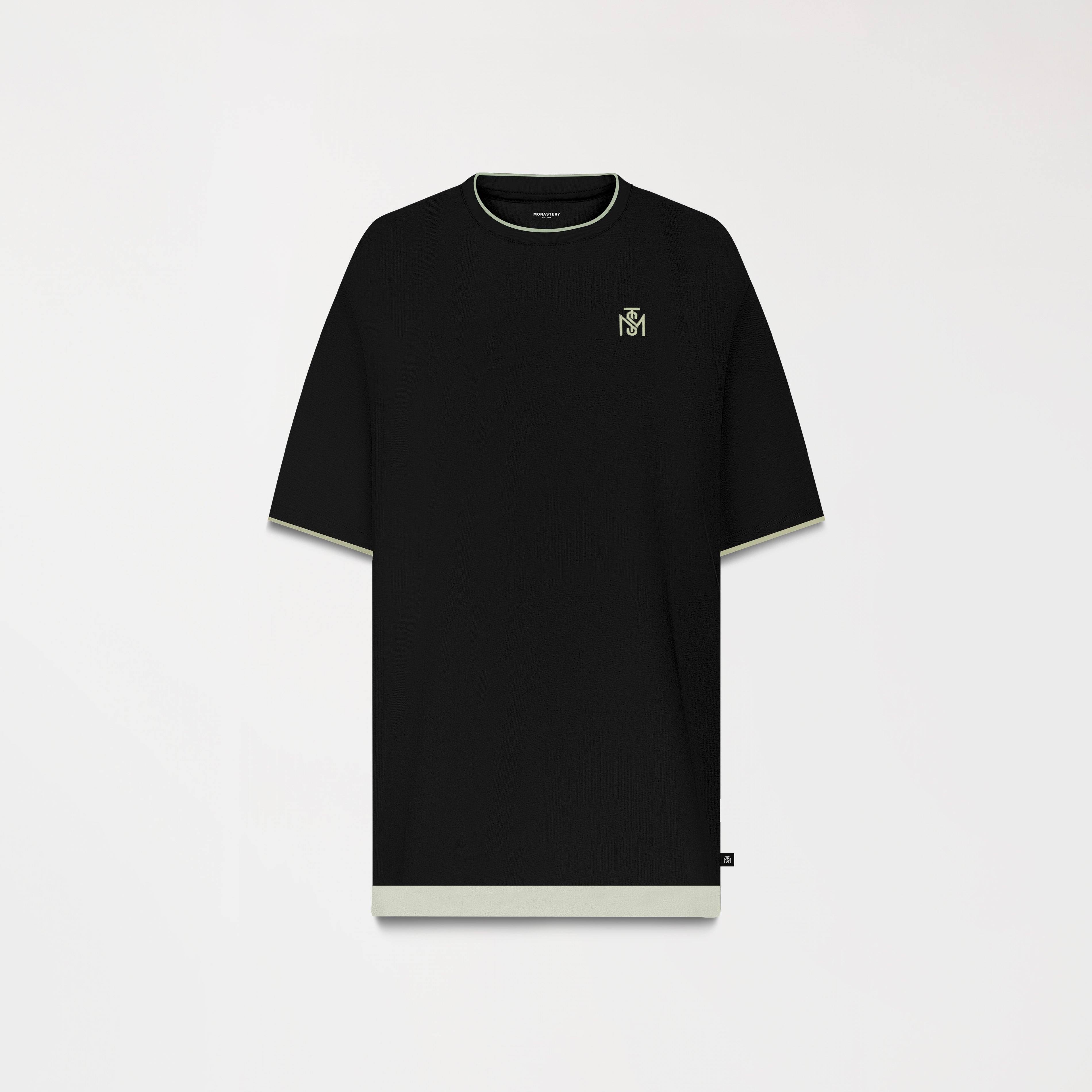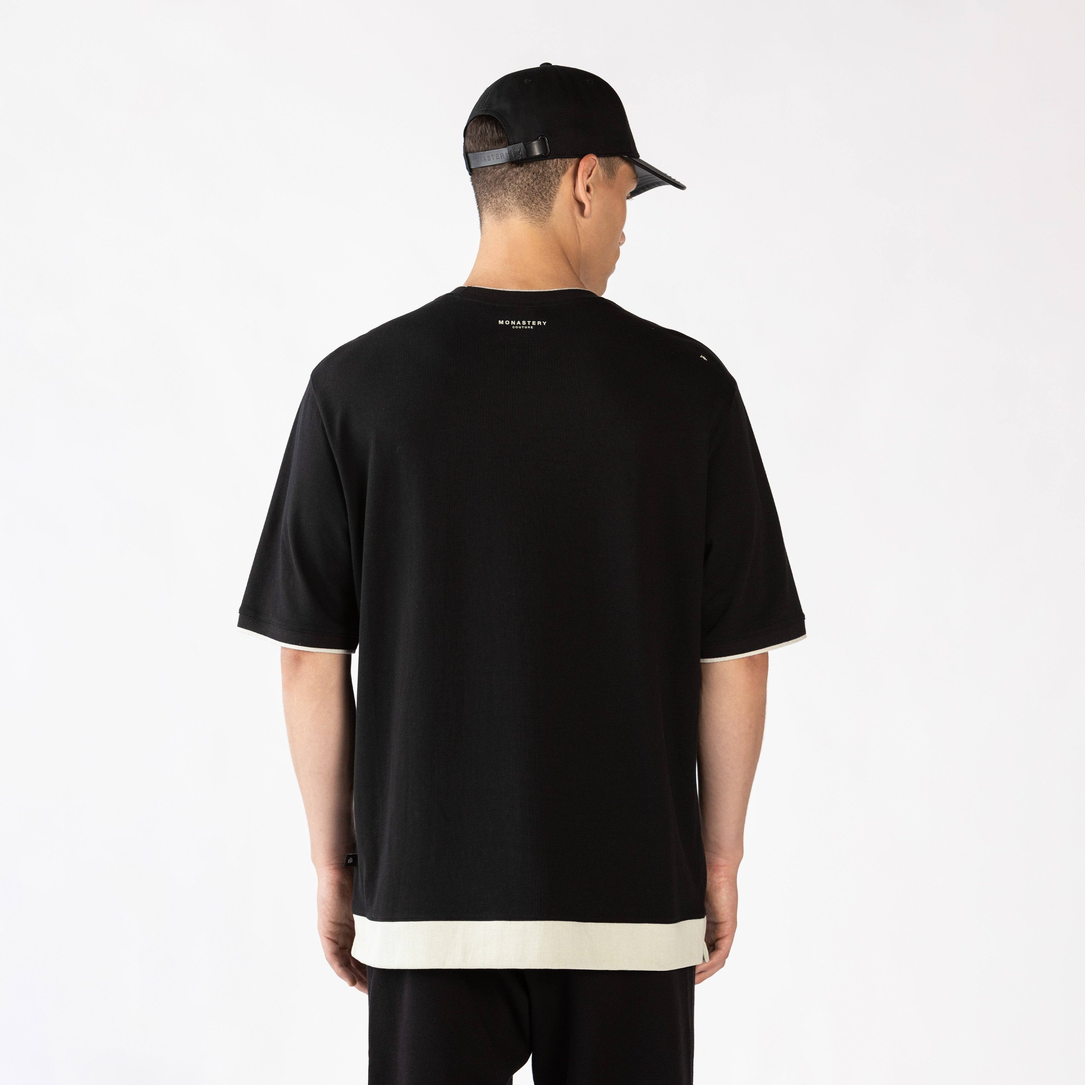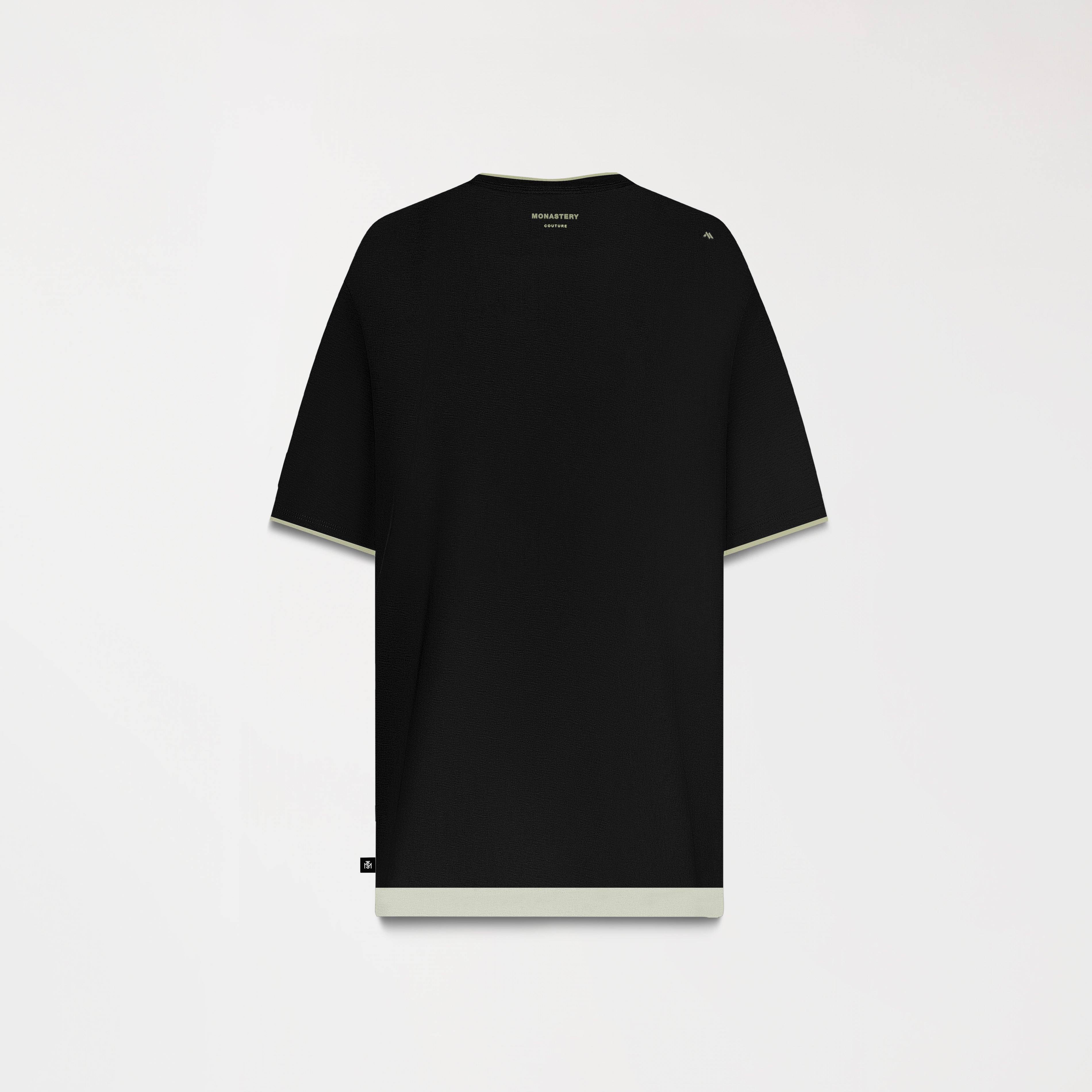 Camiseta Oversized negra para hombre, elaborada en algodón exclusivo para Monastery, esta camiseta presenta un cuello y puños tejido de 2 cm de alto y un fajón de 5 cm, que combinan comodidad y estilo. En el frente, destaca un arte bordado ubicado en punto corazón, que le da un toque distintivo, mientras que la parte posterior cuenta con los artes insignia en alta densidad, ofreciendo un acabado moderno y elegante. Ideal para un look relajado y contemporáneo.