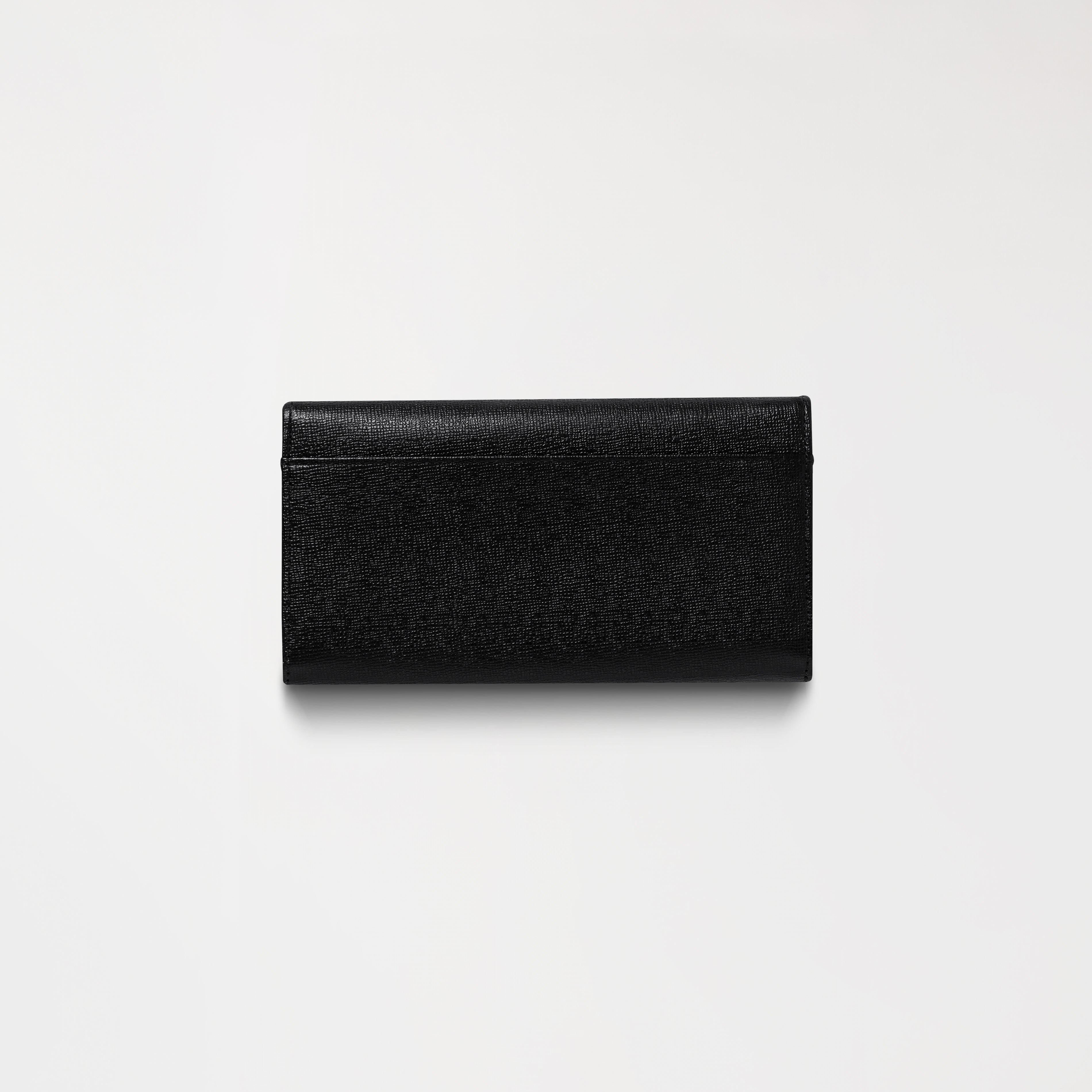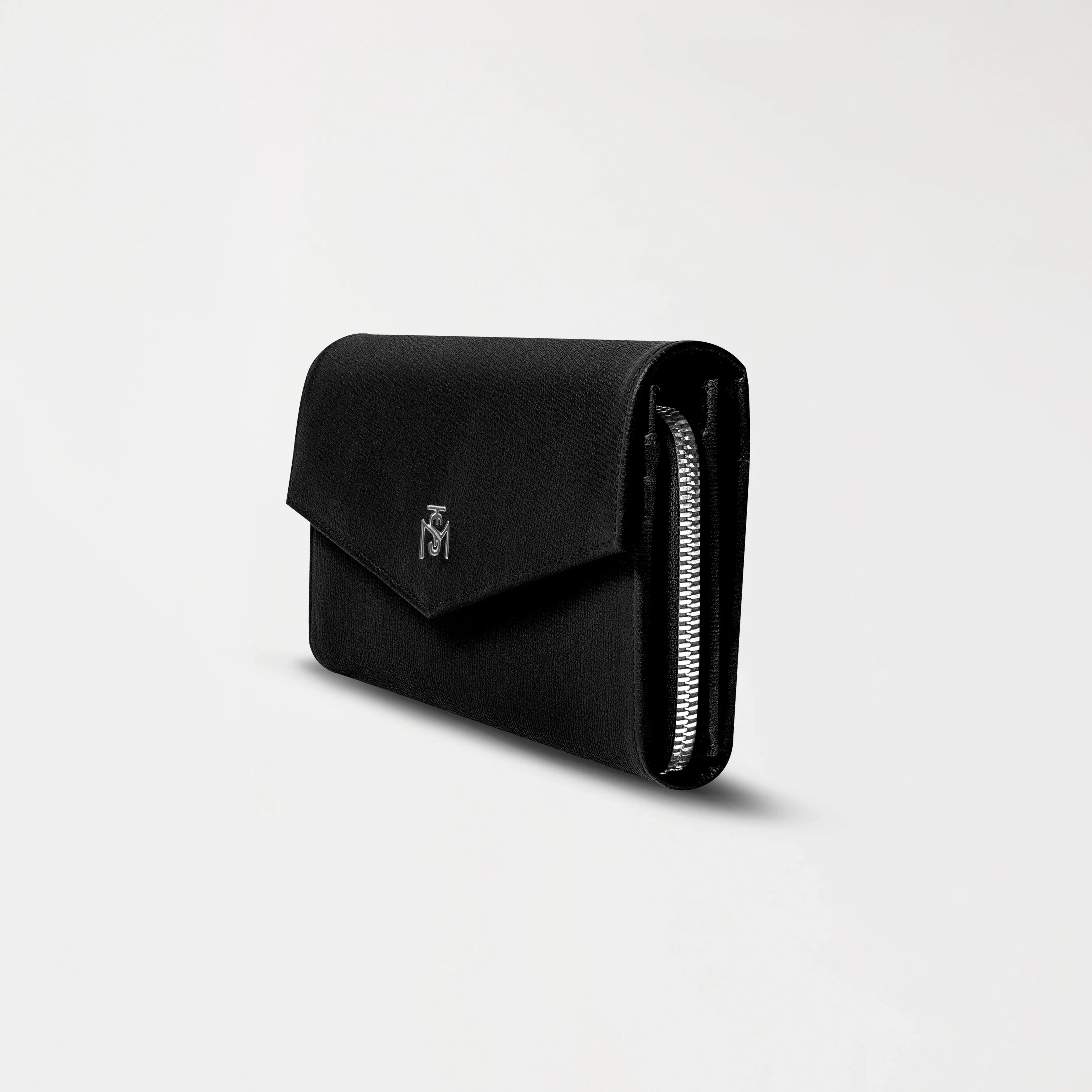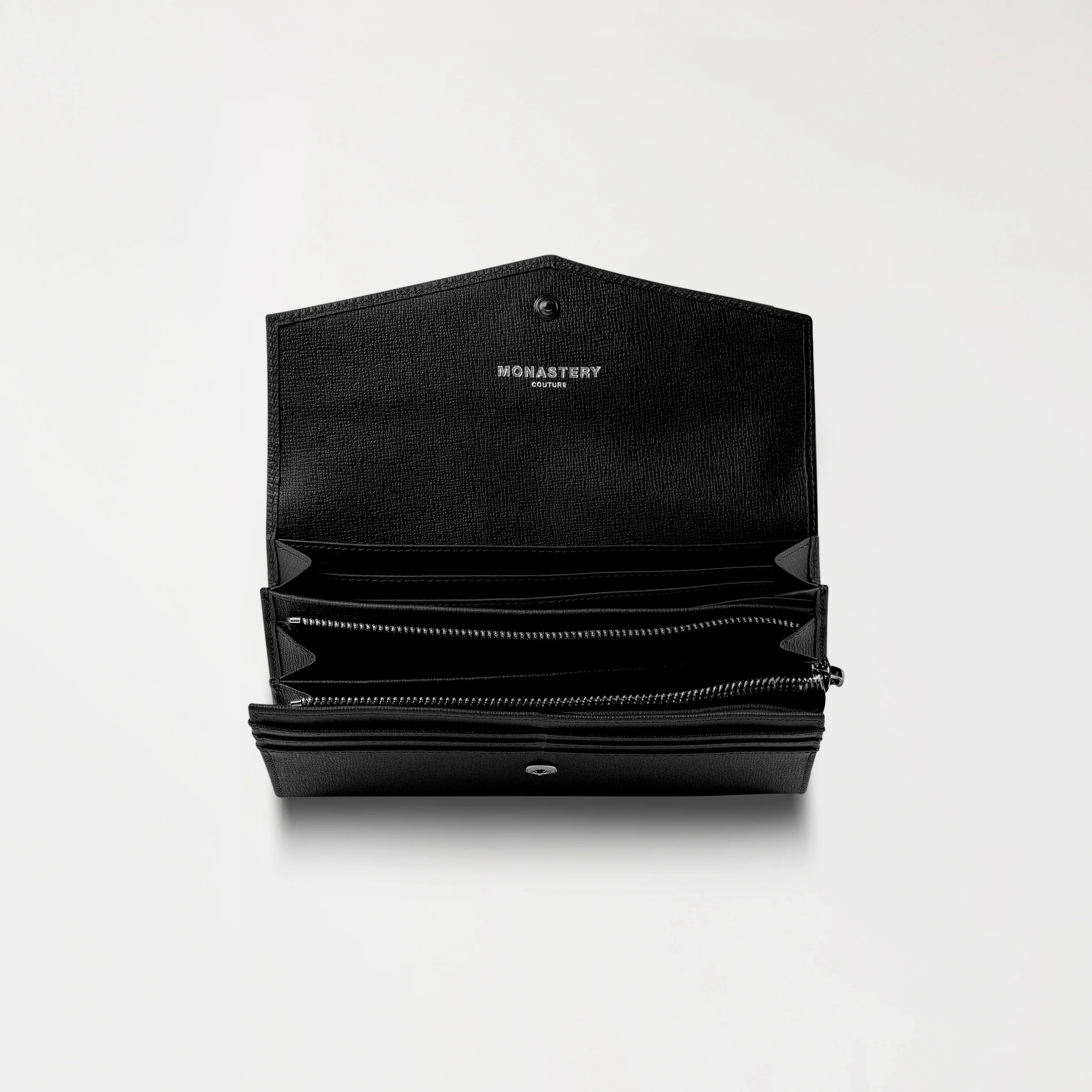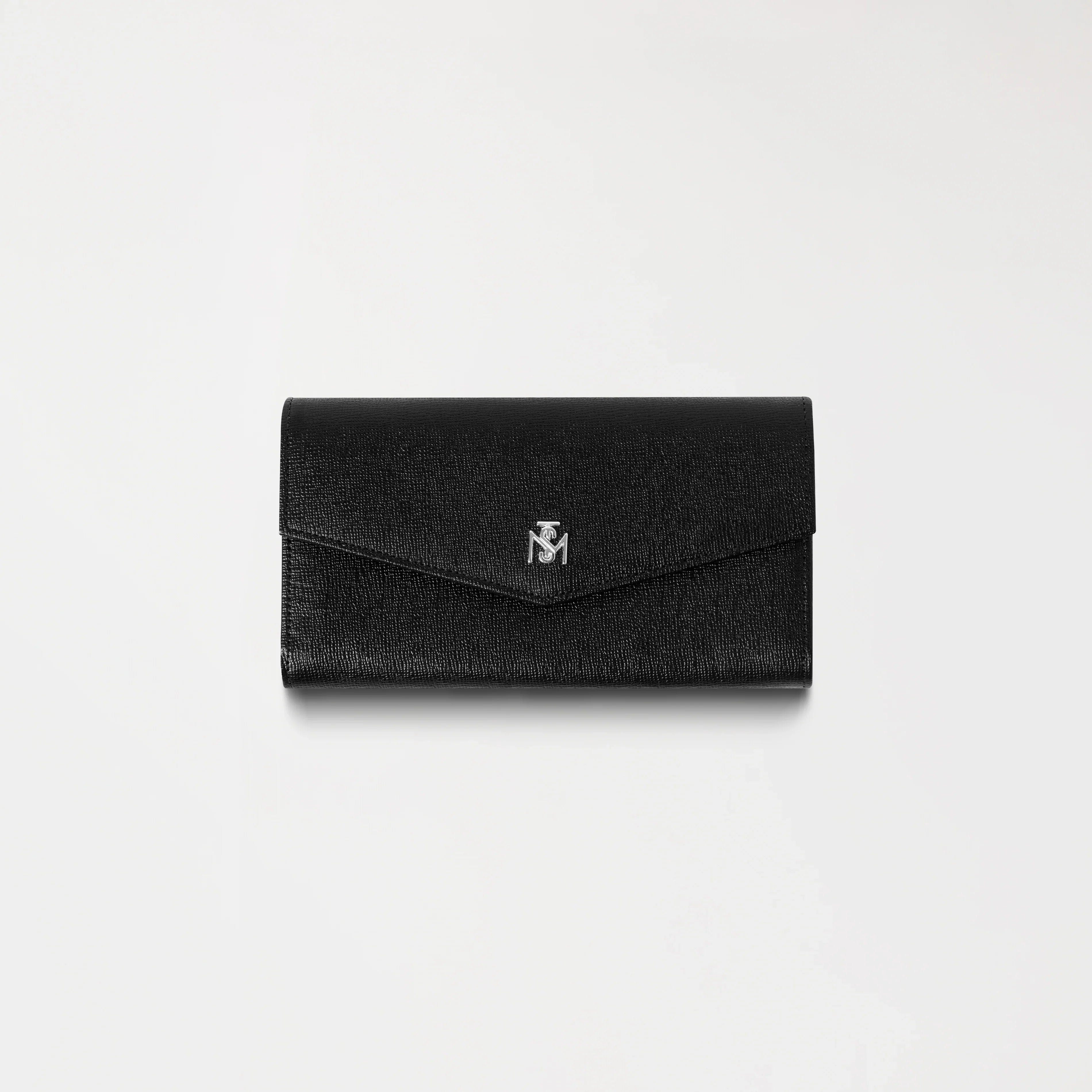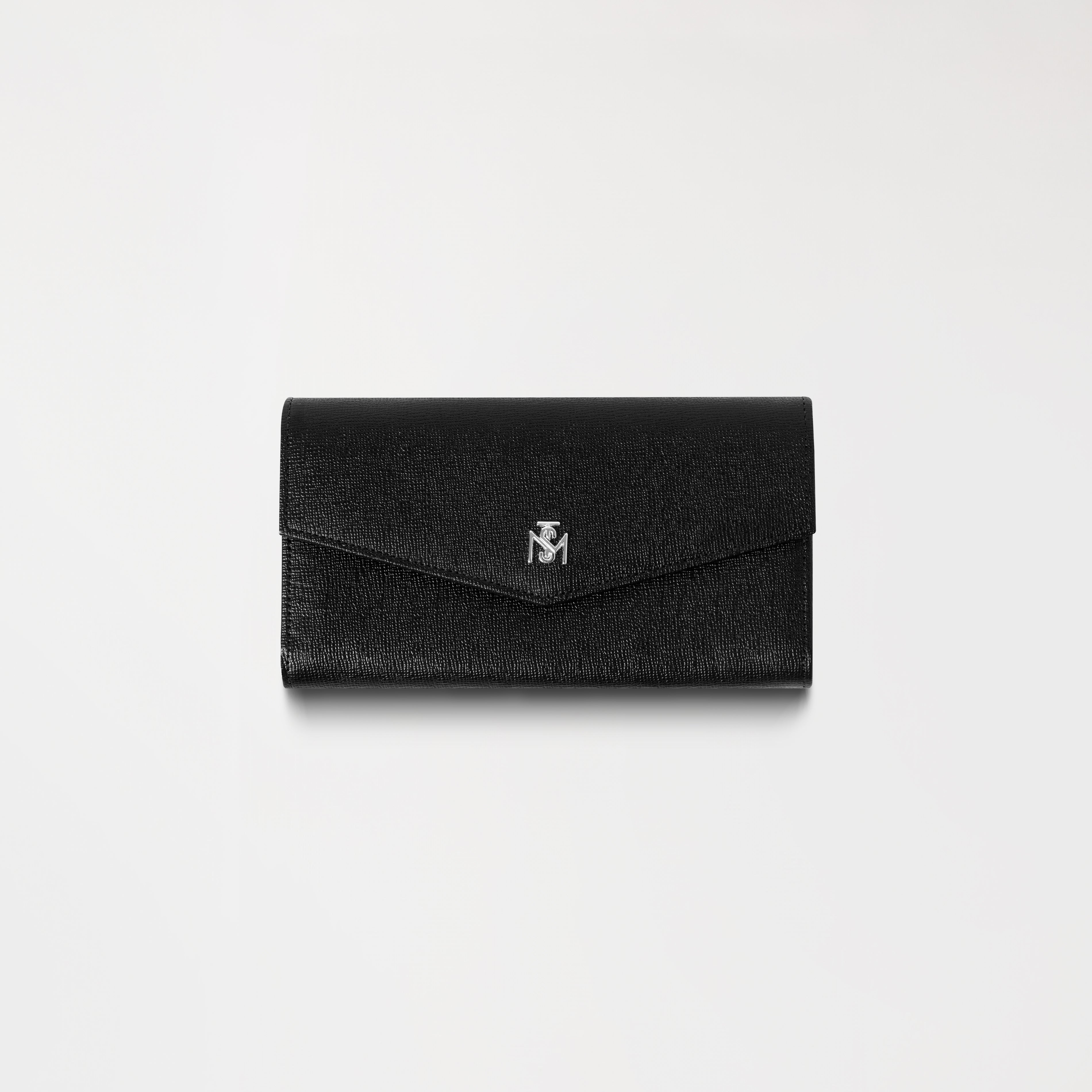Billetera de mujer tipo sobre, elaborada en cuero de alta calidad, ideal para quienes buscan un accesorio con estilo y gran capacidad. Su diseño incluye un interior amplio, con dos compartimentos principales, un bolsillo central con cierre y múltiples ranuras para tarjetas, que permiten una organización eficiente. En el frente, incorpora un aplique metálico en tono plata brillante, que aporta un detalle sofisticado. El interior incluye la marca grabada en clisé, reflejando su identidad y acabado refinado, disponible en dos versiones de color: negro y rojo.