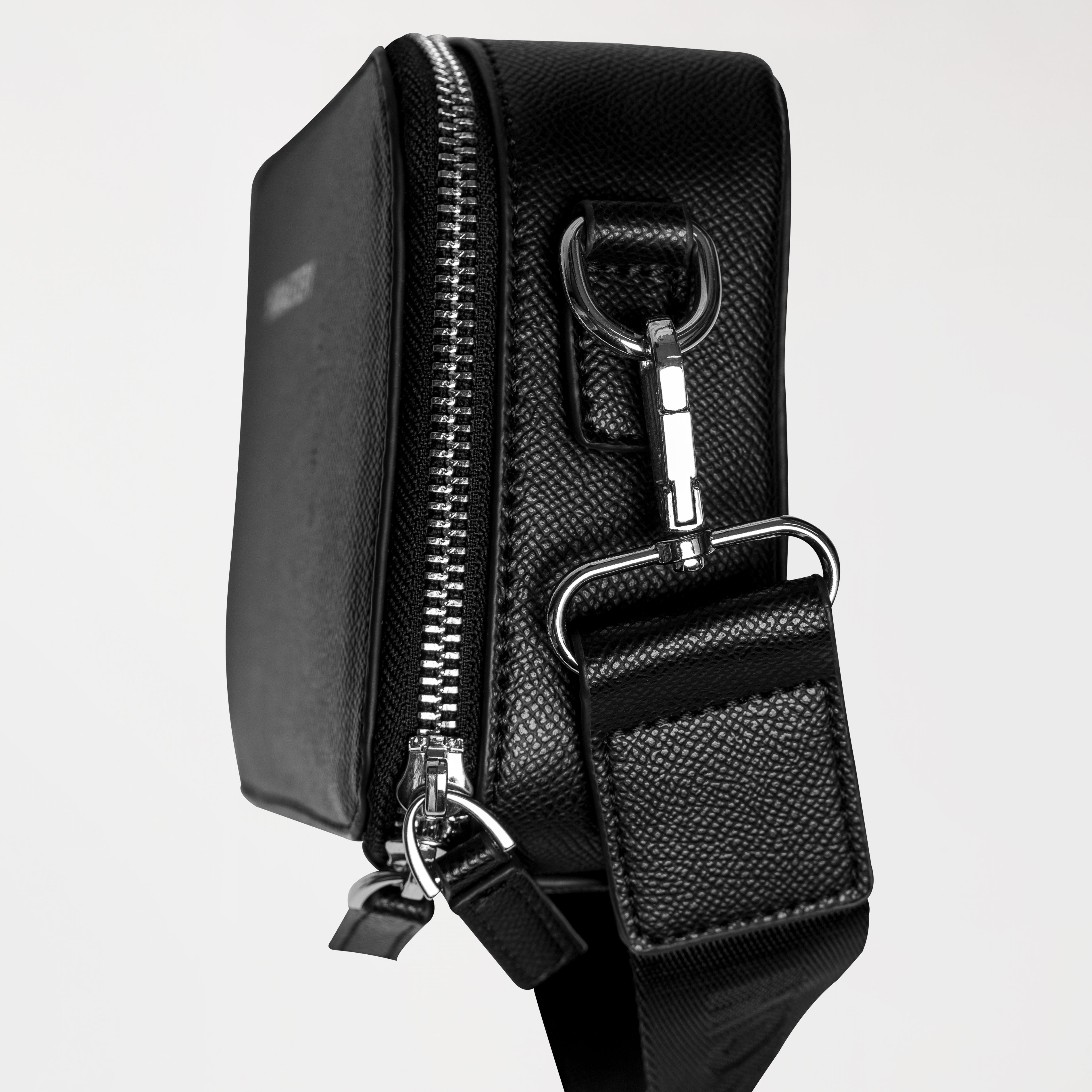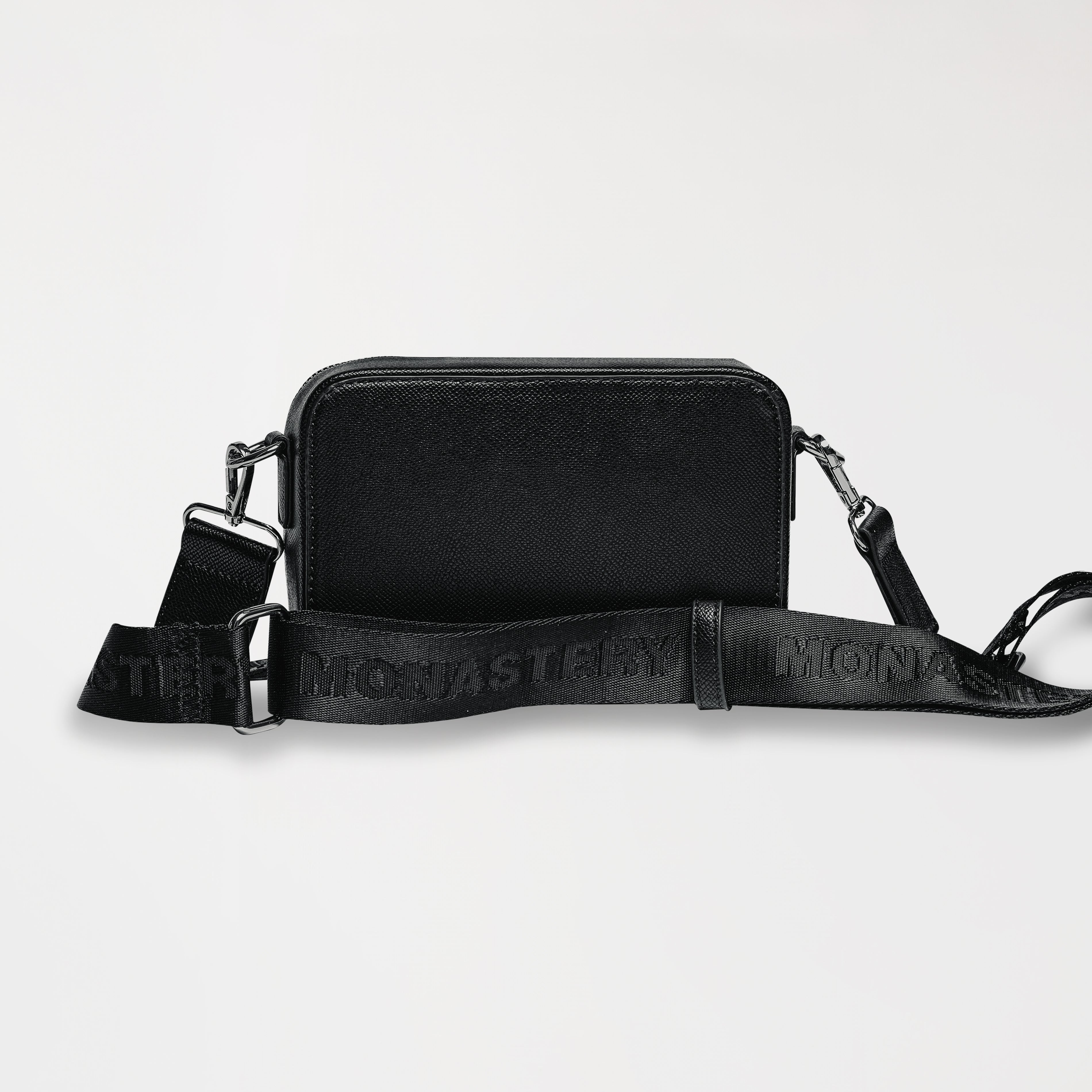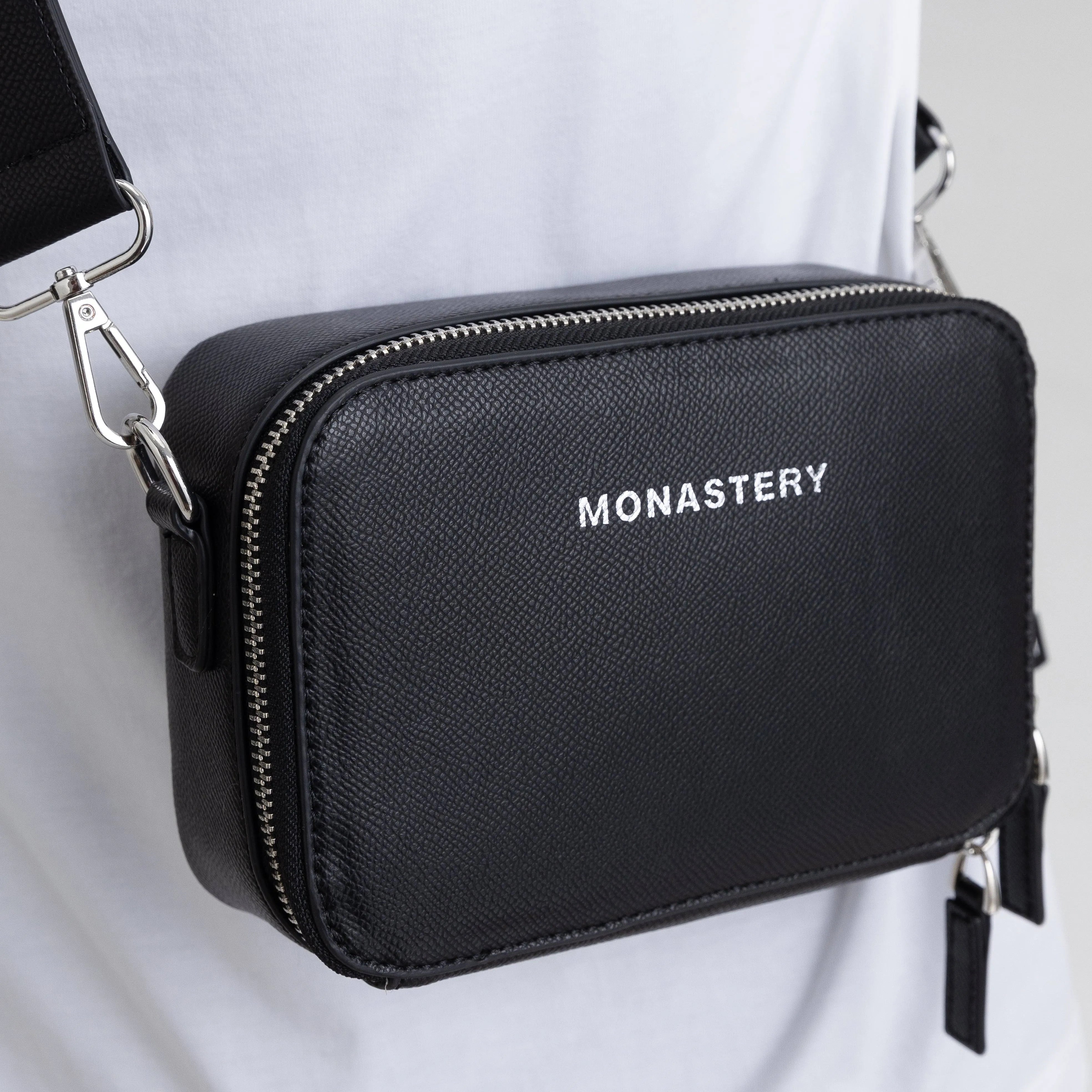 El FannyPack Shum ofrece un amplio compartimento principal con doble slider, facilitando su apertura y comodidad. En su cara exterior, presenta el logo Monastery estampado en letras plata brillante, armonizando con sus herrajes y cierres. Además, cuenta con una cargadera en Jacquard que incorpora sutilmente el logo de la marca entre su tejido.