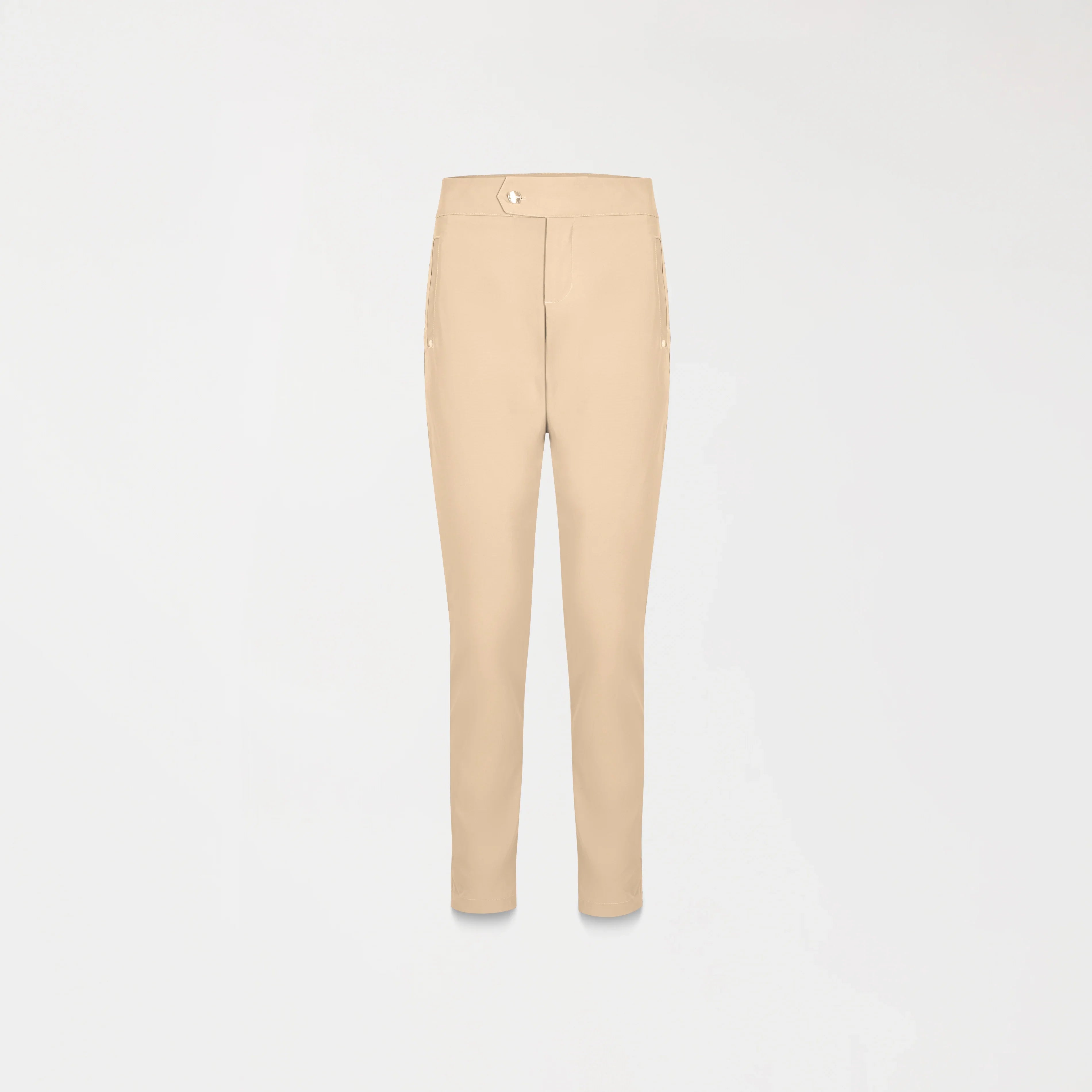 Pantalón para mujer silueta regular elaborado con la base textil Moretti presenta un corte clásico y cómodo que se ajusta perfectamente al cuerpo ofreciendo un balance ideal entre estilo y confort. Está diseñado con bolsillos en ribete tanto en la parte frontal como en la posterior, lo que le otorga un toque sofisticado y elegante. Los insumos Monastery tienen un baño de plata brillante, brindando durabilidad, resistencia y un acabado de lujo. Este pantalón es perfecto para quienes buscan una prenda versátil, práctica y con un diseño atemporal.