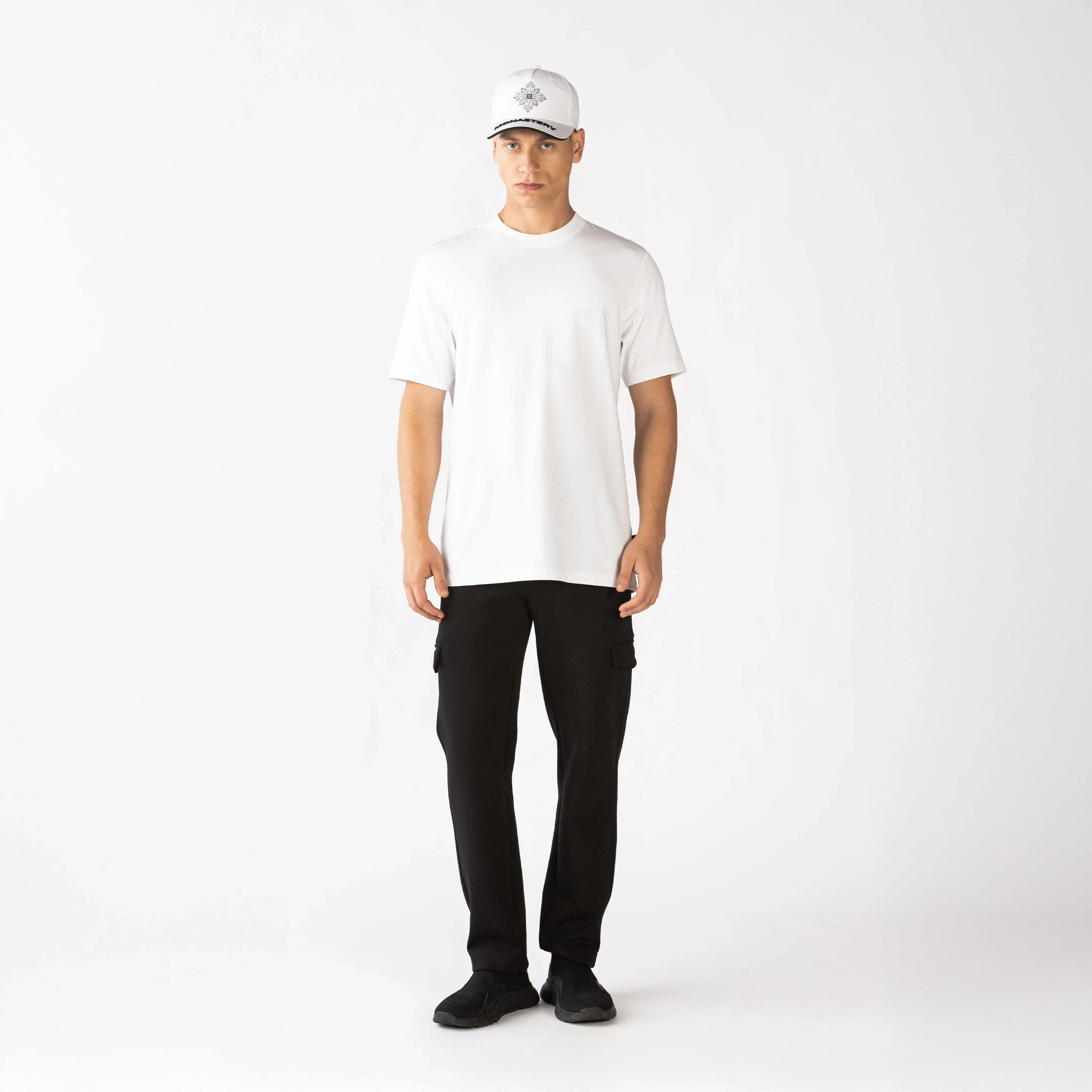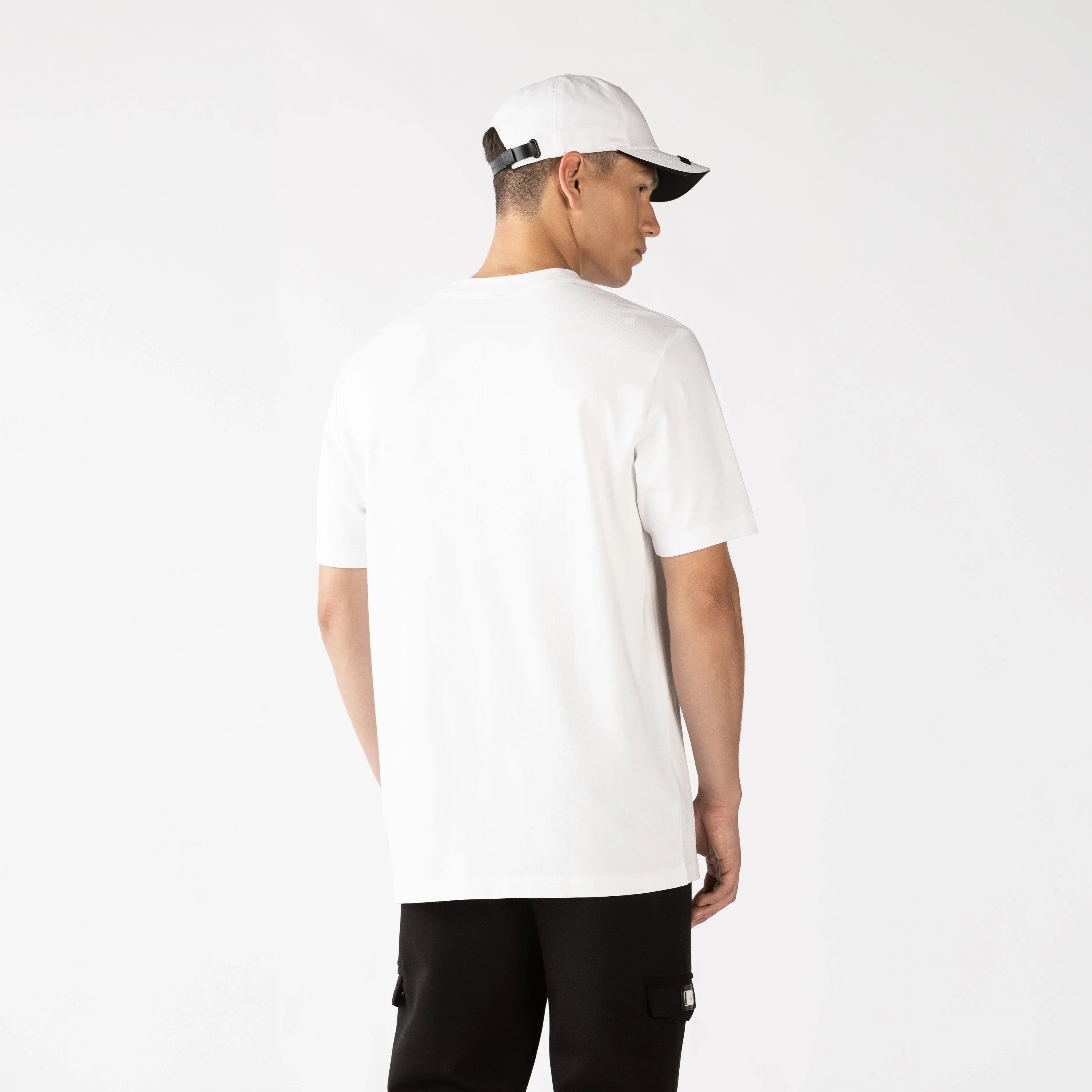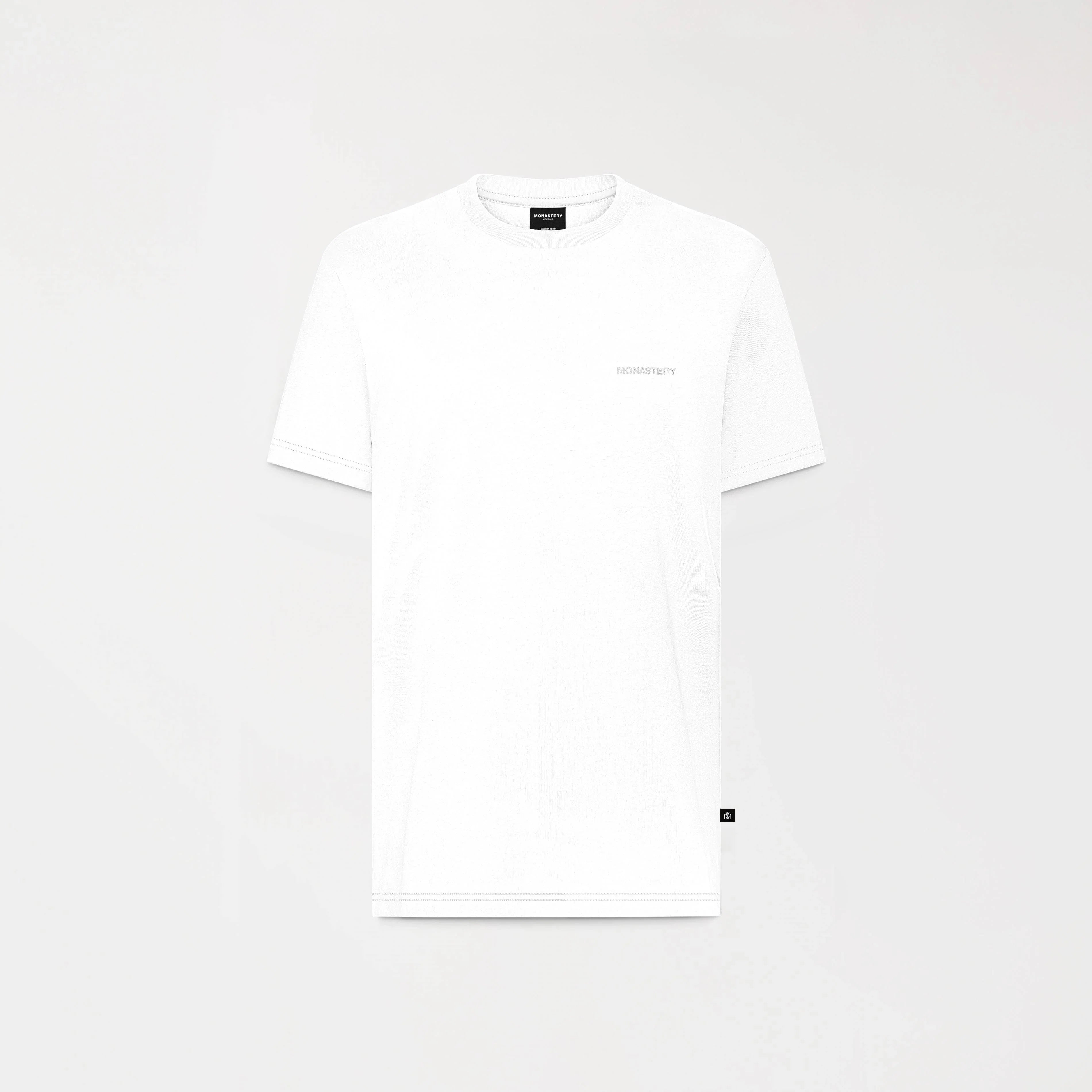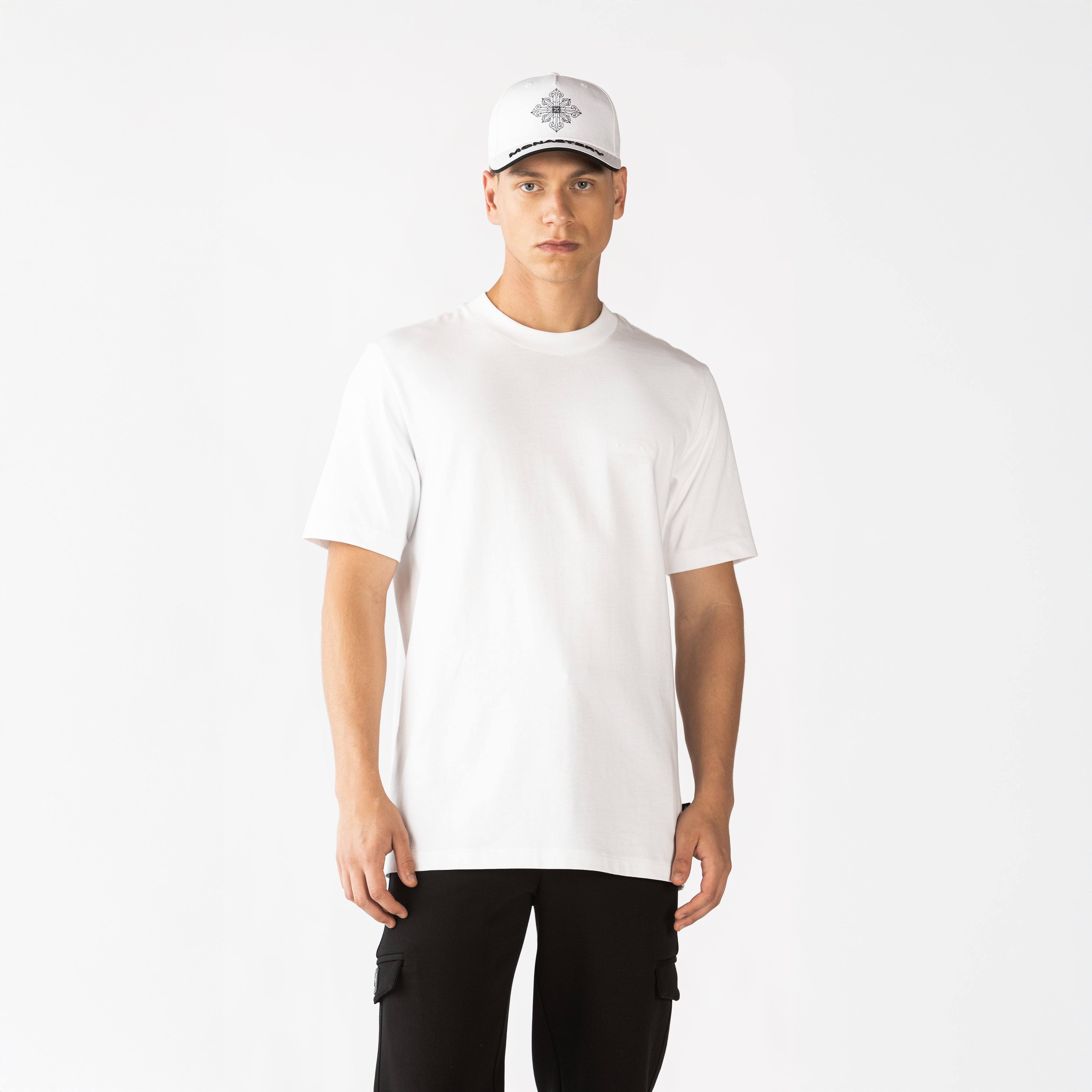 Camiseta blanca para hombre confeccionada en silueta regular, elaborada en suave algodón, esta camiseta presenta un cuello de 3 cm que aporta comodidad y estilo. En el frente, se destaca un arte bordado ubicado en punto corazón, mientras que la parte posterior cuenta con un impactante diseño en bordado 3D en forma de cruz. Además, los logos insignia están estampados en alta densidad, añadiendo un toque clásico y distintivo. Ideal para quienes buscan un look moderno y con carácter.