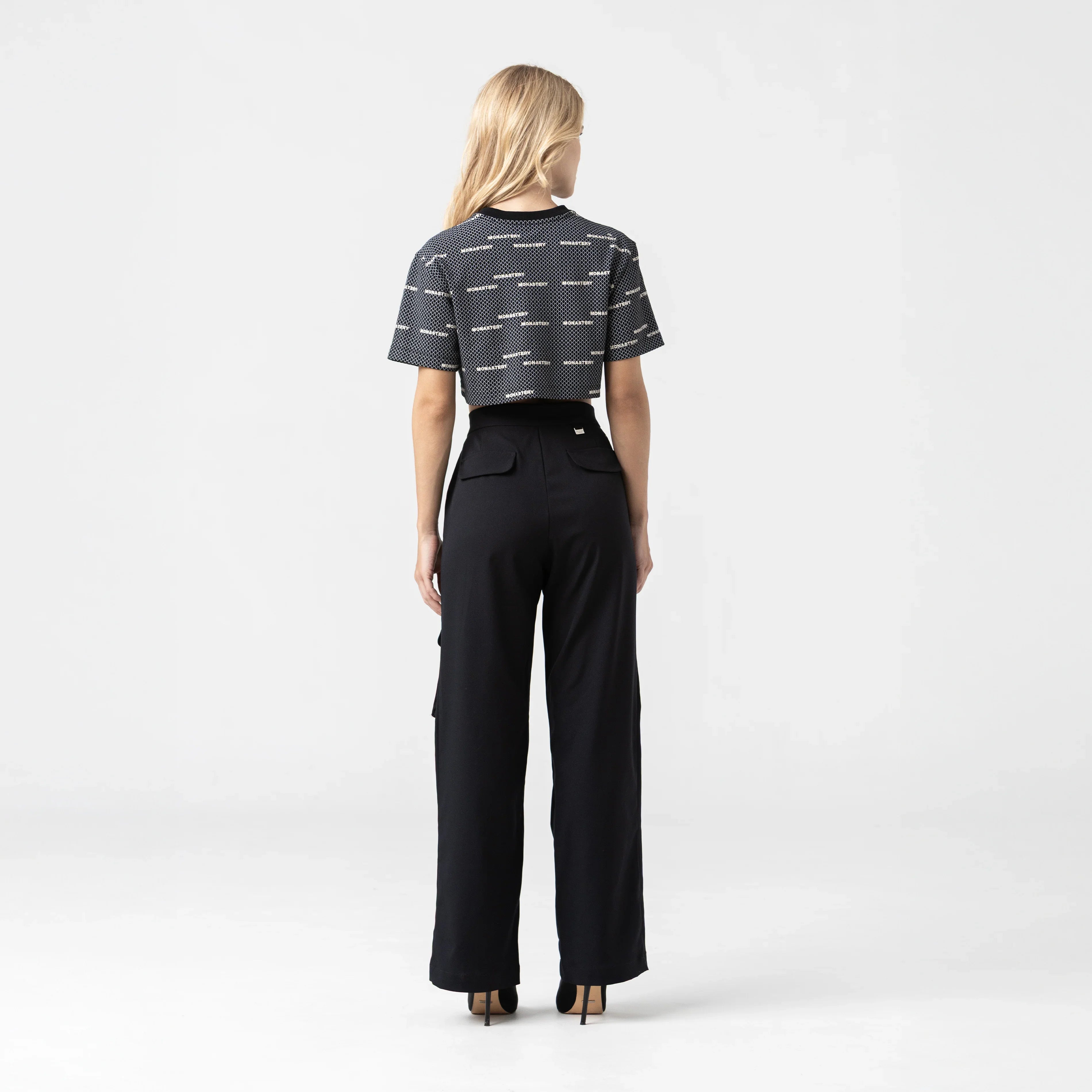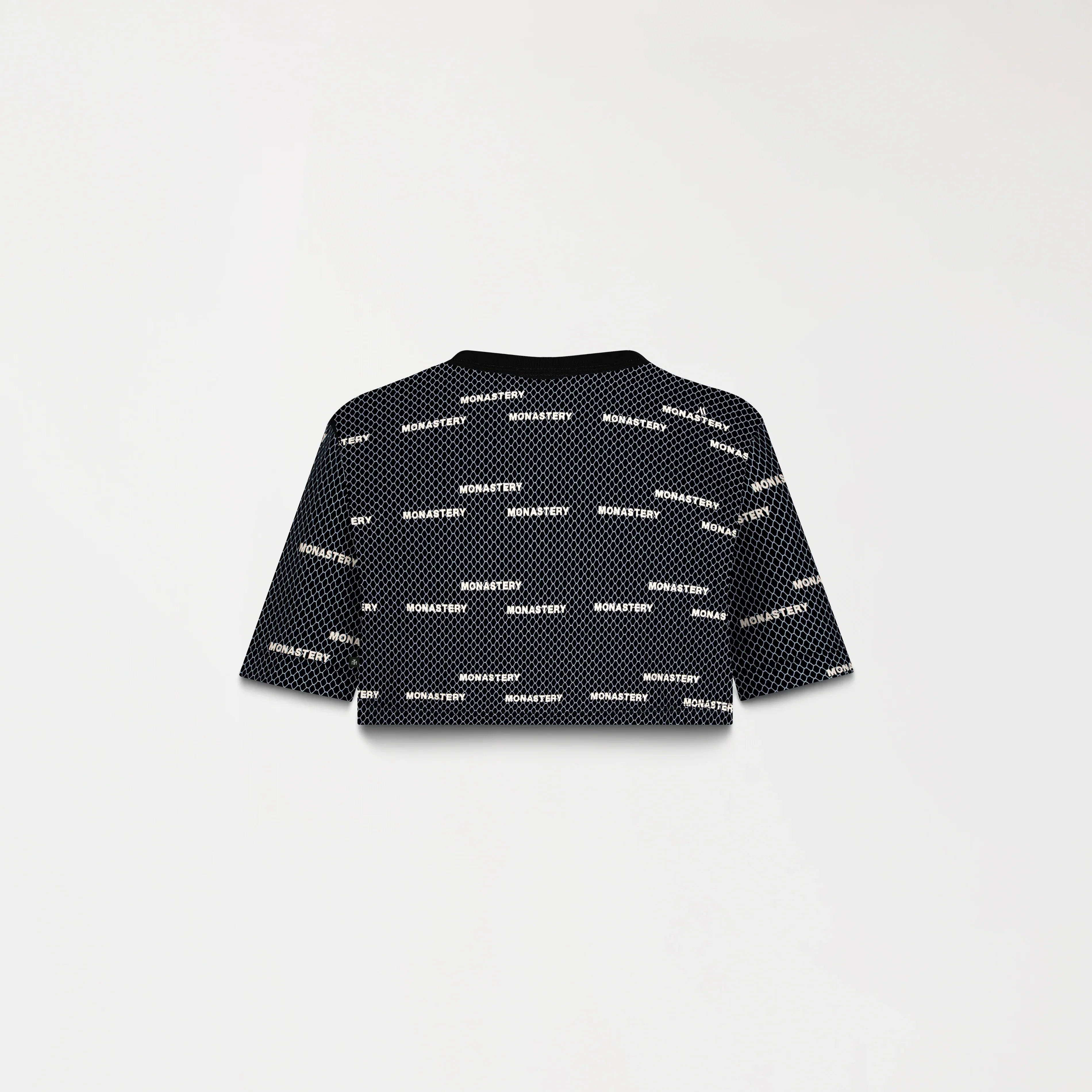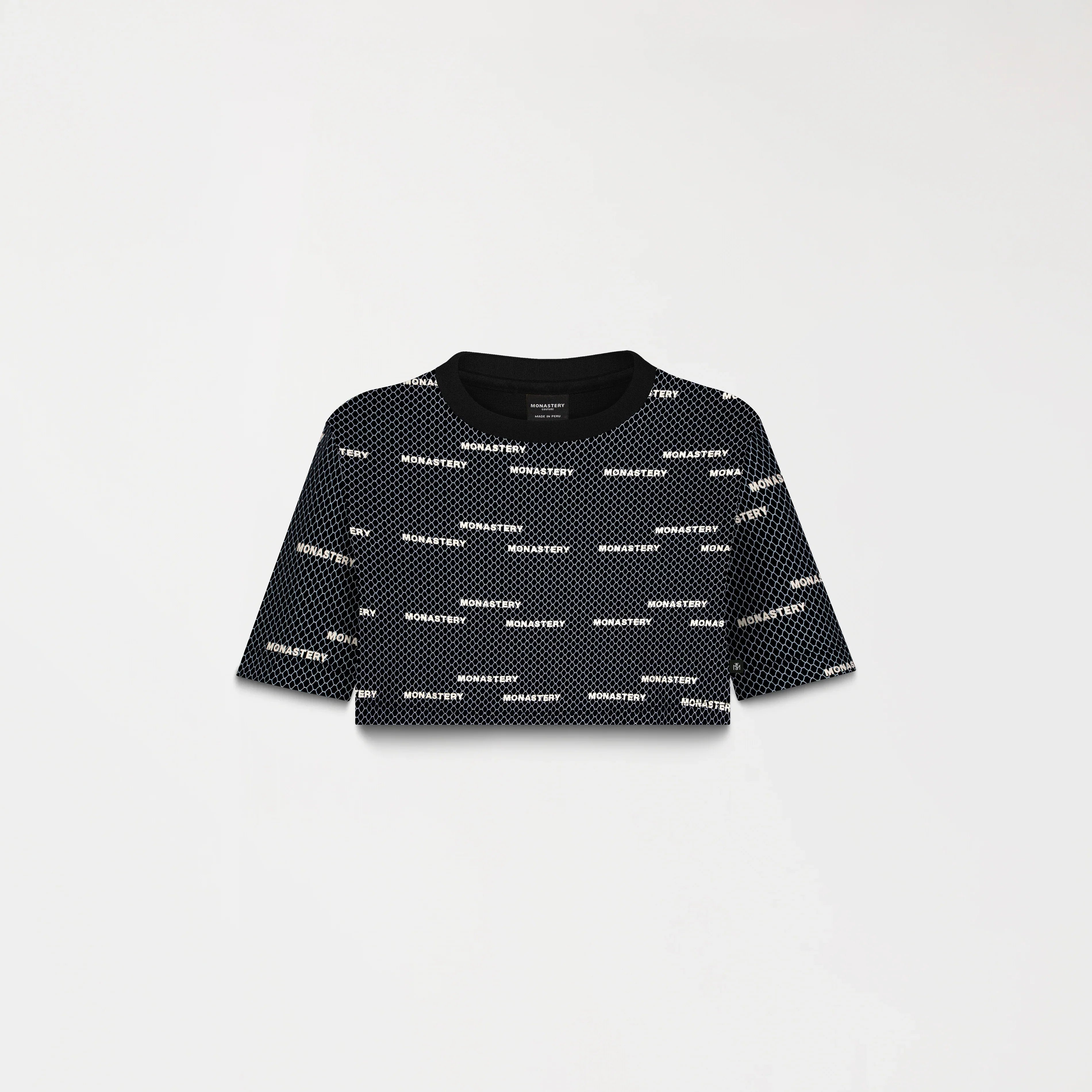 Crop top para mujer en algodón peruano exclusivo para Monastery, elaborada en silueta pequeña, Este crop top cuenta con un fondeo estampado plano en toda la prenda acompañada de un repite de nuestro iconico logo Monastery y en su fondo un arte repetido de un efecto en maya el cual genera distincion y dinamismo perfecto para tu vestuario y estilo.