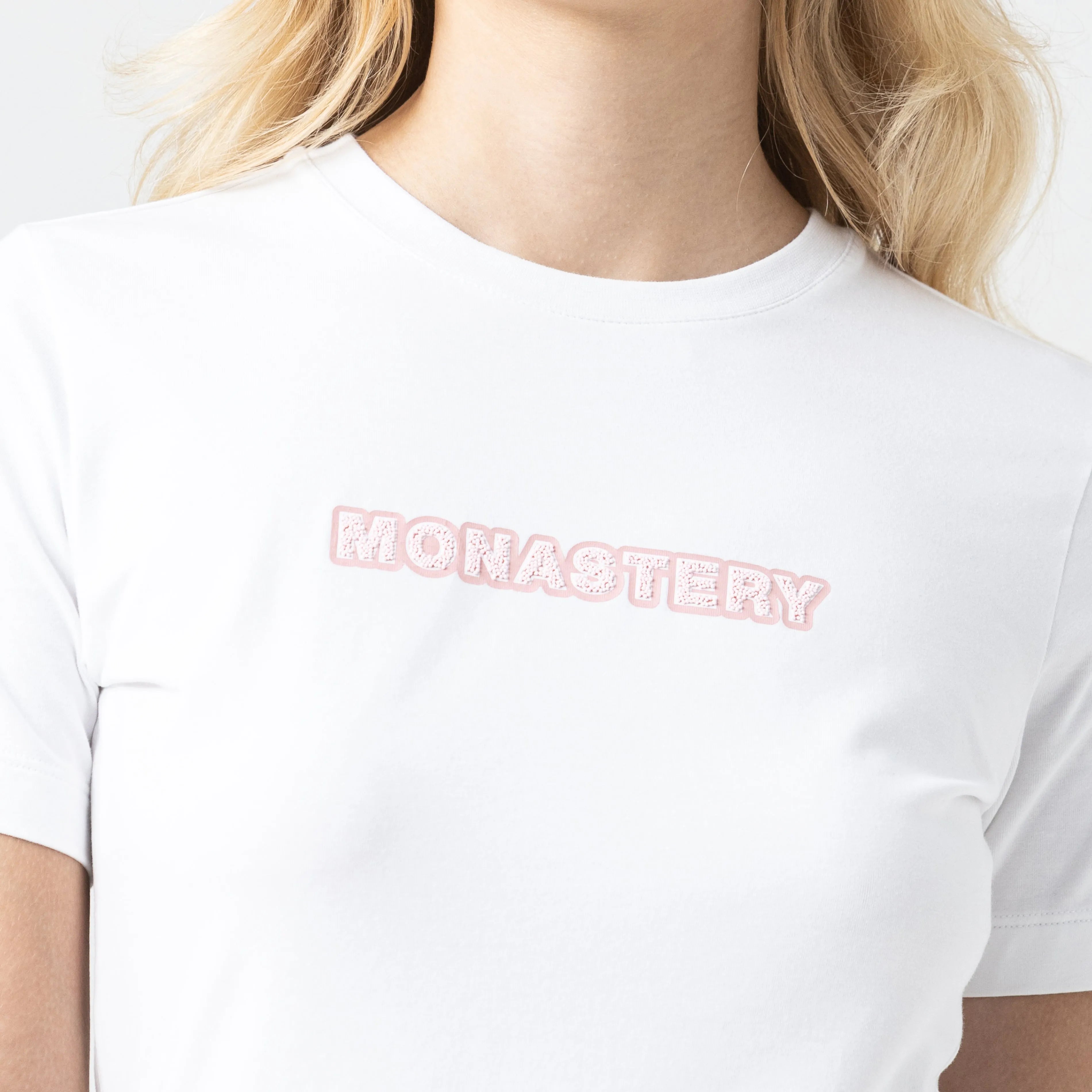 Camiseta femenina, elaborada en premium Cotton con elastano para mayor comodidad y frescura. Este artículo tiene una silueta ajustada, la cual resalta la figura femenina, con un arte de nuestro logo Monastery, en una tecnica mixta de caviar y estampado plano, una referencia con textura y un efecto visual mas dinamico. Esta acompañada de los logos clasicos en espalda tono bridal rose convirtiendo este articulo en una prenda versátil para combinar con tu vestuario, ideal para lucir en tu día a día.