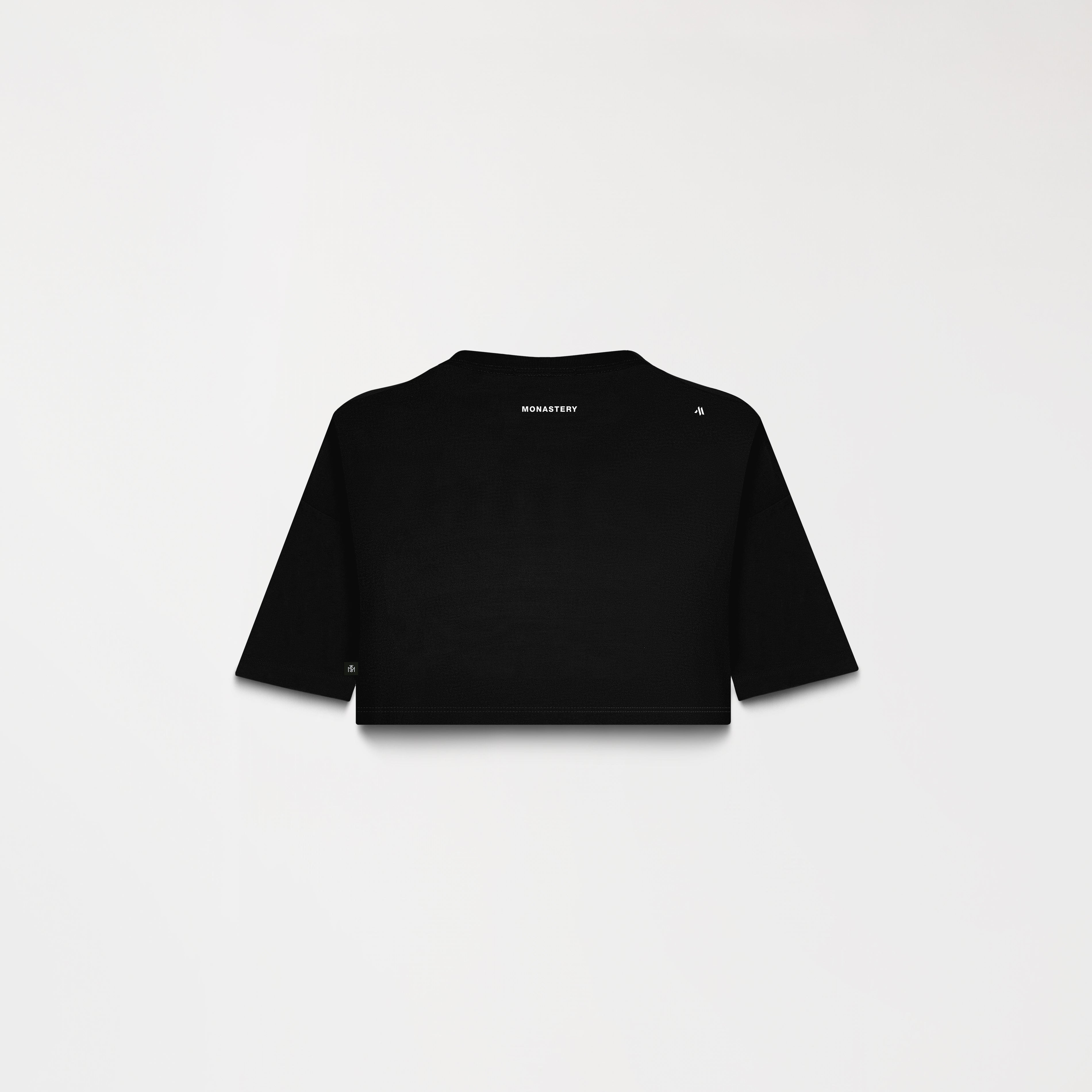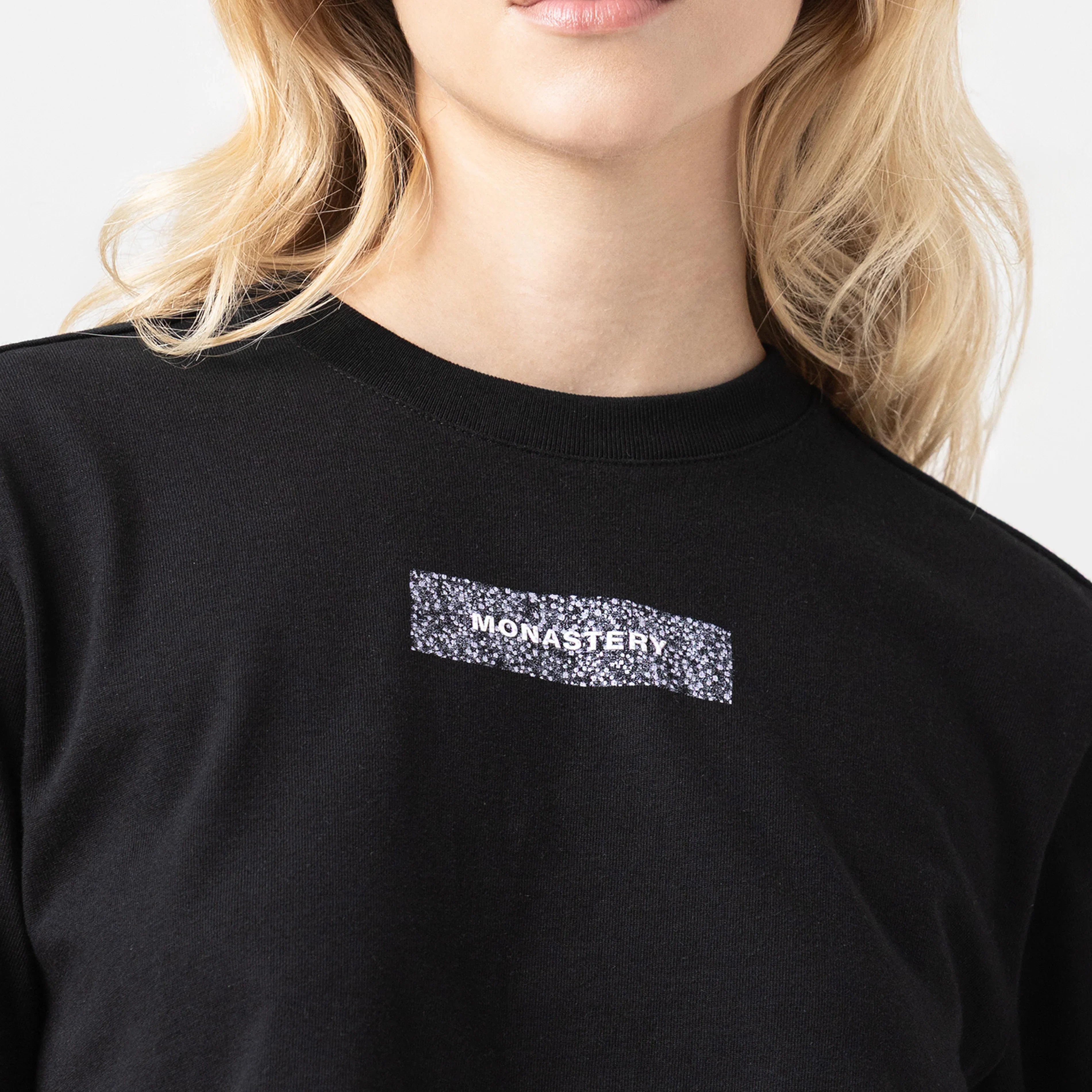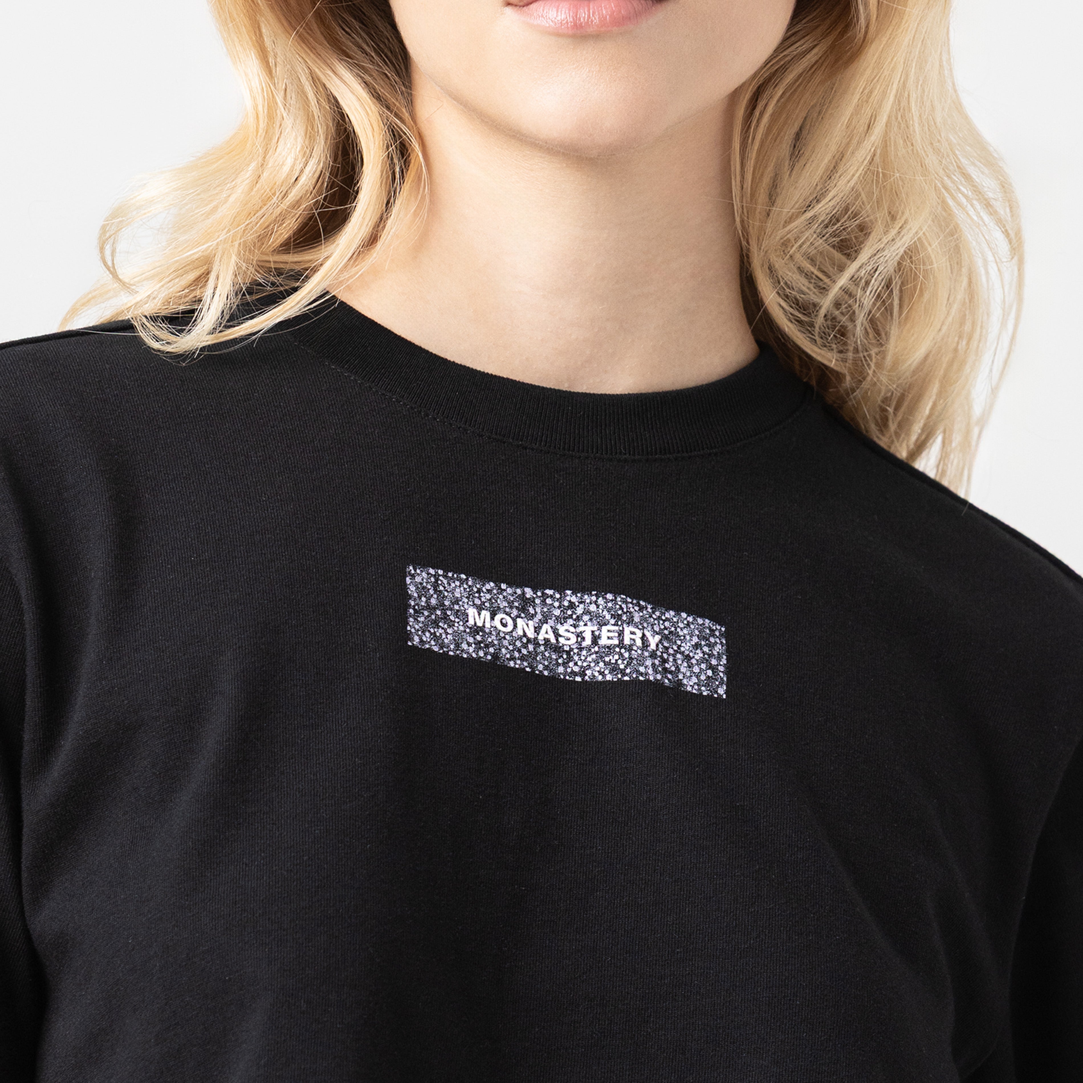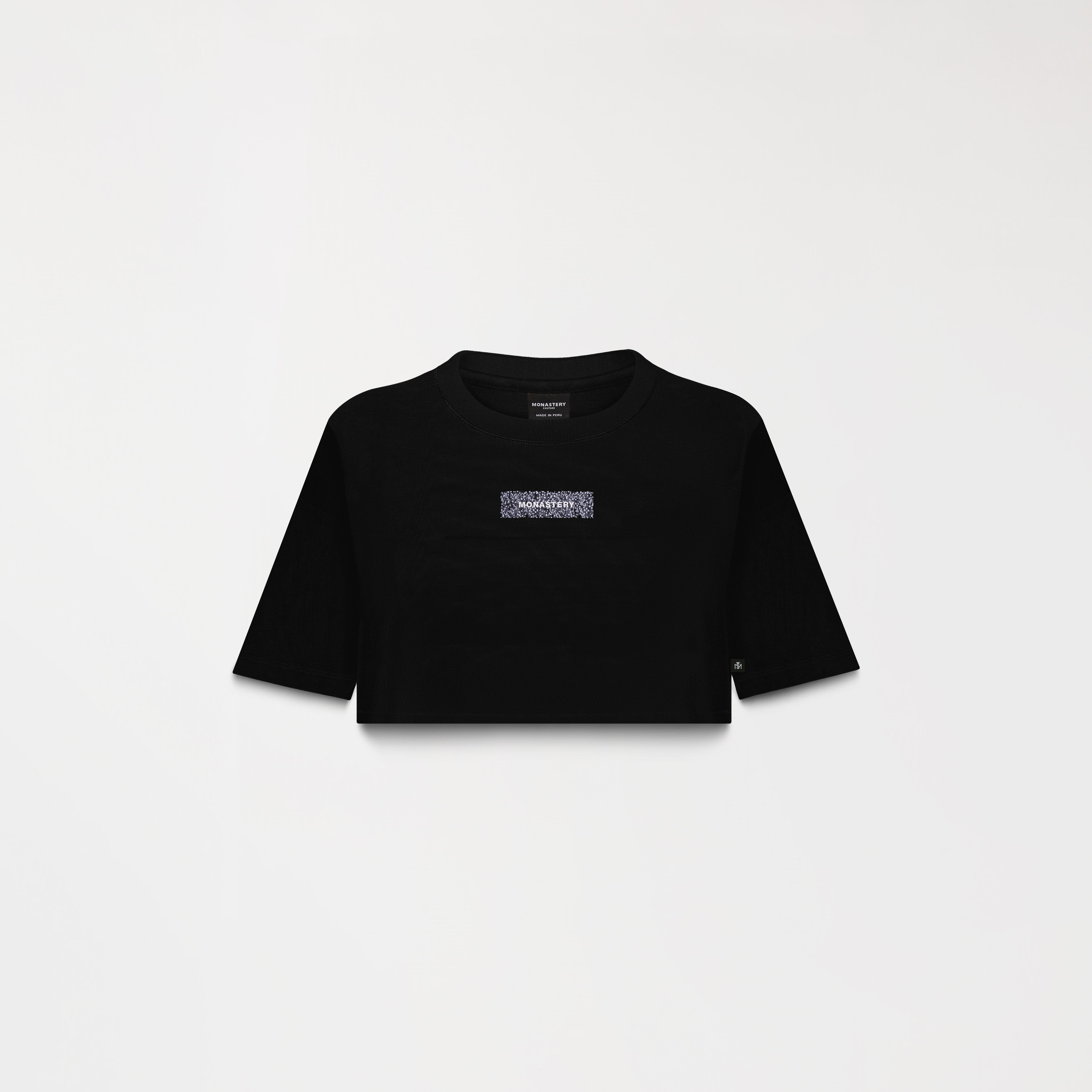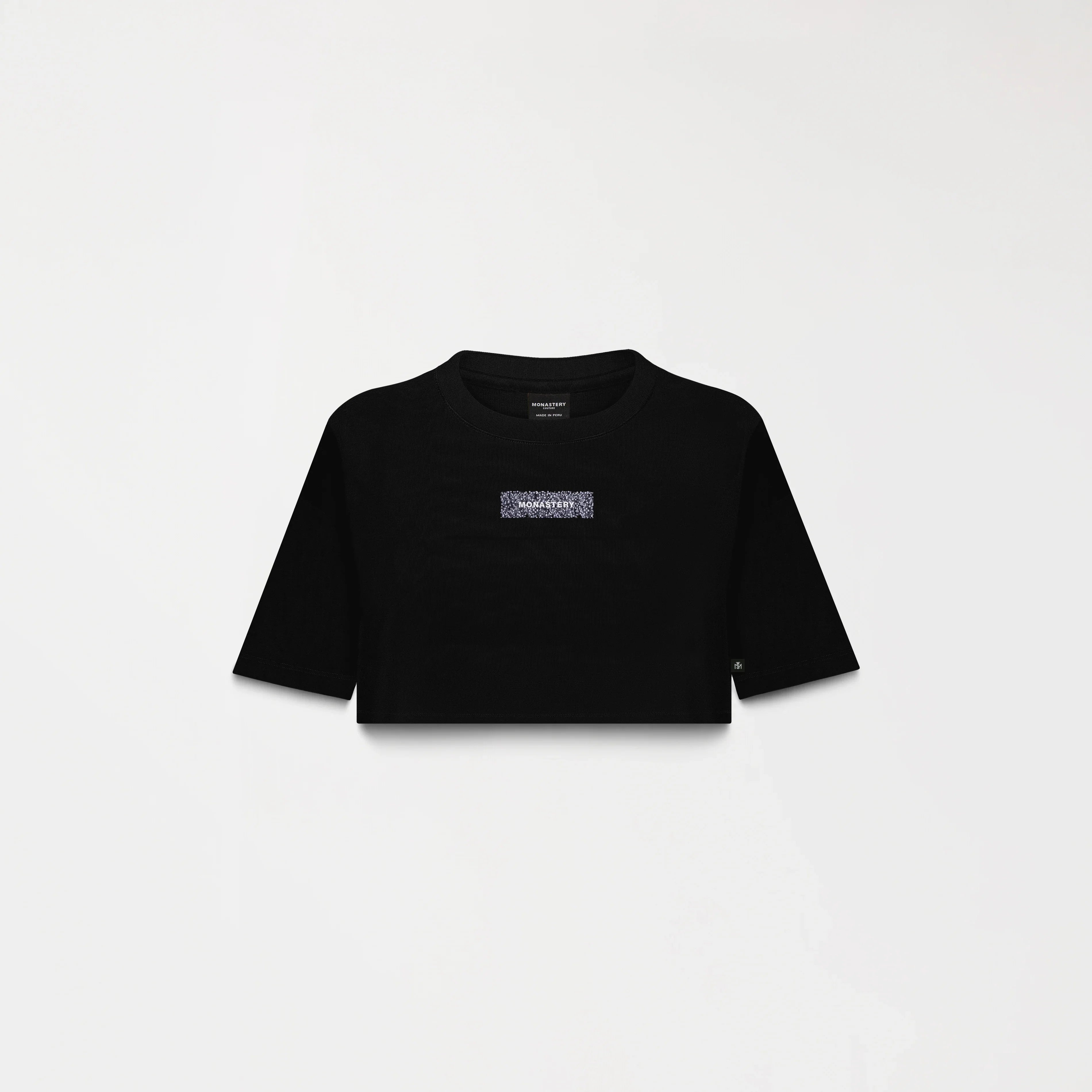Crop top para mujer en algodón peruano exclusivo para Monastery, elaborada en silueta pequeña, Este crop top destaca por su diseño minimalista y moderno con un toque sofisticado gracias a su estampado Glitter en el frente acompañado de nuestro logo iconico Monastery en alta densidad. La combinación de su corte pequeño y corto lo convierte en una prenda versátil y vanguardista, ideal para un look contemporáneo.