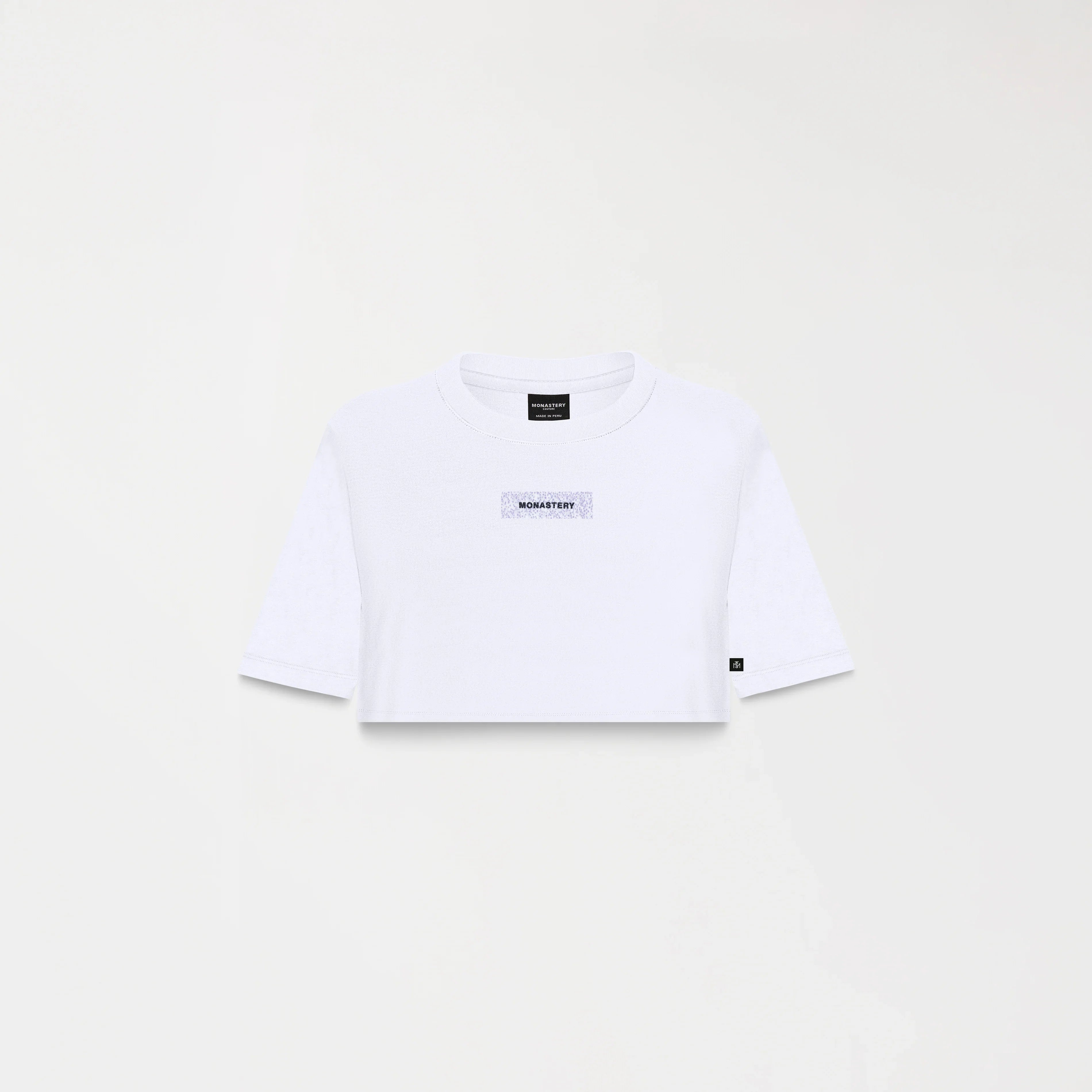 Crop top para mujer en algodón peruano exclusivo para Monastery, elaborada en silueta pequeña, Este crop top destaca por su diseño minimalista y moderno con un toque sofisticado gracias a su estampado Glitter en el frente acompañado de nuestro logo iconico Monastery en alta densidad. La combinación de su corte pequeño y corto lo convierte en una prenda versátil y vanguardista, ideal para un look contemporáneo.
