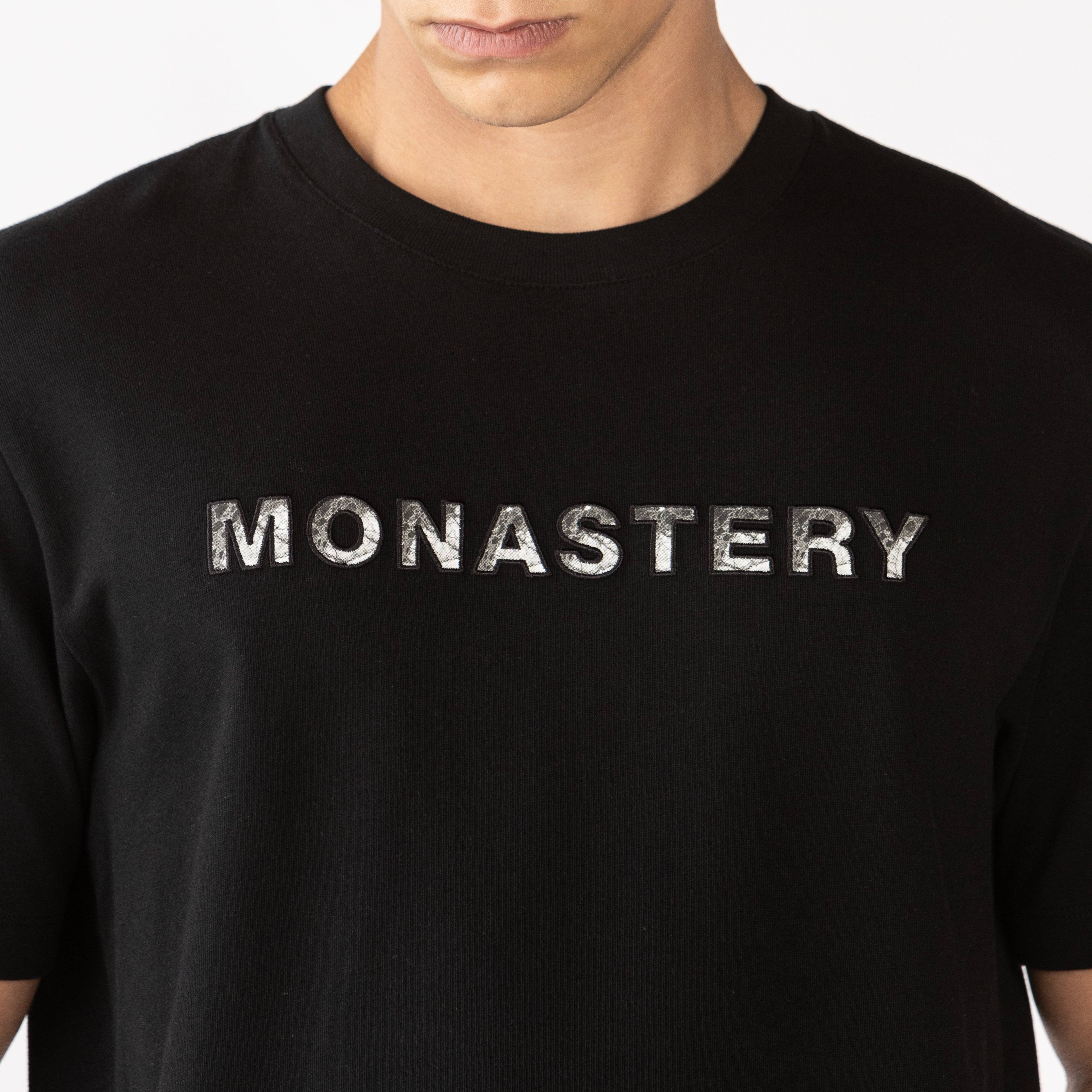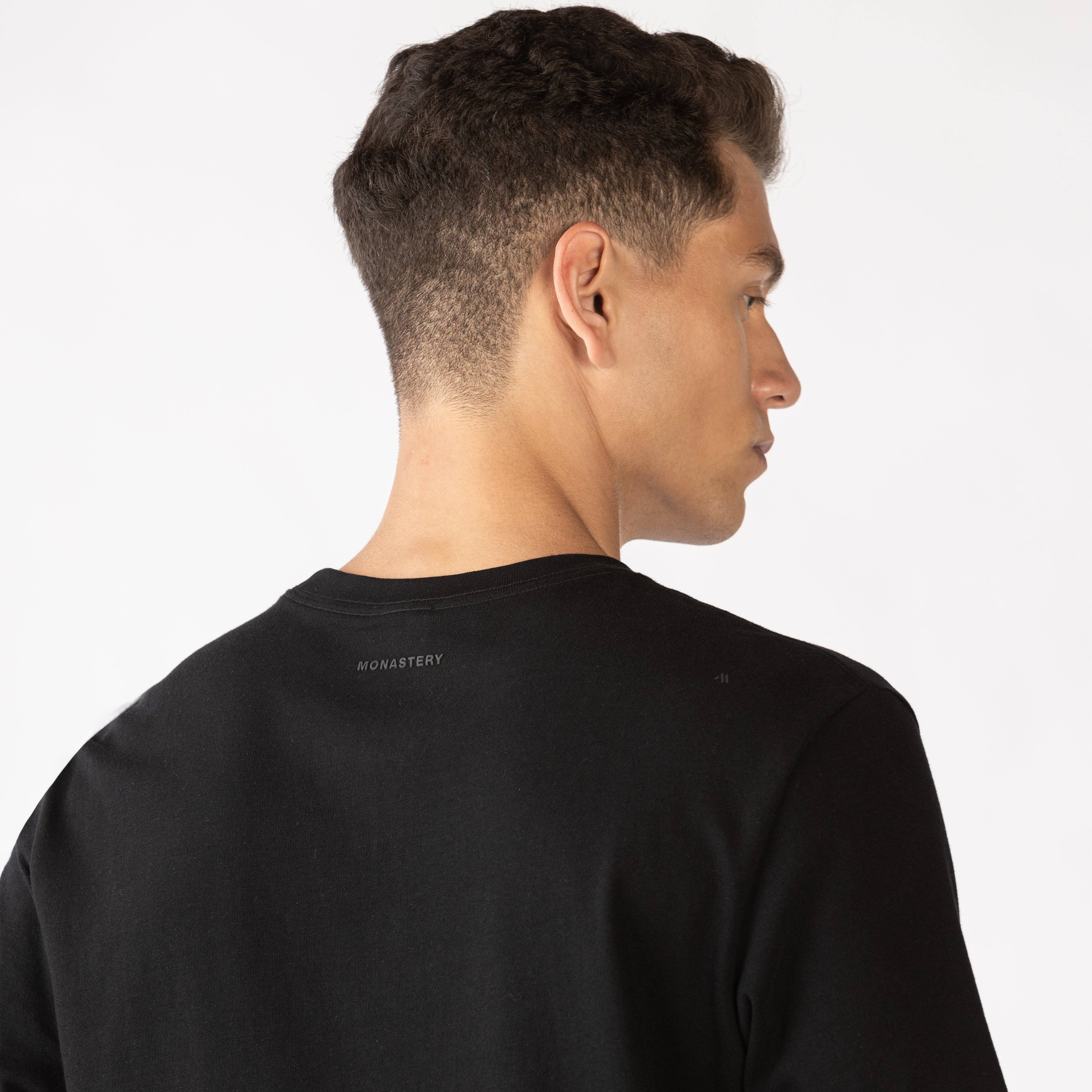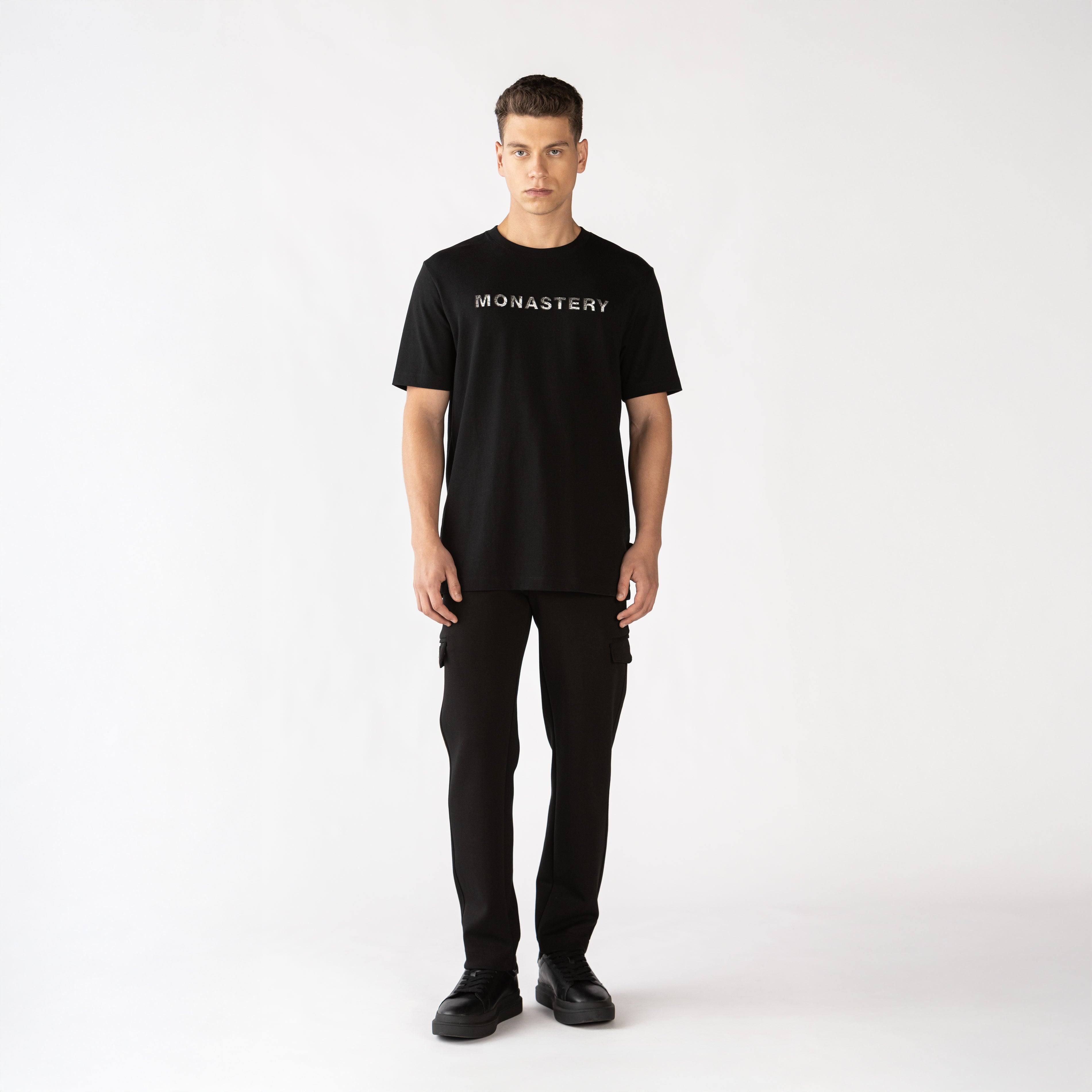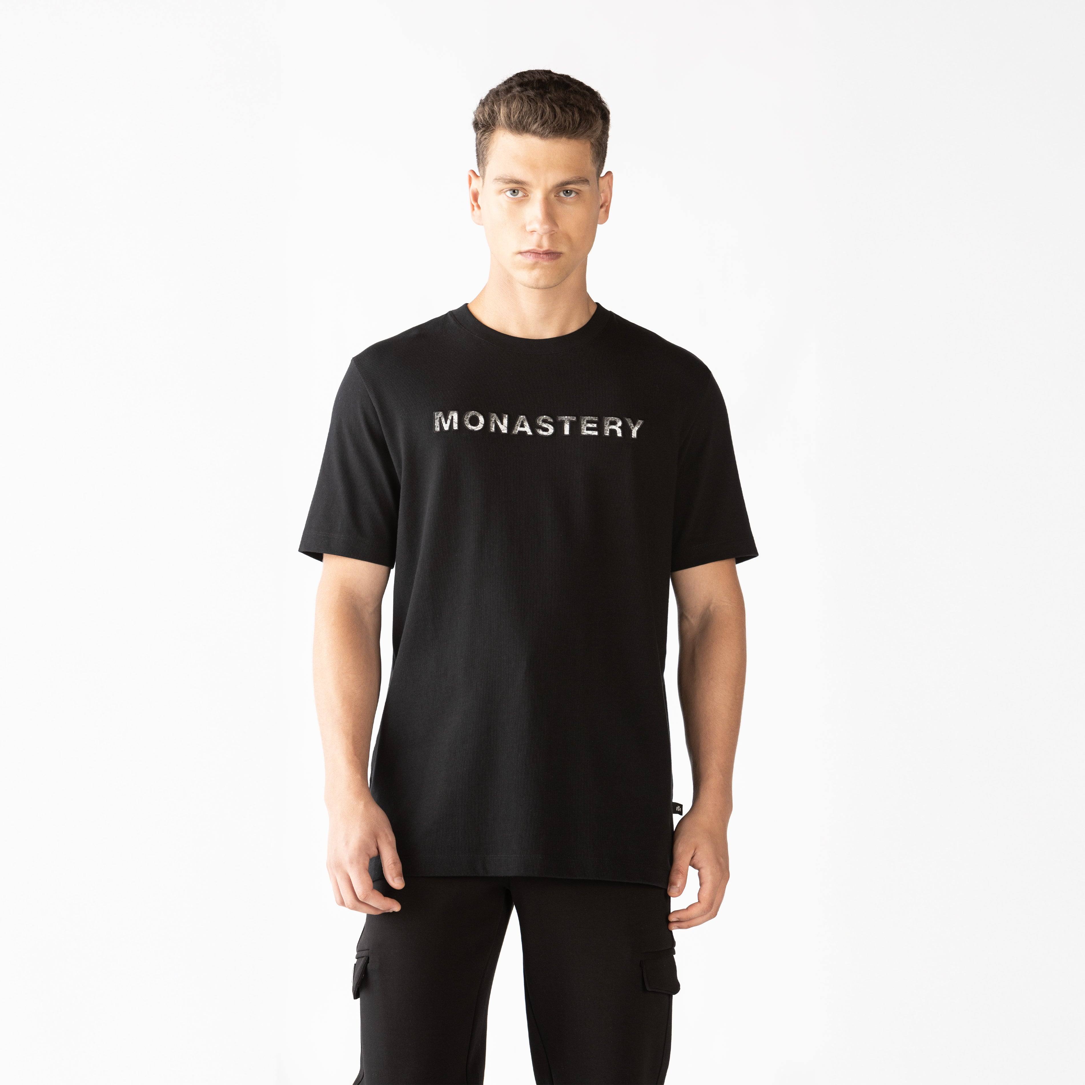 Camiseta negra para hombre confeccionada en silueta regular, confeccionada en algodón exclusivo para Monastery, esta camiseta combina estilo y comodidad. Presenta un arte estampado plano con outline bordado en el frente, creando un contraste atractivo y moderno. Además, las artes insignia en alta densidad en la parte posterior añaden un toque distintivo y elegante. Perfecta para un look contemporáneo y sofisticado.
