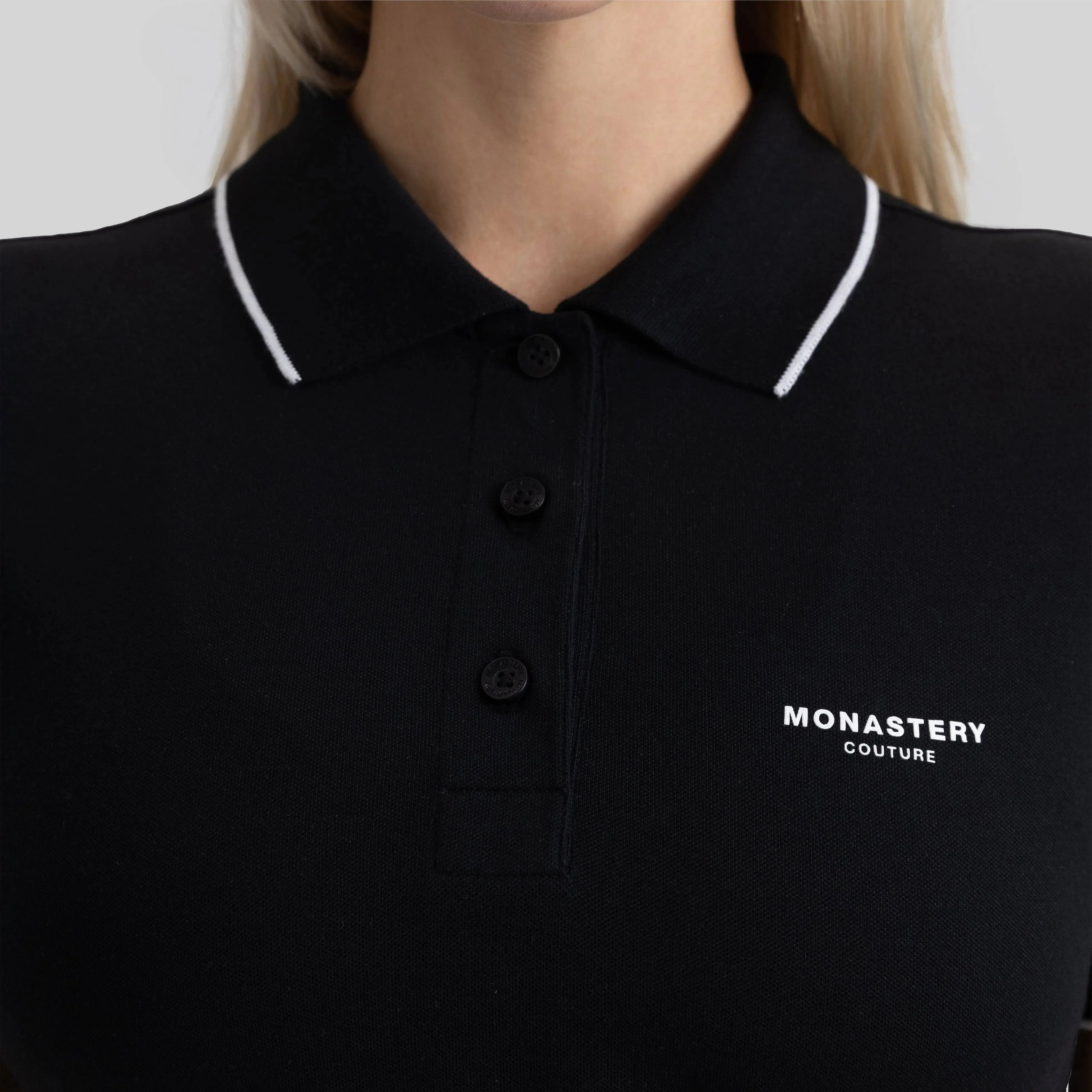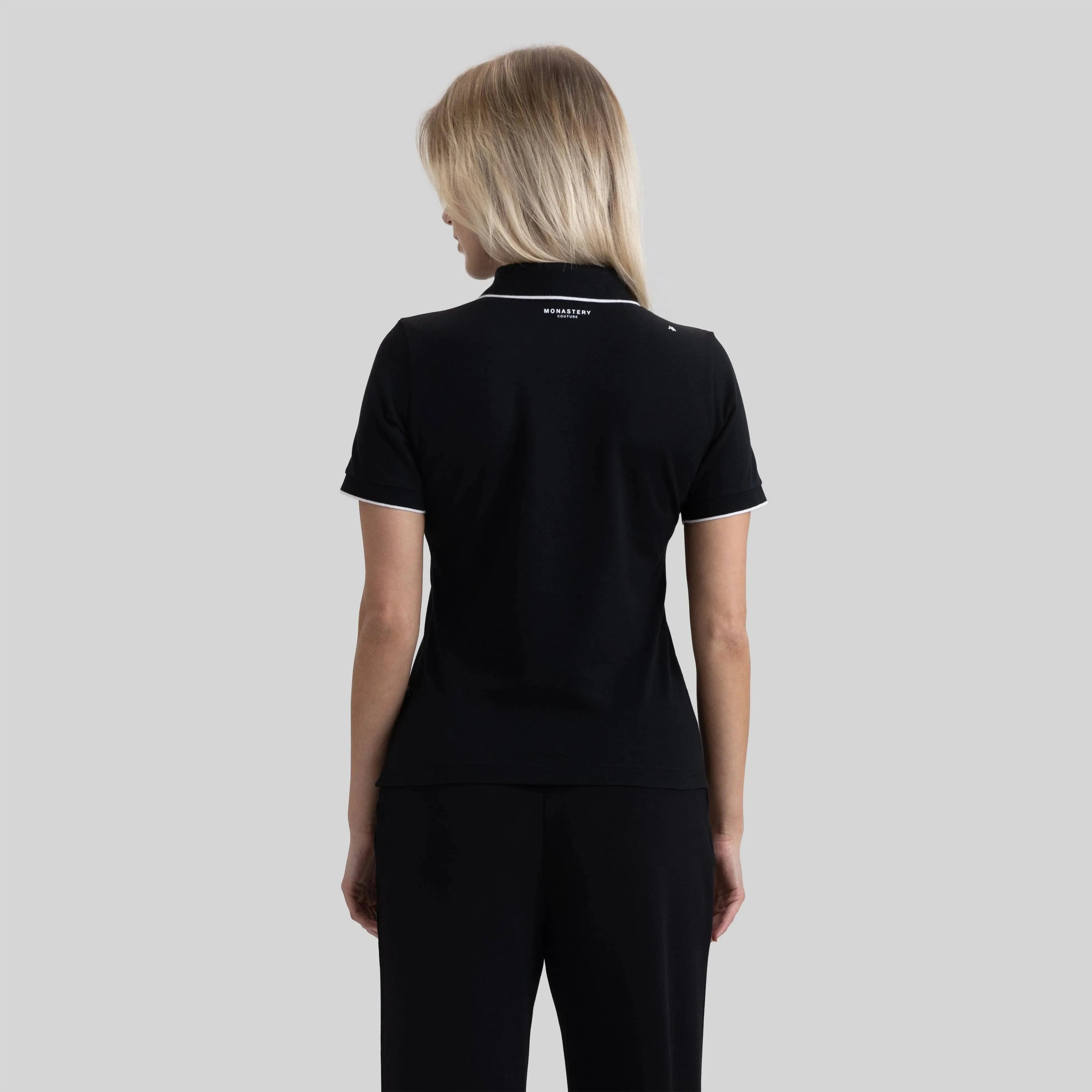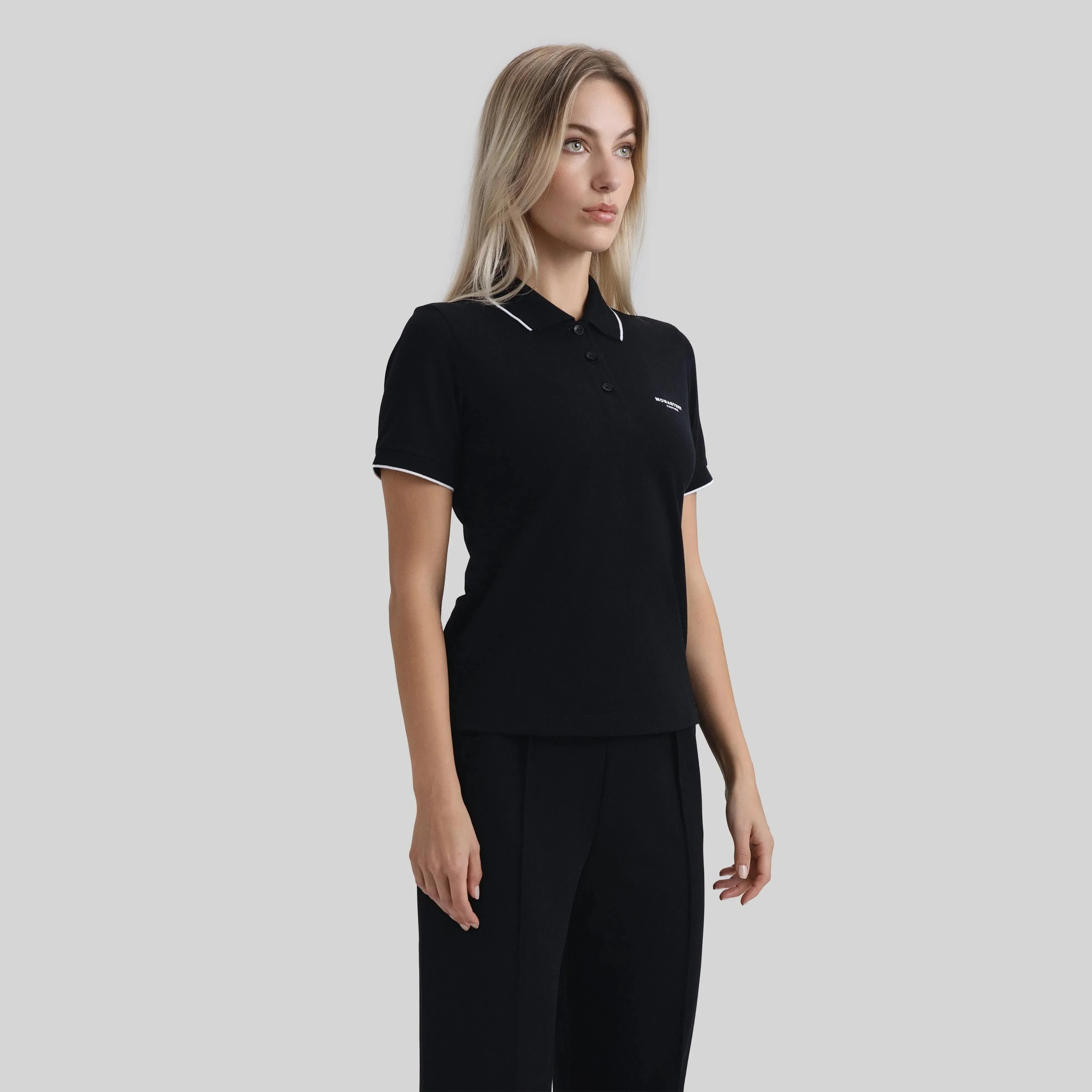 Esta camiseta polo femenina, de silueta ajustada, está elaborada en algodón Pima Peruano exclusivo para la marca y elastano para ofrecer mayor comodidad. Matra es una referencia fresca con una silueta renovada, que incluye cuellos y puños en tejido rectilíneo con franjas en contraste dentro del mismo tejido, diseñados especialmente para cada modelo. Presenta botonadura recta y estampados del logo Monastery en el punto del corazón y en la espalda. Esta prenda combina elegancia y dinamismo, siendo ideal para lucir en cualquier ocasión.
