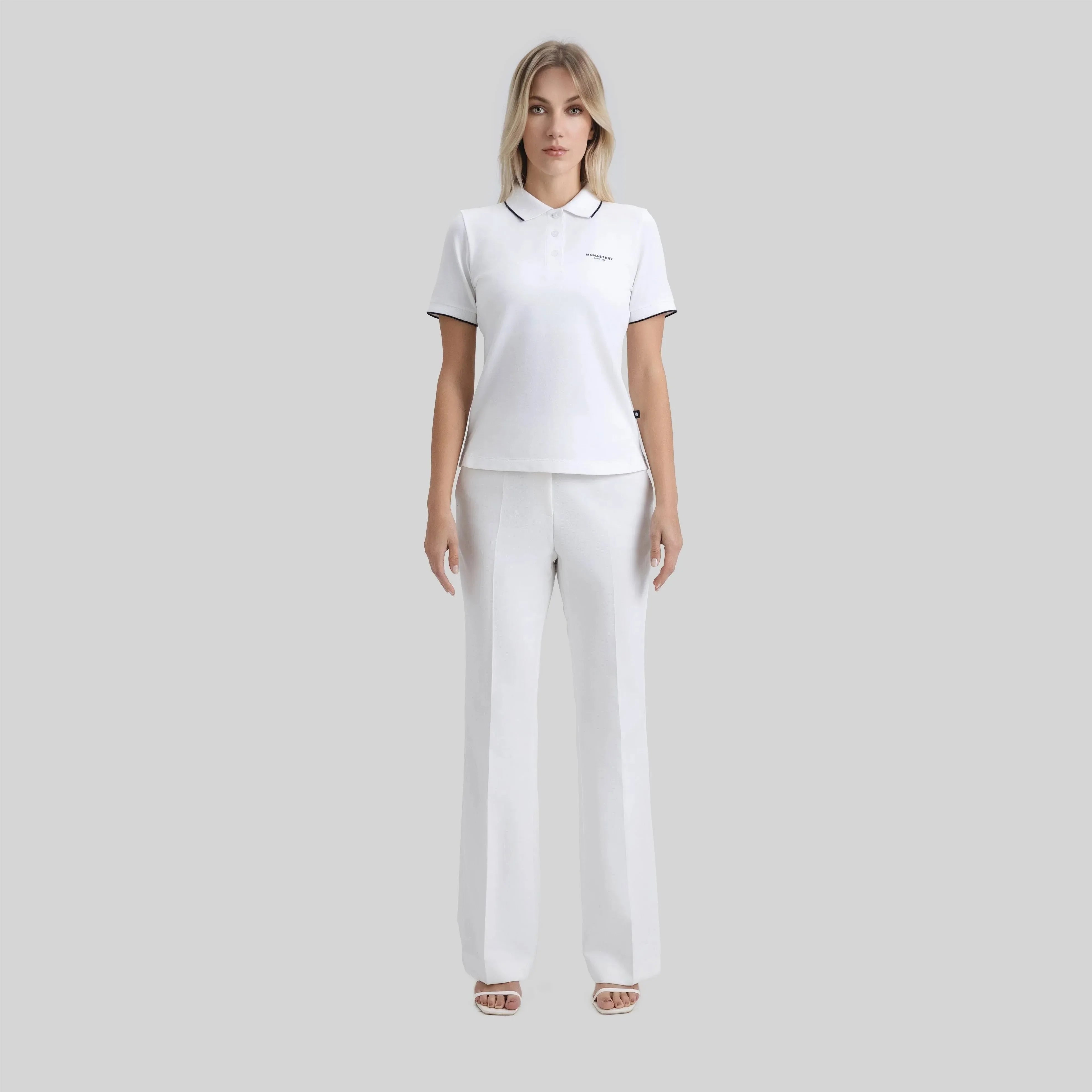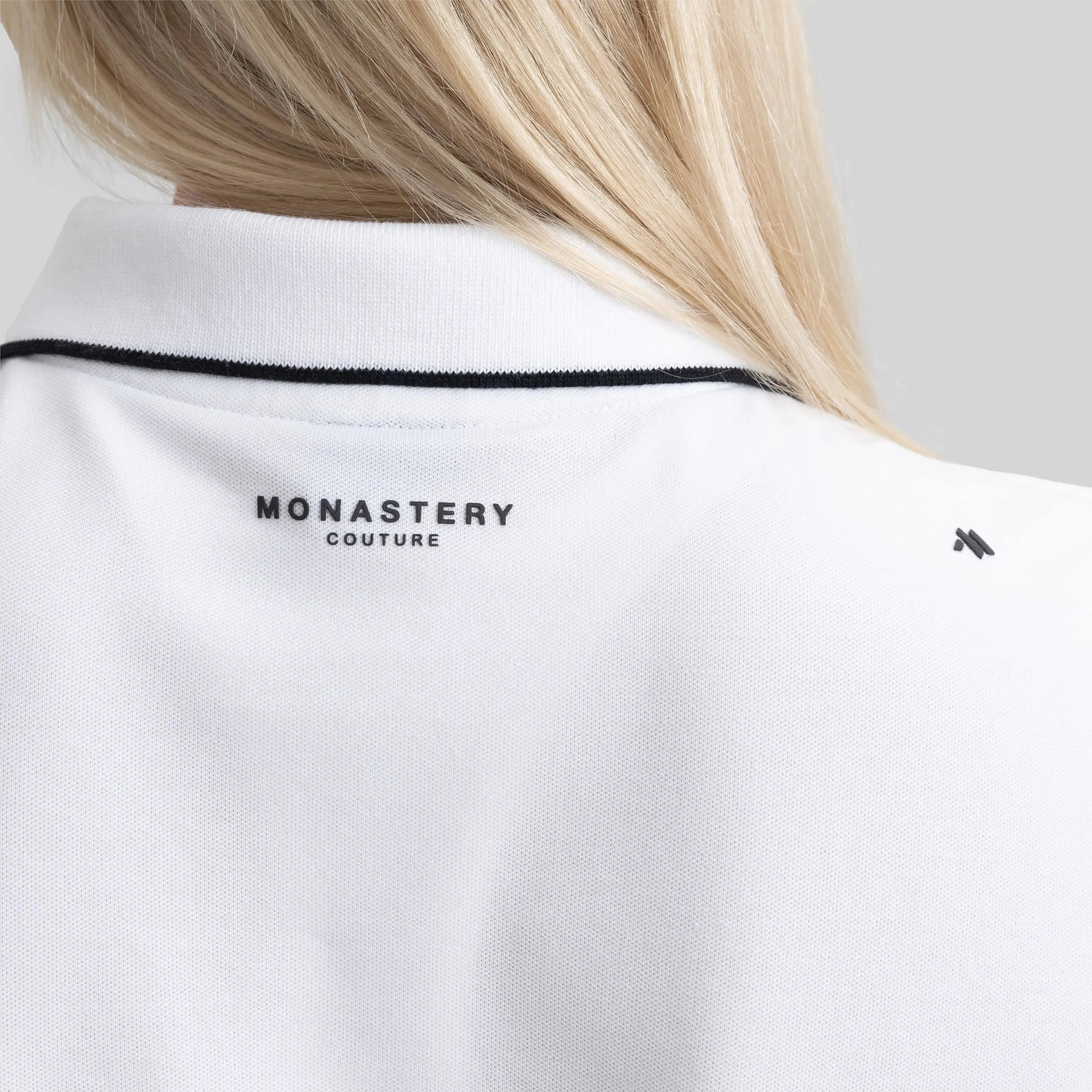 Esta camiseta polo femenina, de silueta ajustada, está elaborada en algodón Pima Peruano exclusivo para la marca y elastano para ofrecer mayor comodidad. Matra es una referencia fresca con una silueta renovada, que incluye cuellos y puños en tejido rectilíneo con franjas en contraste dentro del mismo tejido, diseñados especialmente para cada modelo. Presenta botonadura recta y estampados del logo Monastery en el punto del corazón y en la espalda. Esta prenda combina elegancia y dinamismo, siendo ideal para lucir en cualquier ocasión.