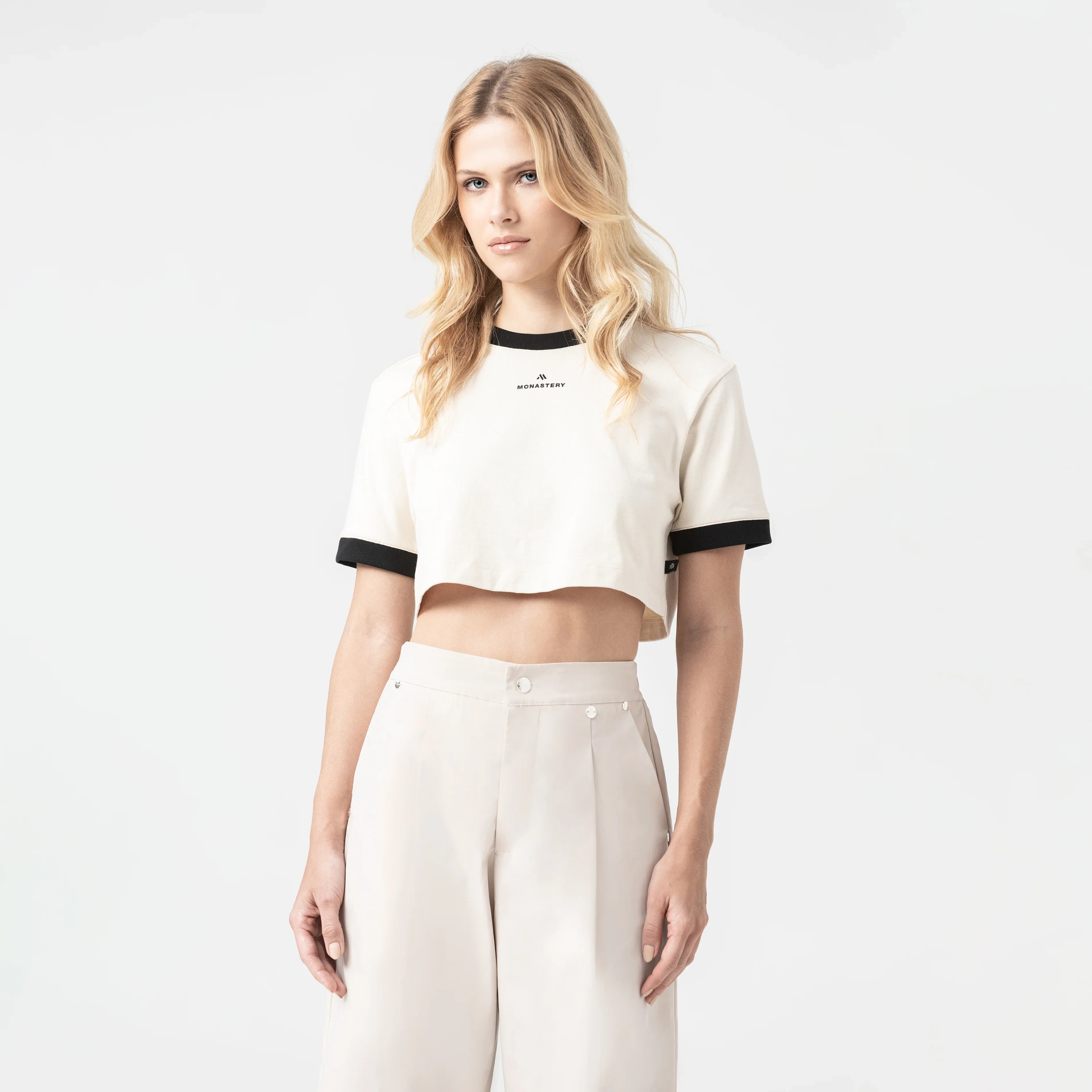 Crop top para mujer en algodón peruano exclusivo para Monastery, elaborada en silueta pequeña, Senn cuenta con logo Monastery e insignia en tecnica plastisol + trasnfer brillante. Esta referencia cuenta con detalles en tono contraste que le dan un toque distintivo y moderno, este crop top es ideal para quienes buscan un look cómodo y sofisticado gracias a su gran base textil.