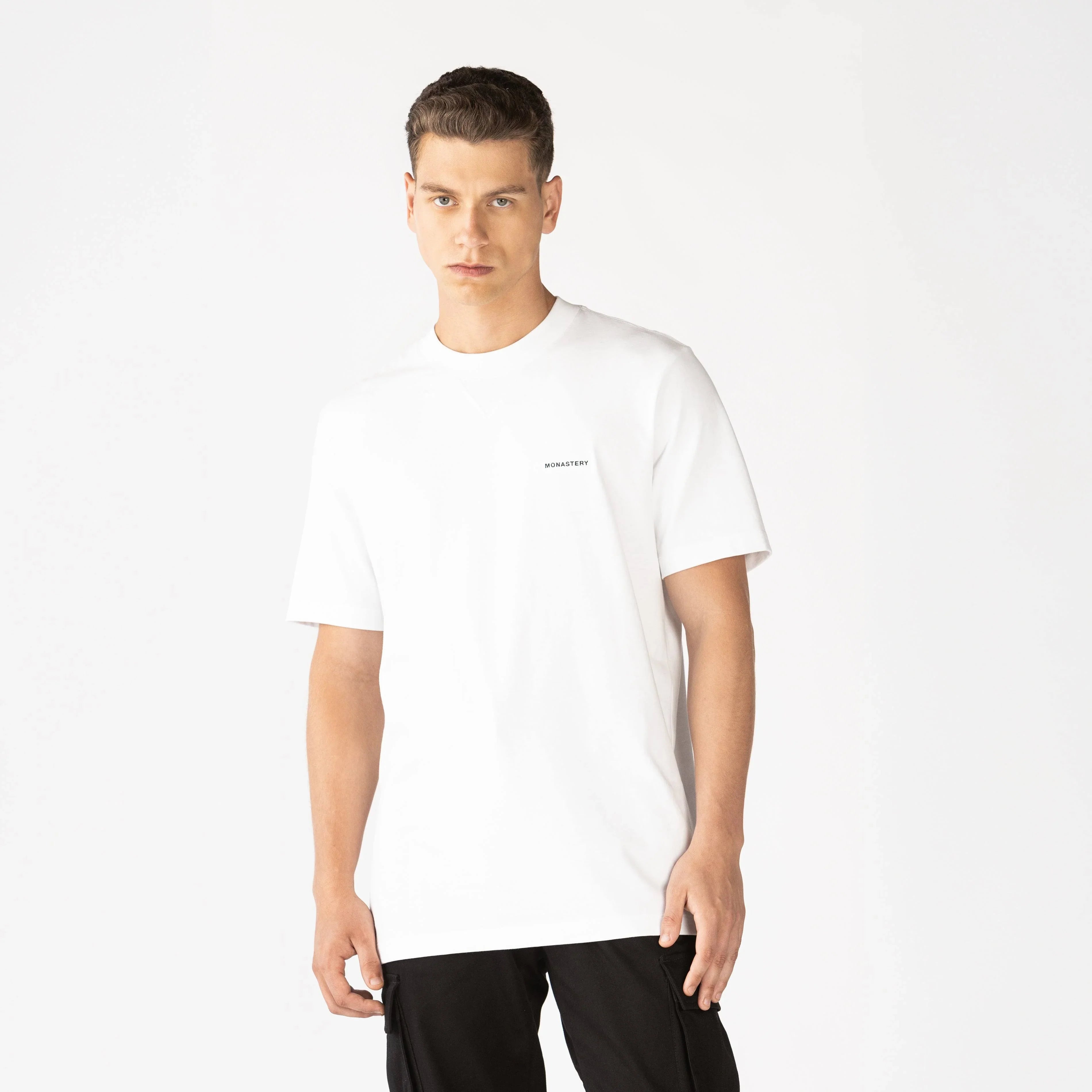 Esta camiseta masculina Stirling blanca, confeccionada en algodón Monastery de alta calidad, combina comodidad y estilo. Presenta un cuello rib de 3 cm y un corte triangular en la parte inferior, aportando un toque moderno y estilizado. En el frente, un bordado plano en el punto corazón añade elegancia, mientras que la parte posterior resalta con artes insignia en alta densidad, garantizando un acabado distintivo y duradero. Ideal para quienes desean una prenda única y confortable, esta camiseta se adapta fácilmente a cualquier look casual.
