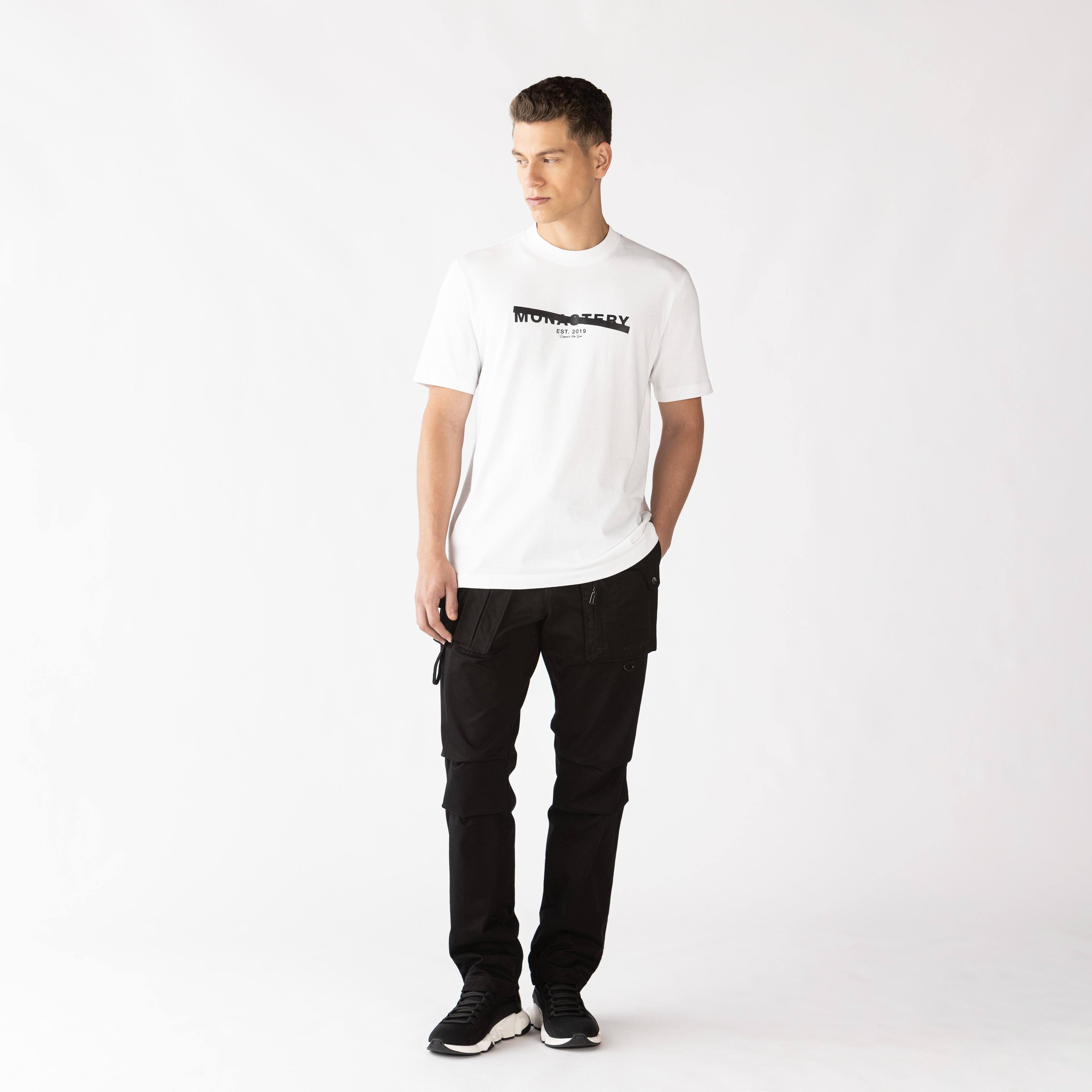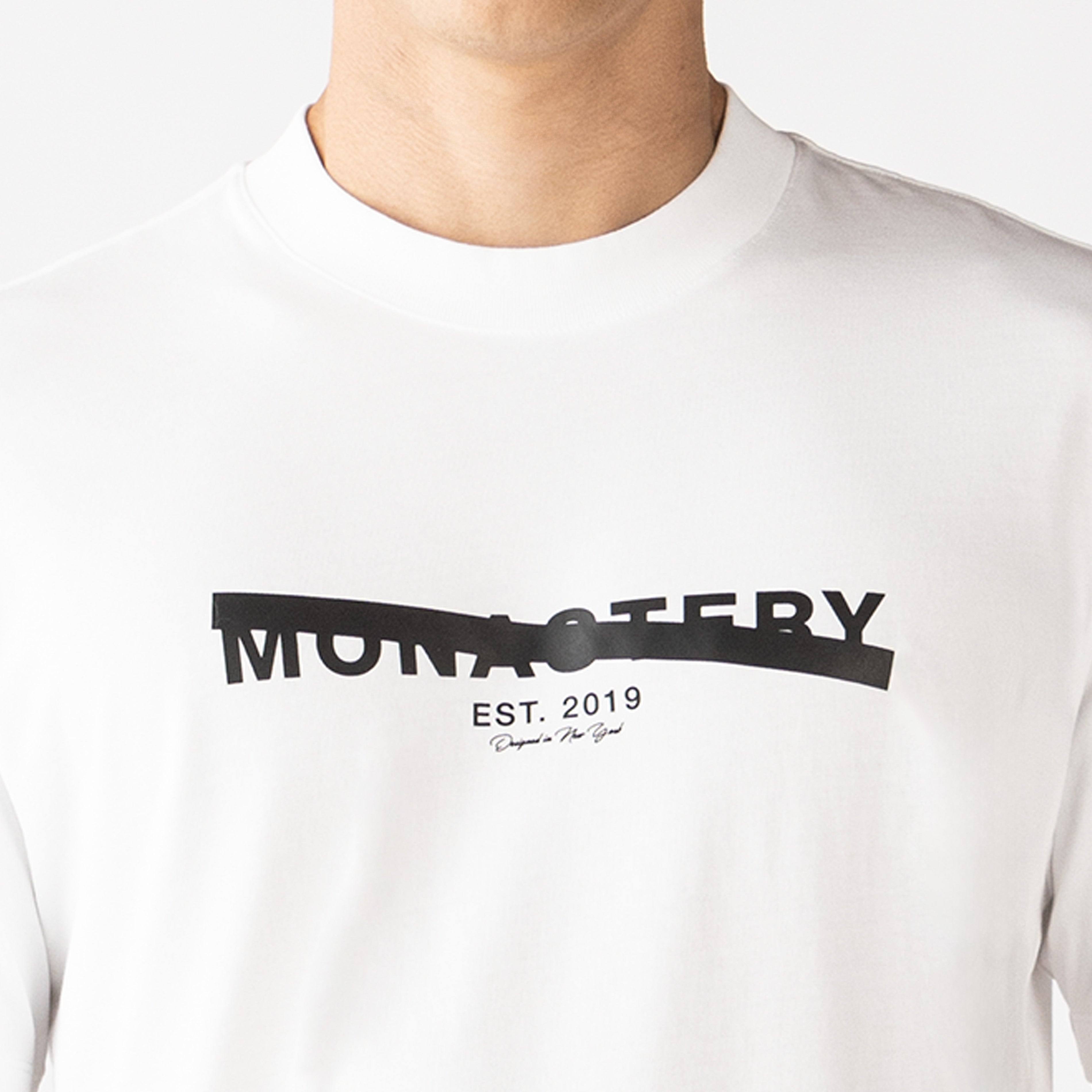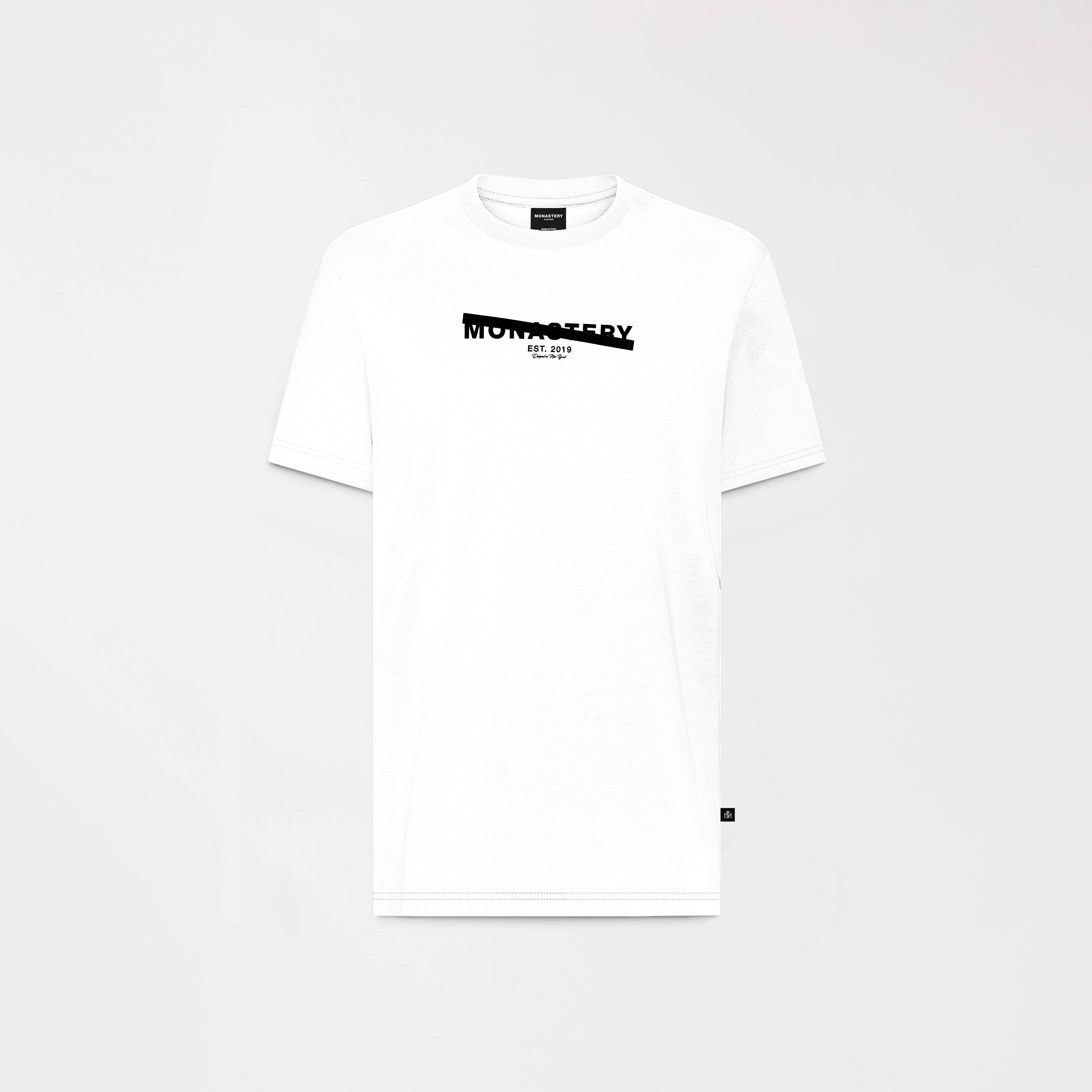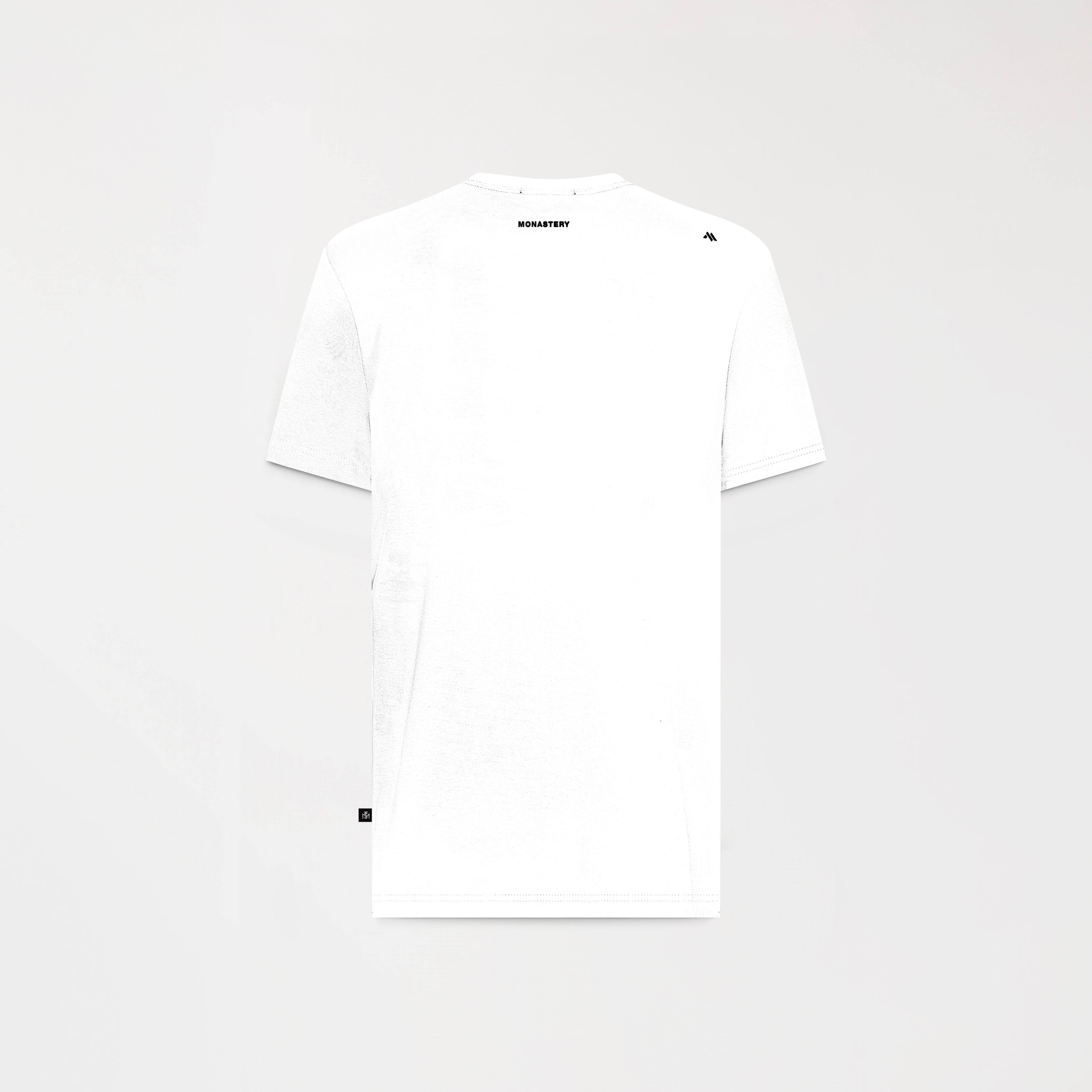 Camiseta para hombre blanca con silueta regular, confeccionada en algodón exclusivo para Monastery, esta camiseta combina estilo y comodidad. Presenta un arte estampado plastisol con transfer matte ligeramente tachado en el frente, creando un contraste atractivo y moderno. Además, las artes insignia en estampado plano en la parte posterior añaden un toque distintivo y elegante. la camiseta Three es perfecta para quienes buscan una prenda sobria con un toque distintivo y sofisticado.