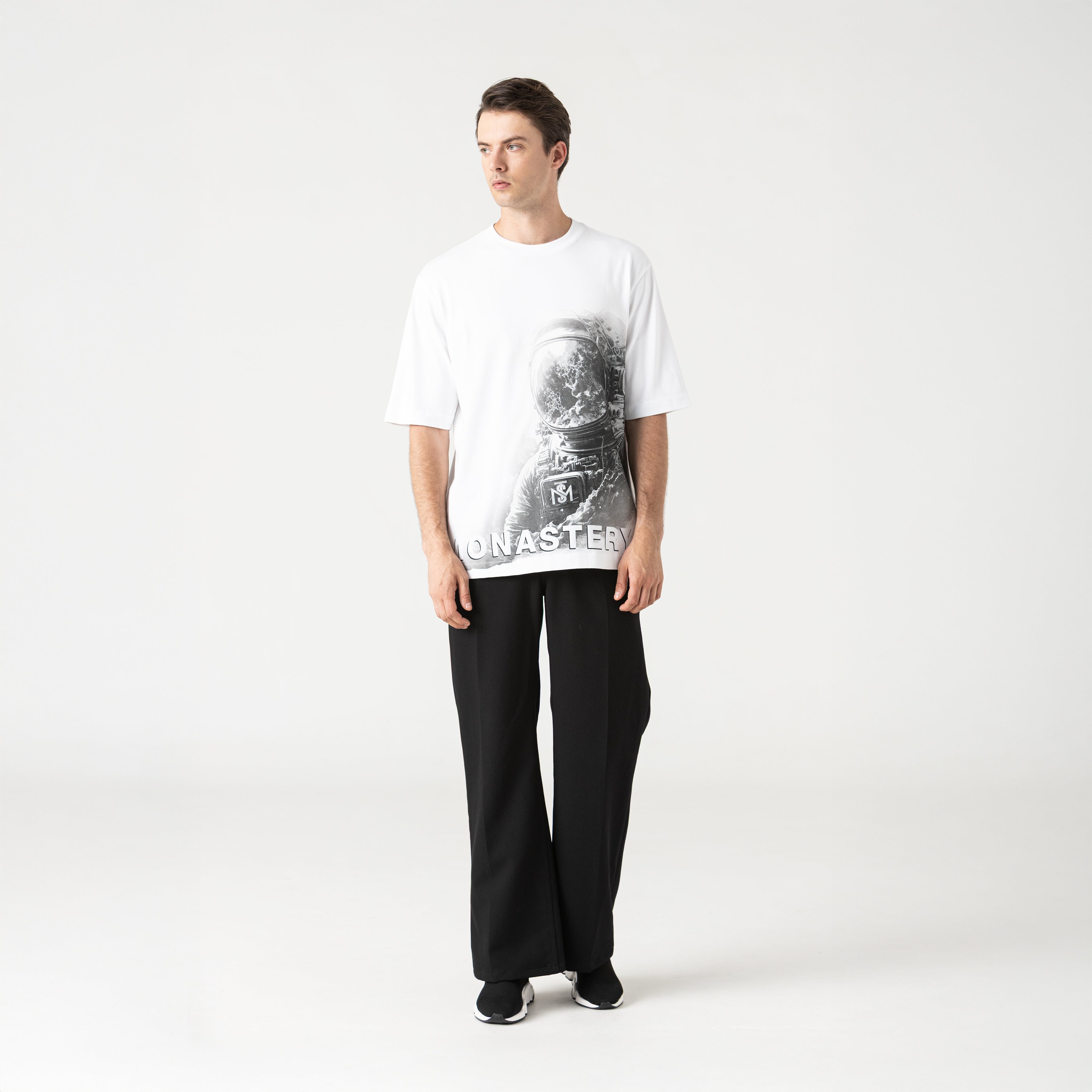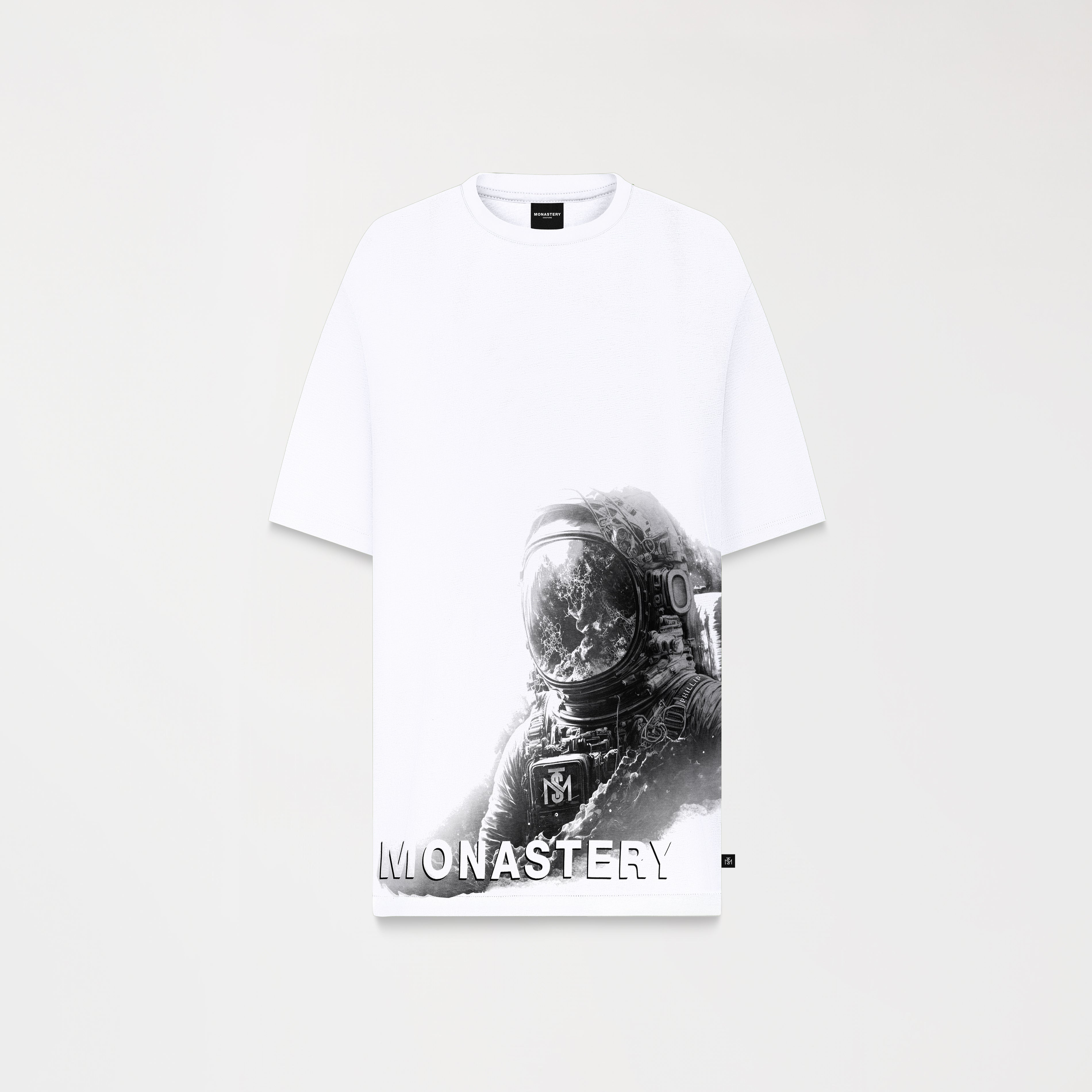 Camiseta oversized para hombre, elaborada en 100% algodón exclusivo para Monastery. En frente presenta nuestro icónico astronauta Phillip en técnica de tramas y en espalda los logos insignia en alta densidad. Venture es un básico oversize perfecto para ser combinado con tu armario.
